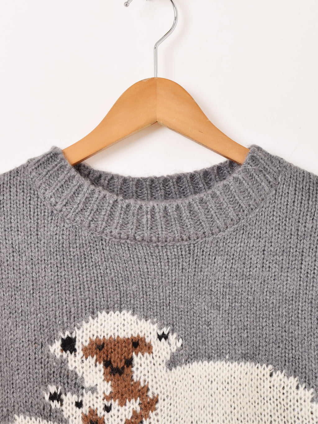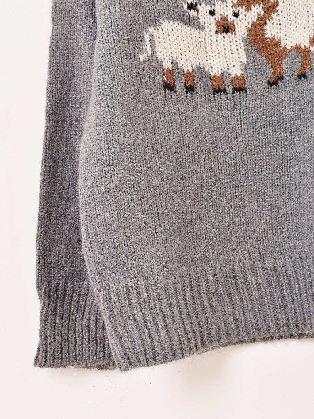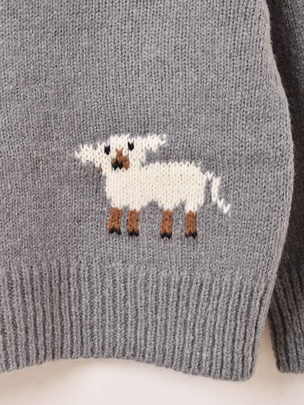 シュールな雰囲気の羊の親子がデザインされたセーター。1枚着るだけでもキュートでアクセントに。厚みのあるニット生地で仕立てた、季節感のある一着です。