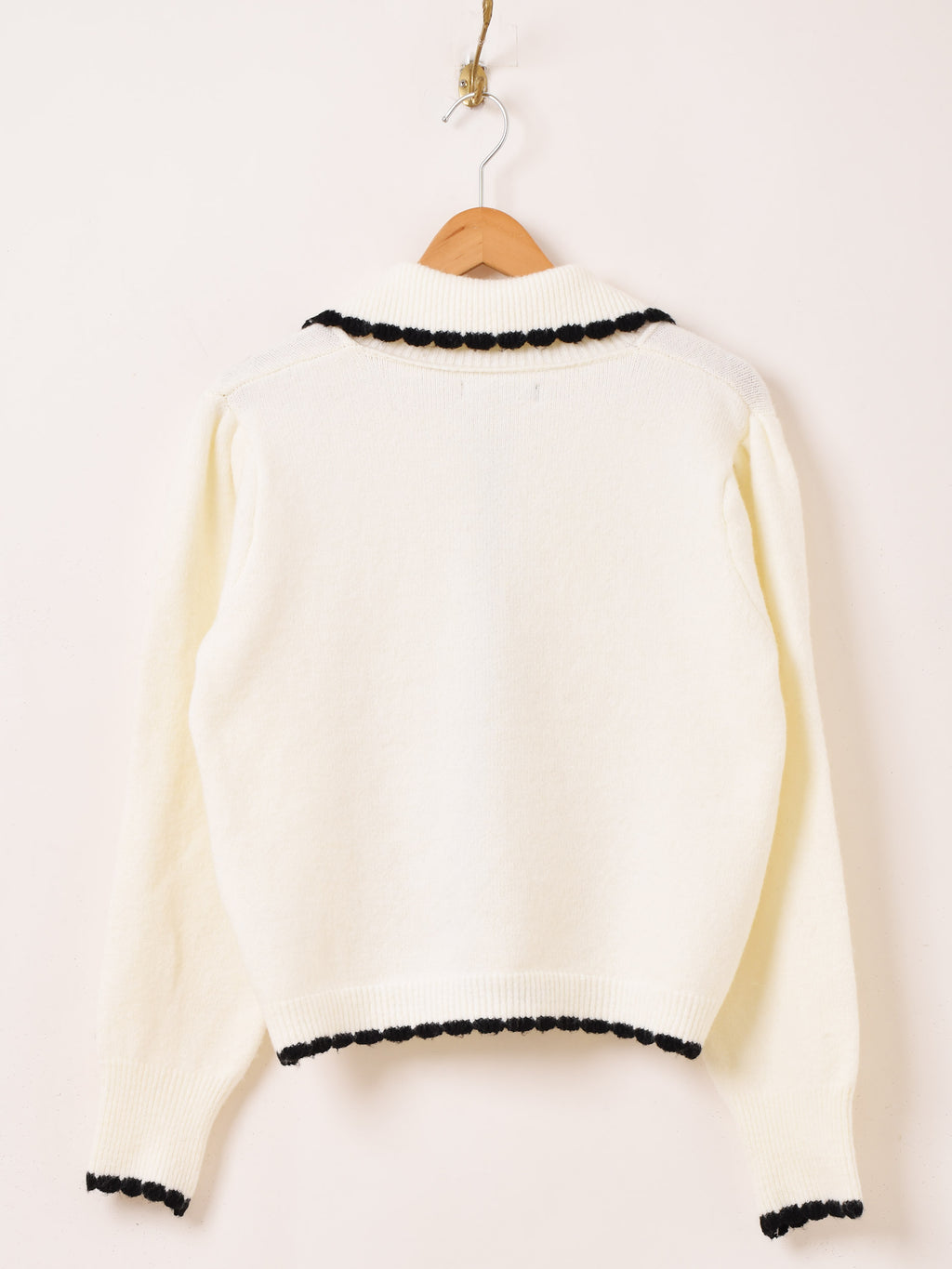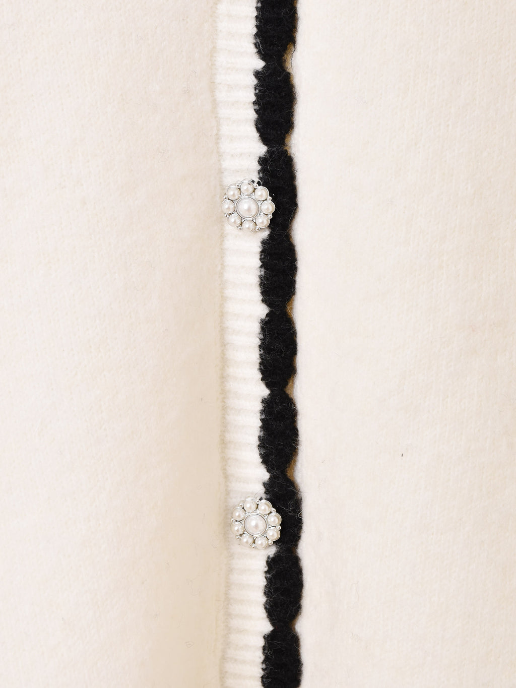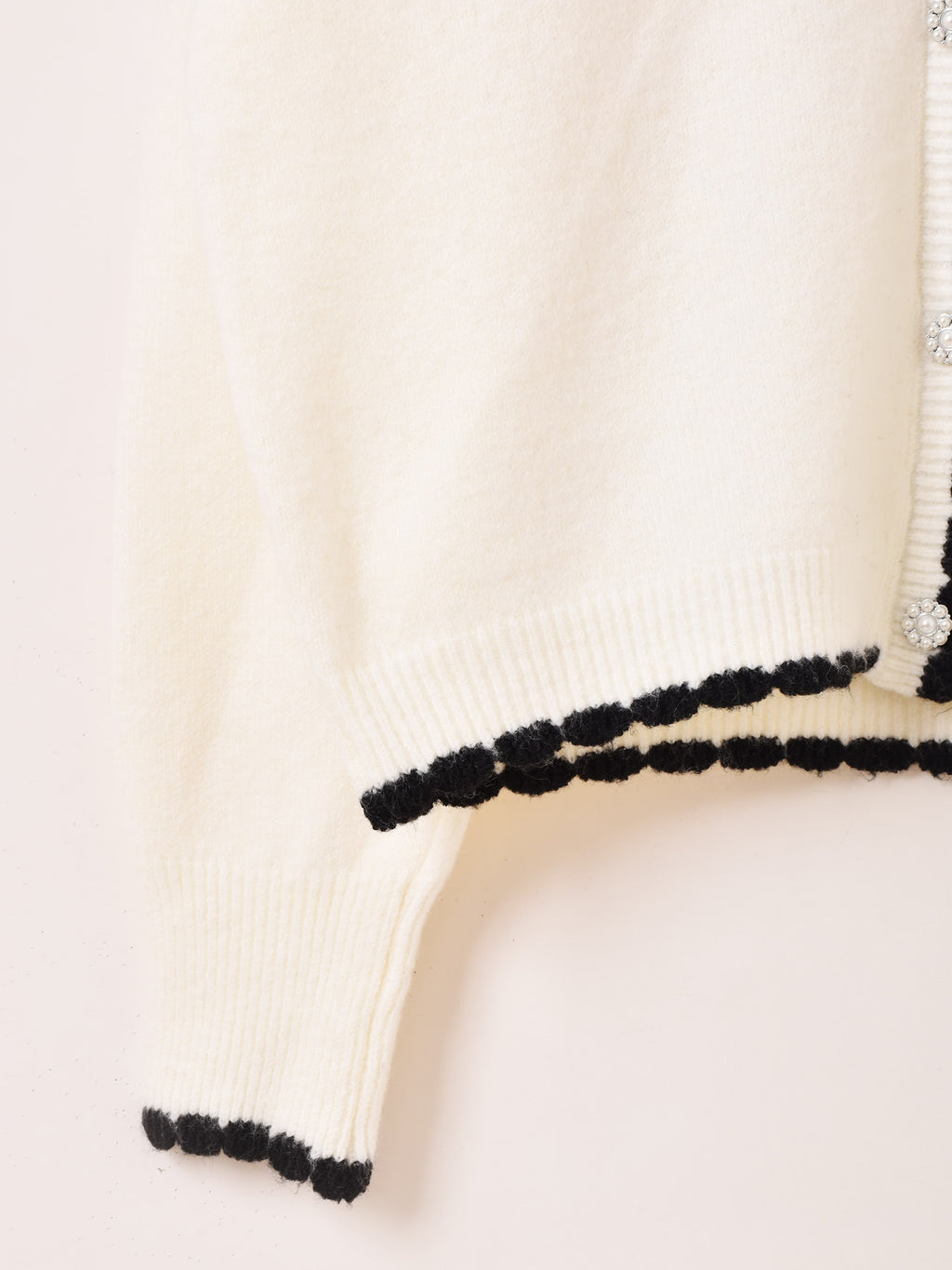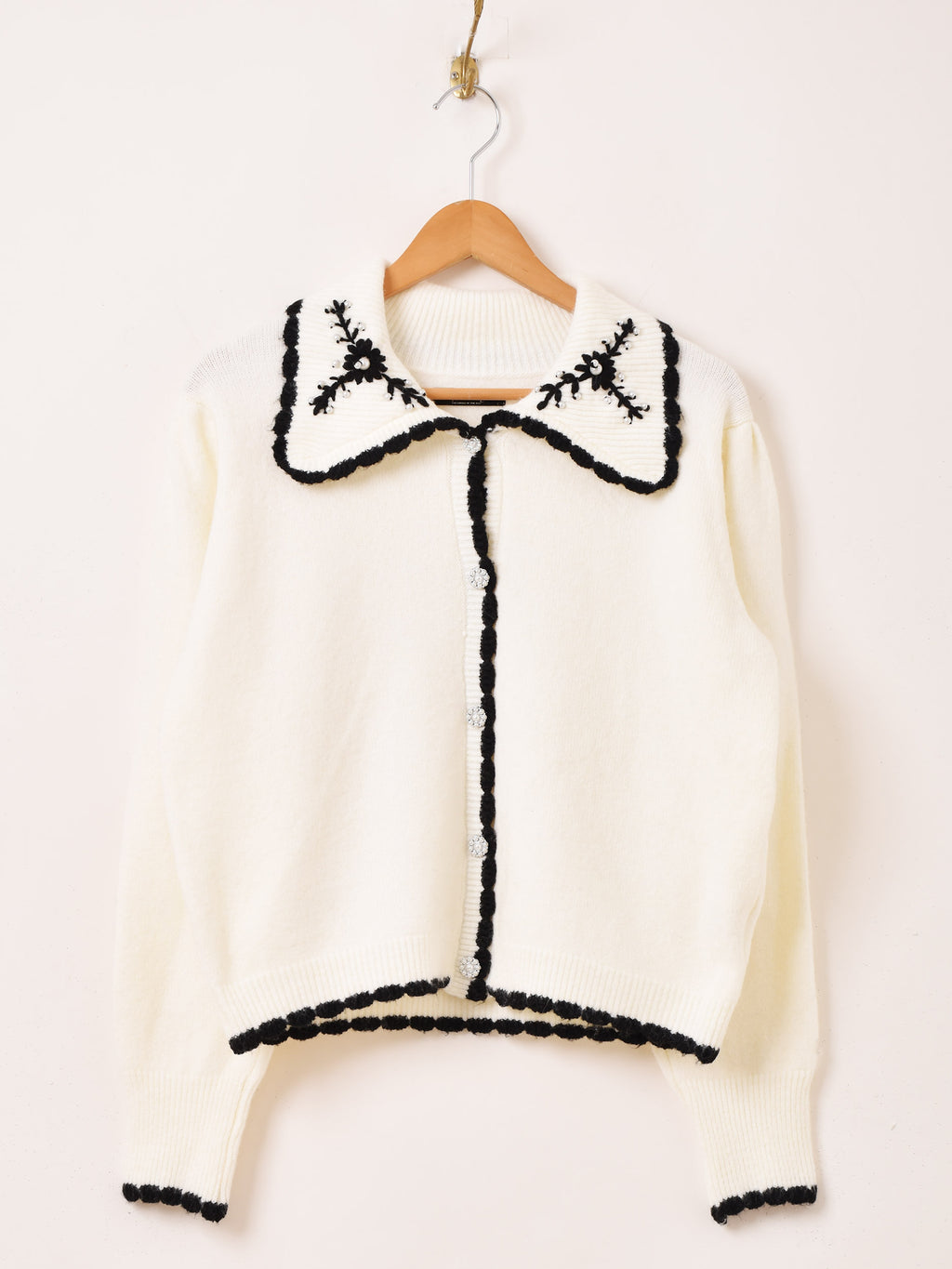 襟にパールビーズと刺繍をあしらい、レトロチックなデザインが可愛いカーディガン。モノトーンカラーでアイテムを選ばず、スカートにもパンツスタイルにも合わせられる一着です。柔らかな肌触りのニット生地で仕立てています。