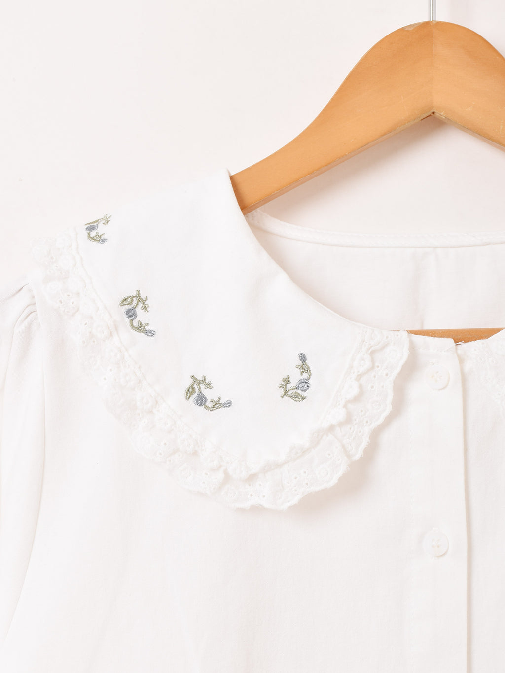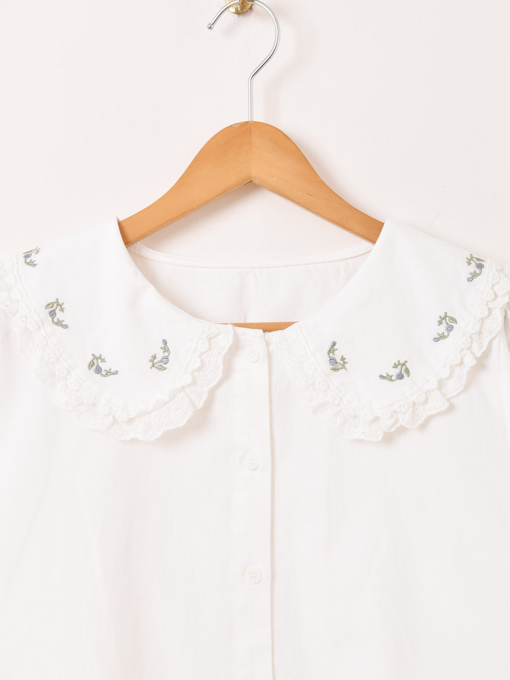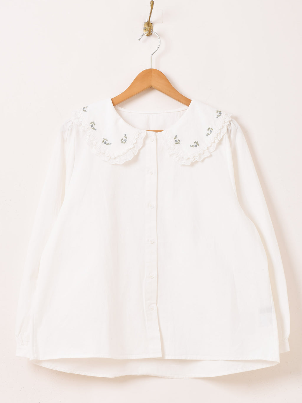 大きな丸い襟に刺繍をあしらった、ガーリーな雰囲気たっぷりのブラウス。一枚着るだけで華やかなスタイルに仕上がります。