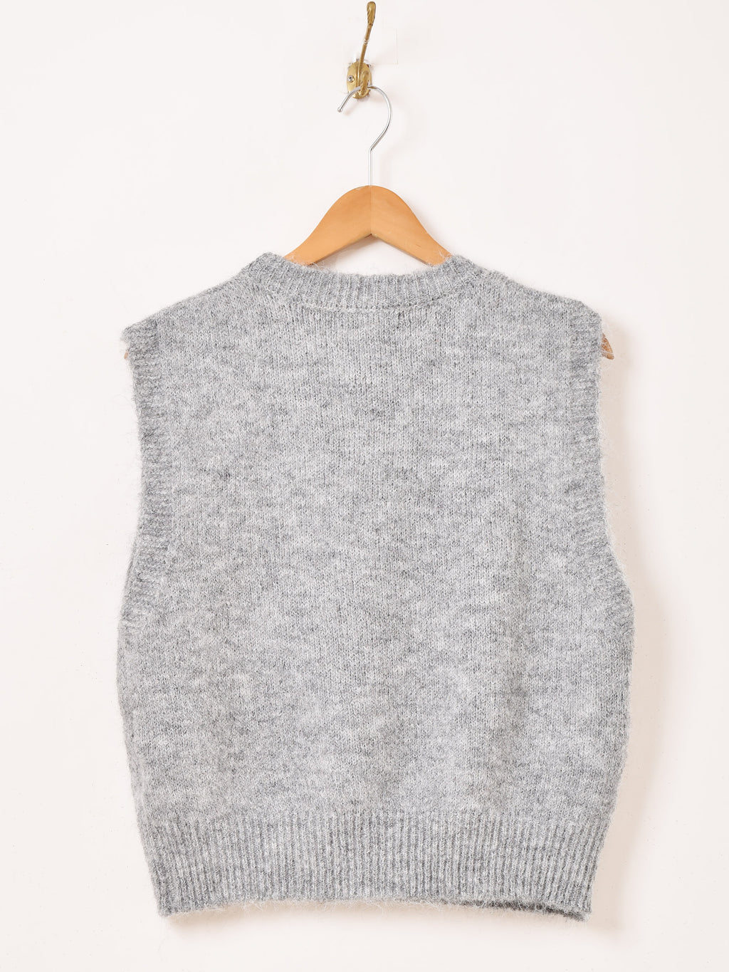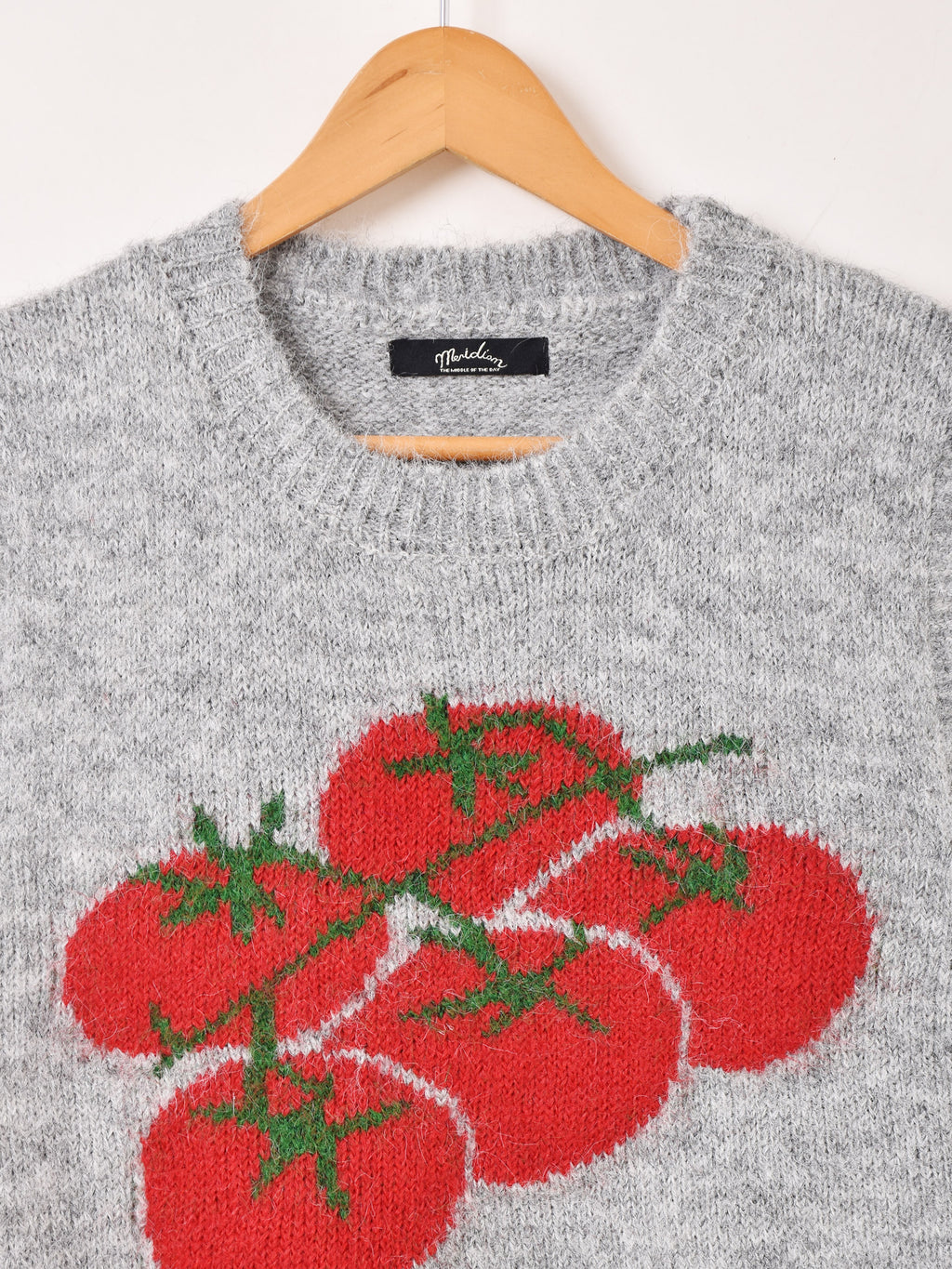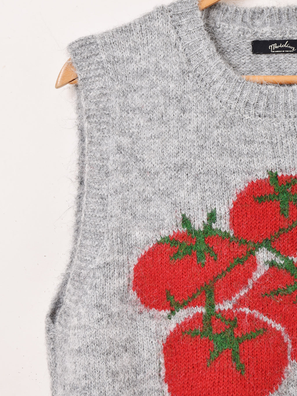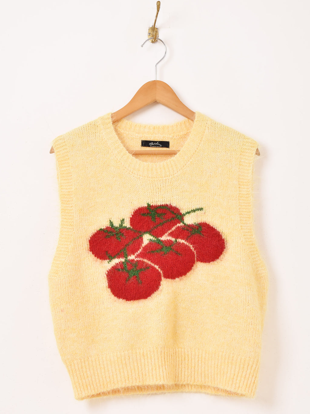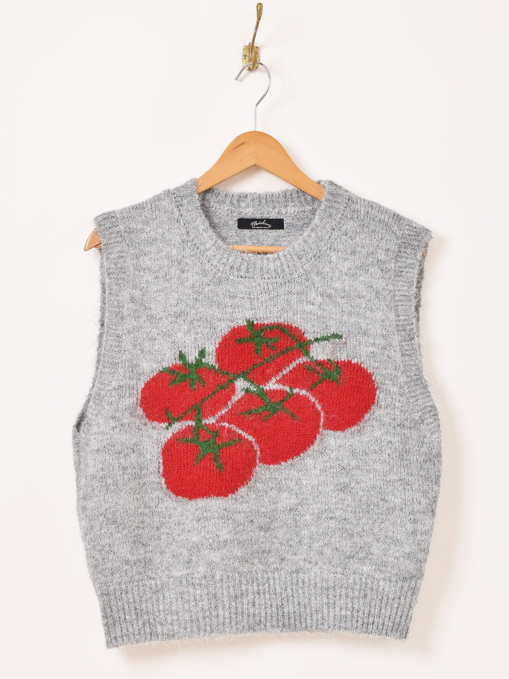 トマトのモチーフが目を惹くニットベスト。程よくブラッシュドした、柔らかなニット生地で仕立てています。