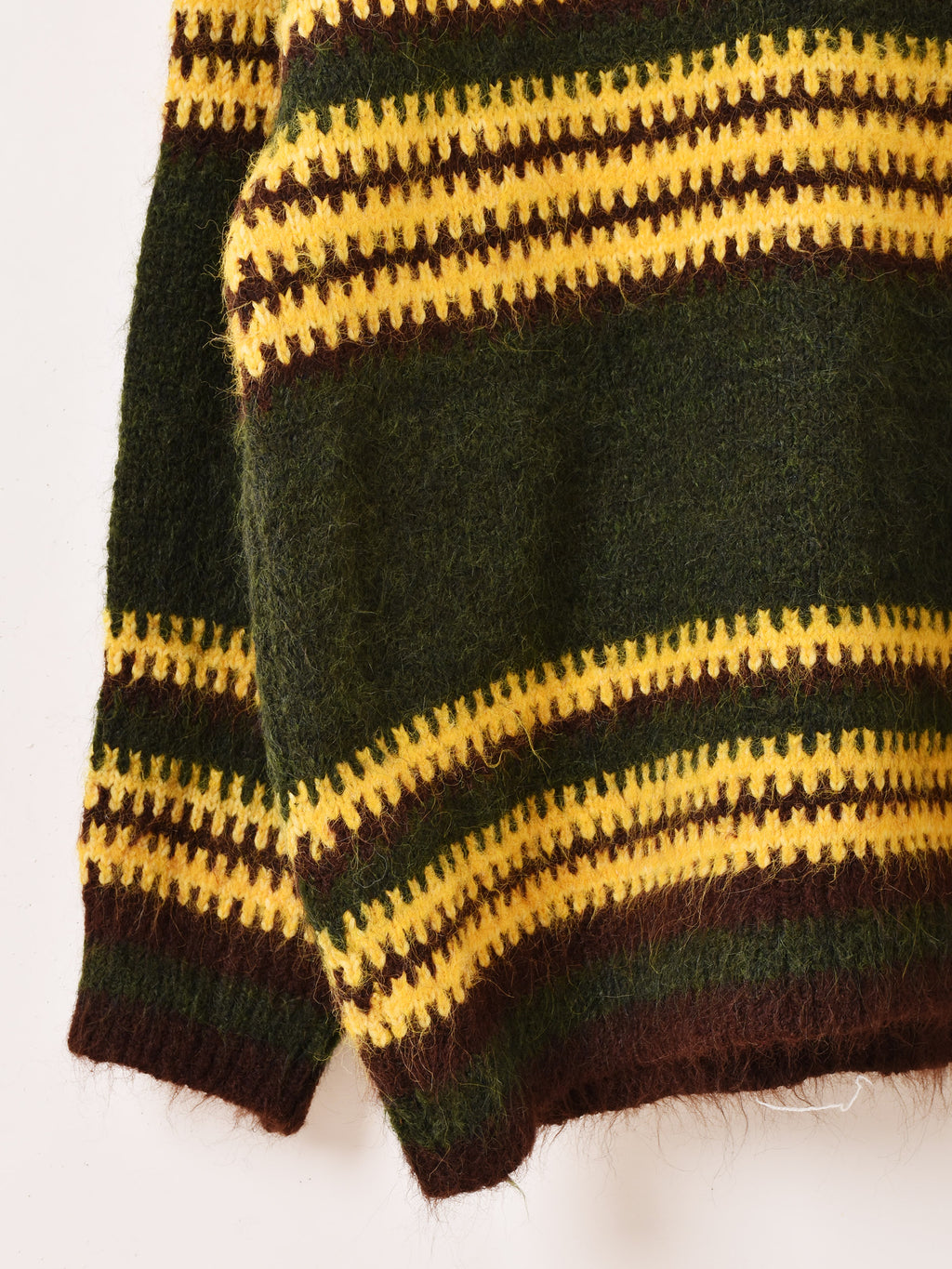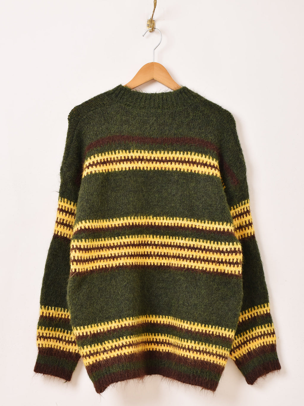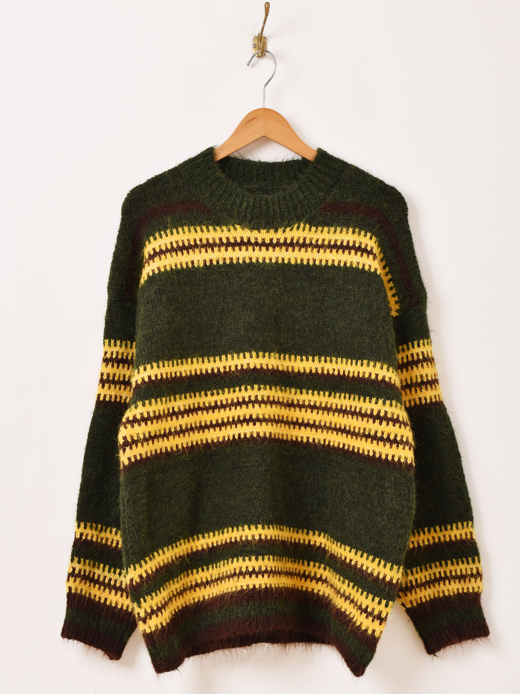 3カラーのボーダーパターンが目を惹くセーター。オーバーサイズでざっくりと着られて、こなれた雰囲気のスタイルに仕上がります。ふんわりとブラッシュド加工された、柔らかなニット生地です。