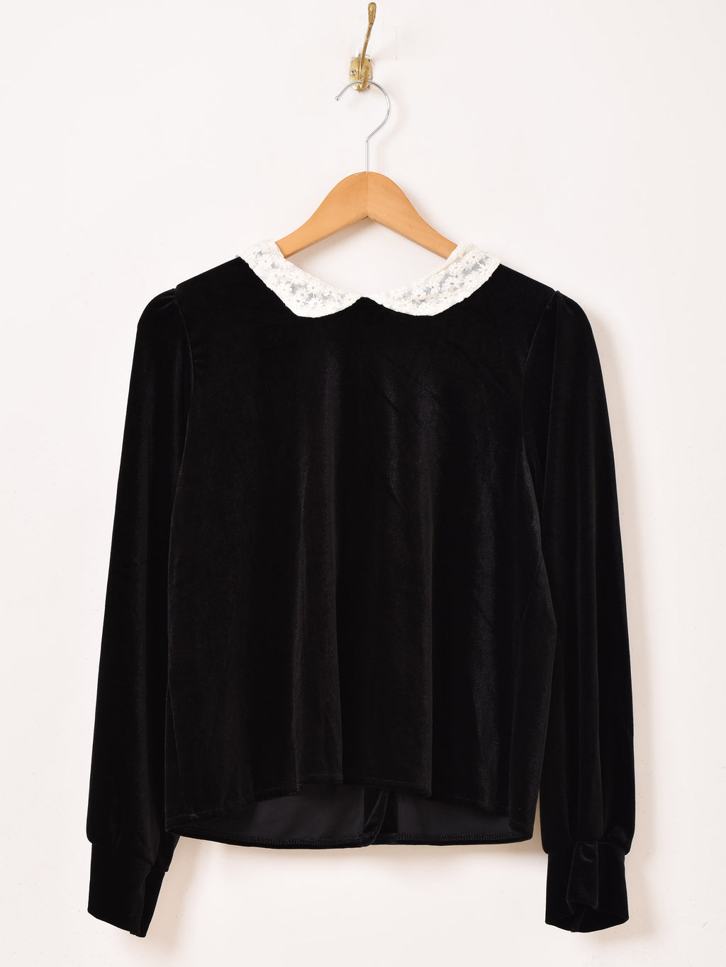 レースのボウタイが目を惹くブラウス。ベロアの上品な質感がエレガントな雰囲気に仕上げてくれます。