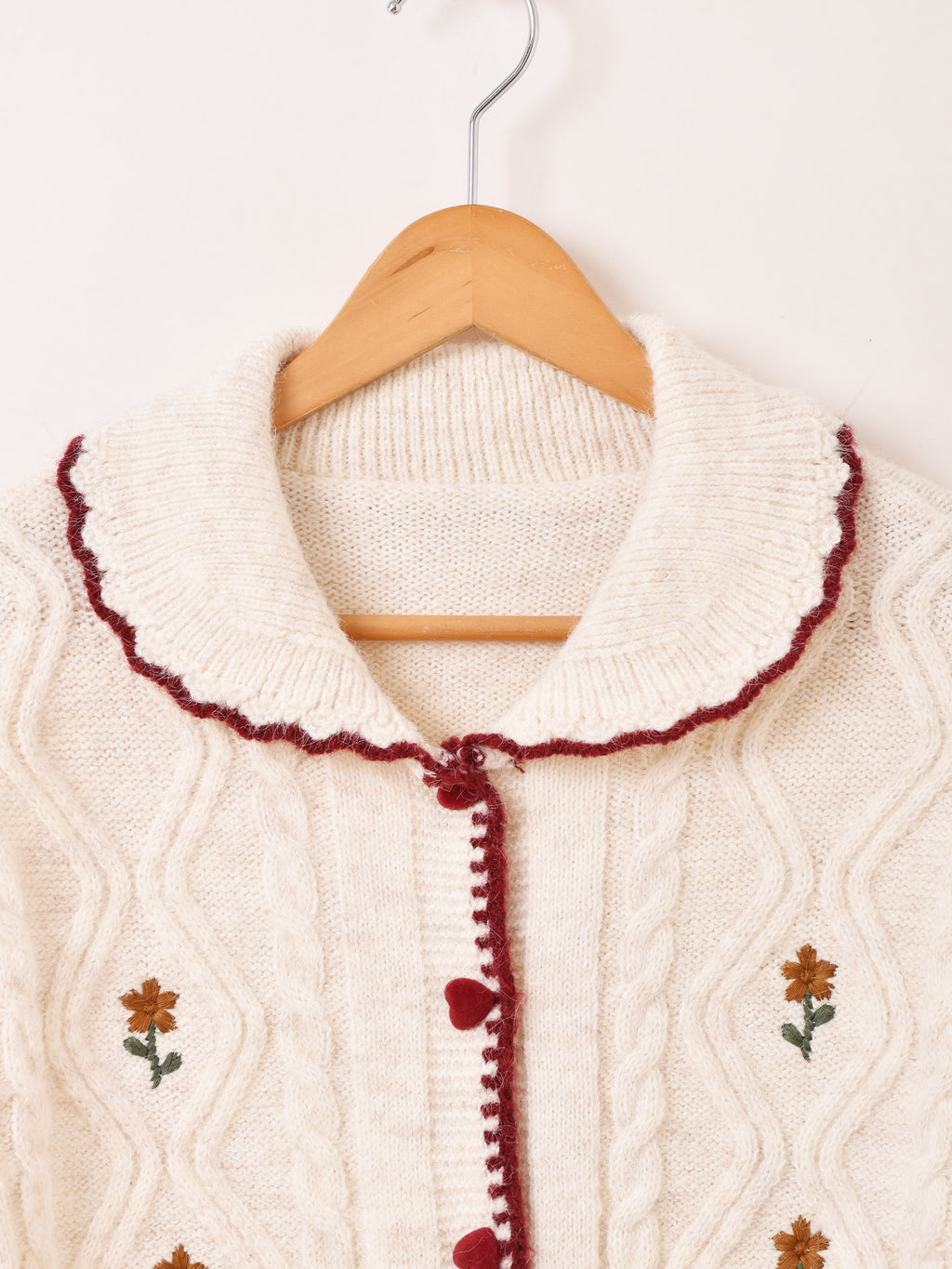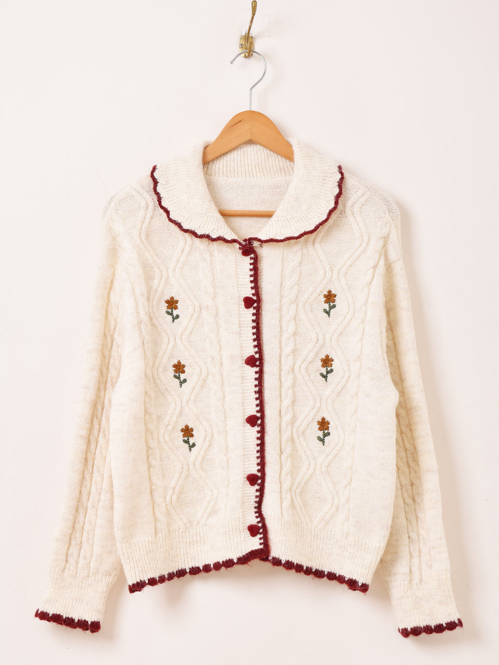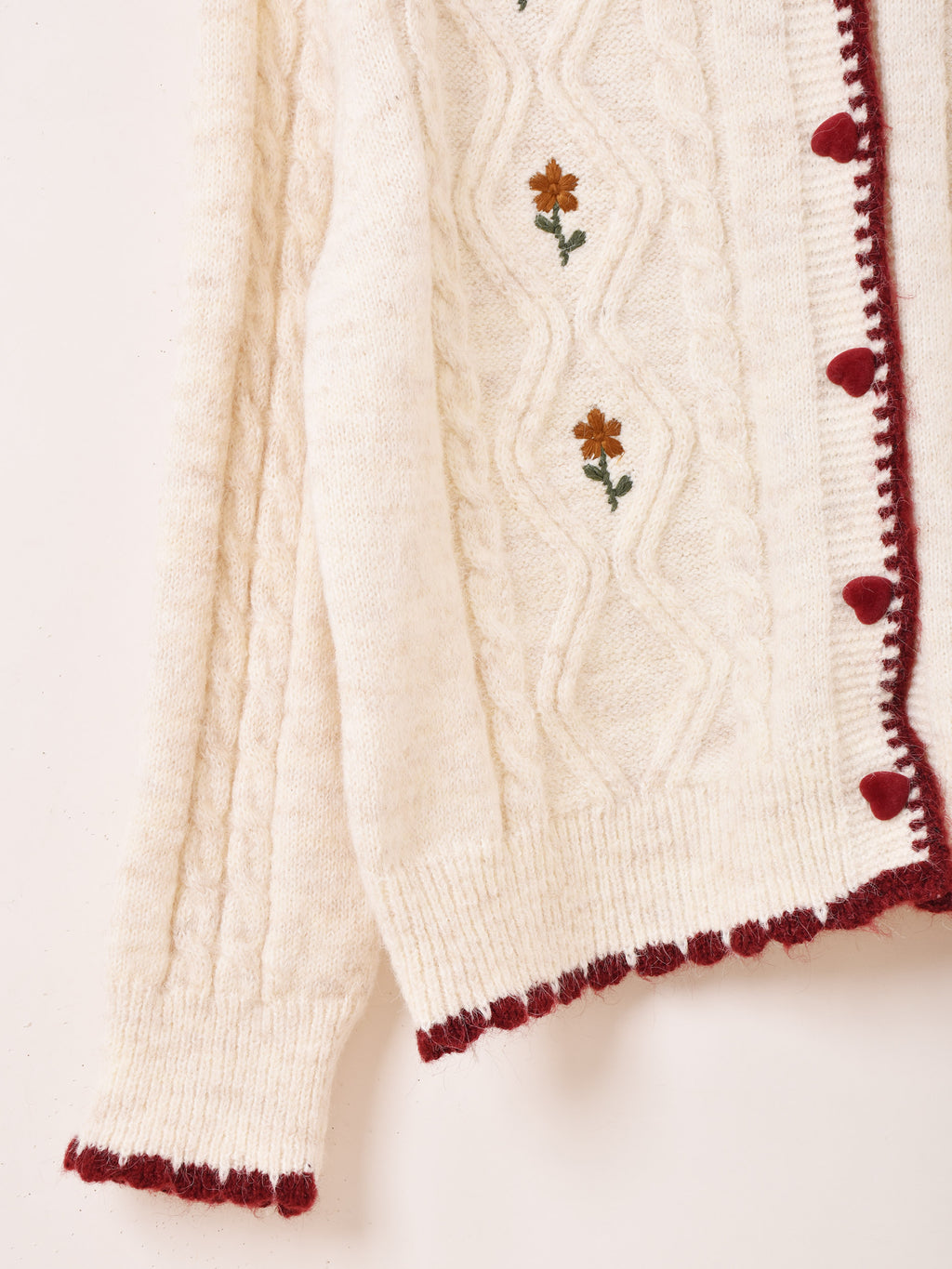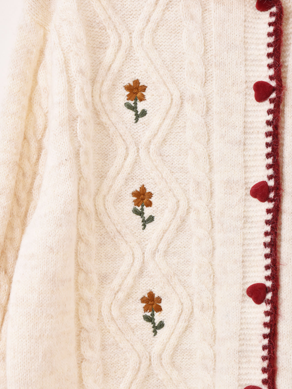 お花の刺繍をあしらい、ガーリーでレトロな雰囲気が可愛いカーディガン。パイピングデザインにハート型のボタンもポイント。柔らかな肌触りのニット生地で仕立てています。