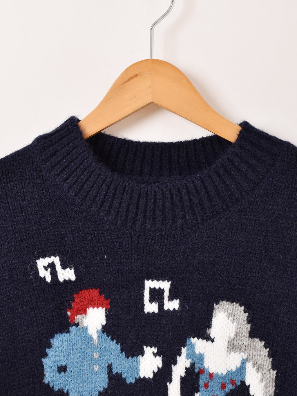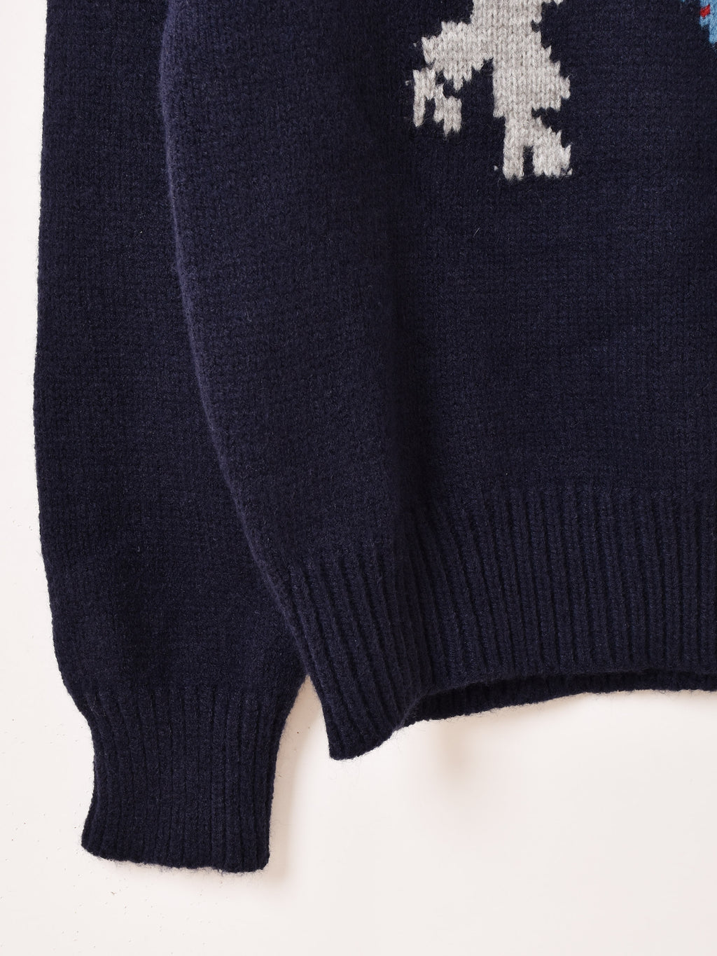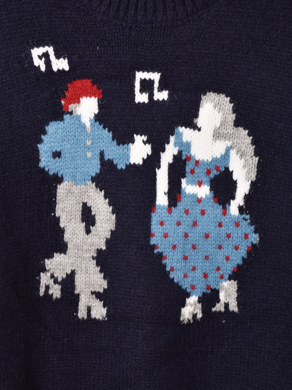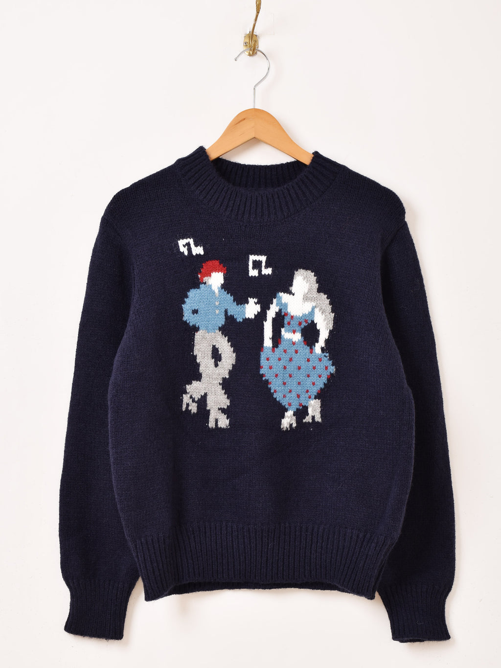 ダンスをする男女のモチーフが編まれた、古着っぽいデザインが魅力的なセーター。ざっくりと着られるシルエットがポイント。厚みのある、柔らかなアクリルニット生地です。