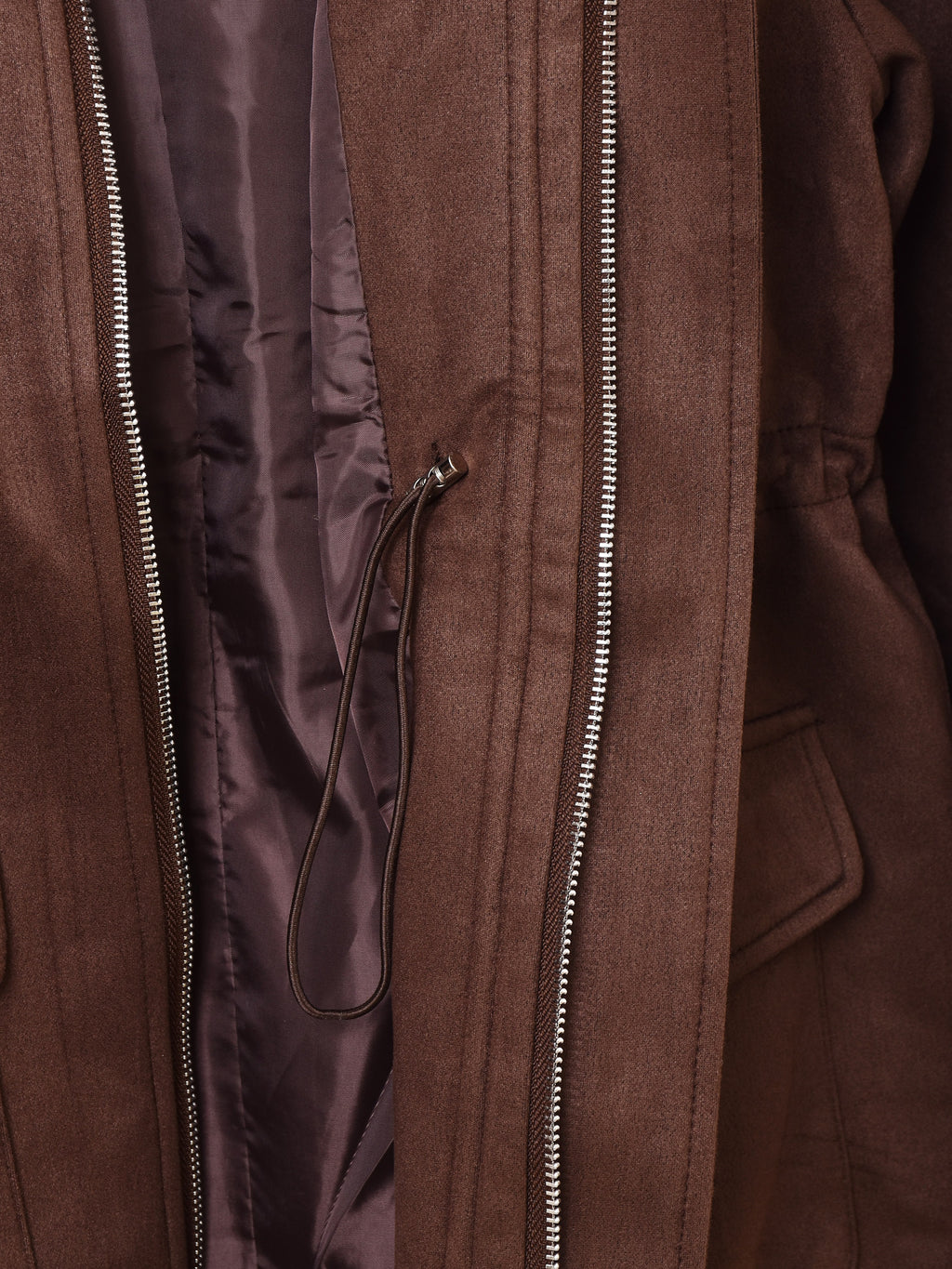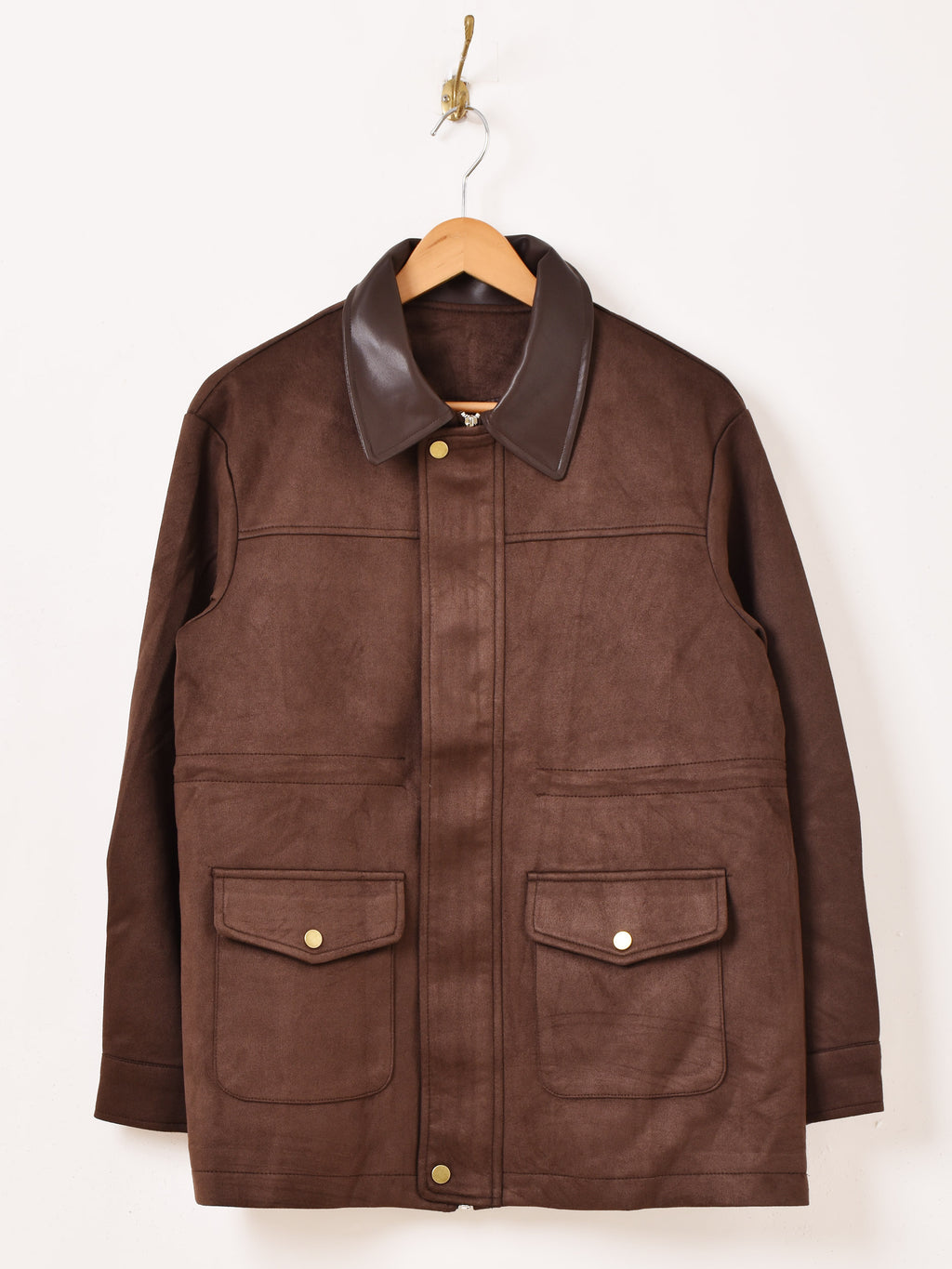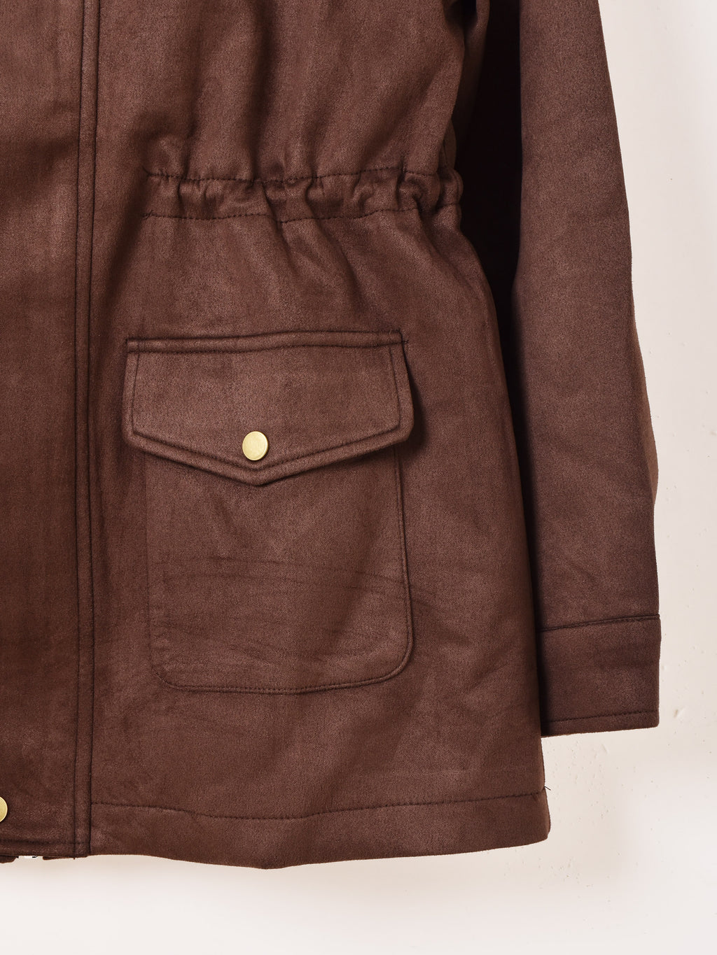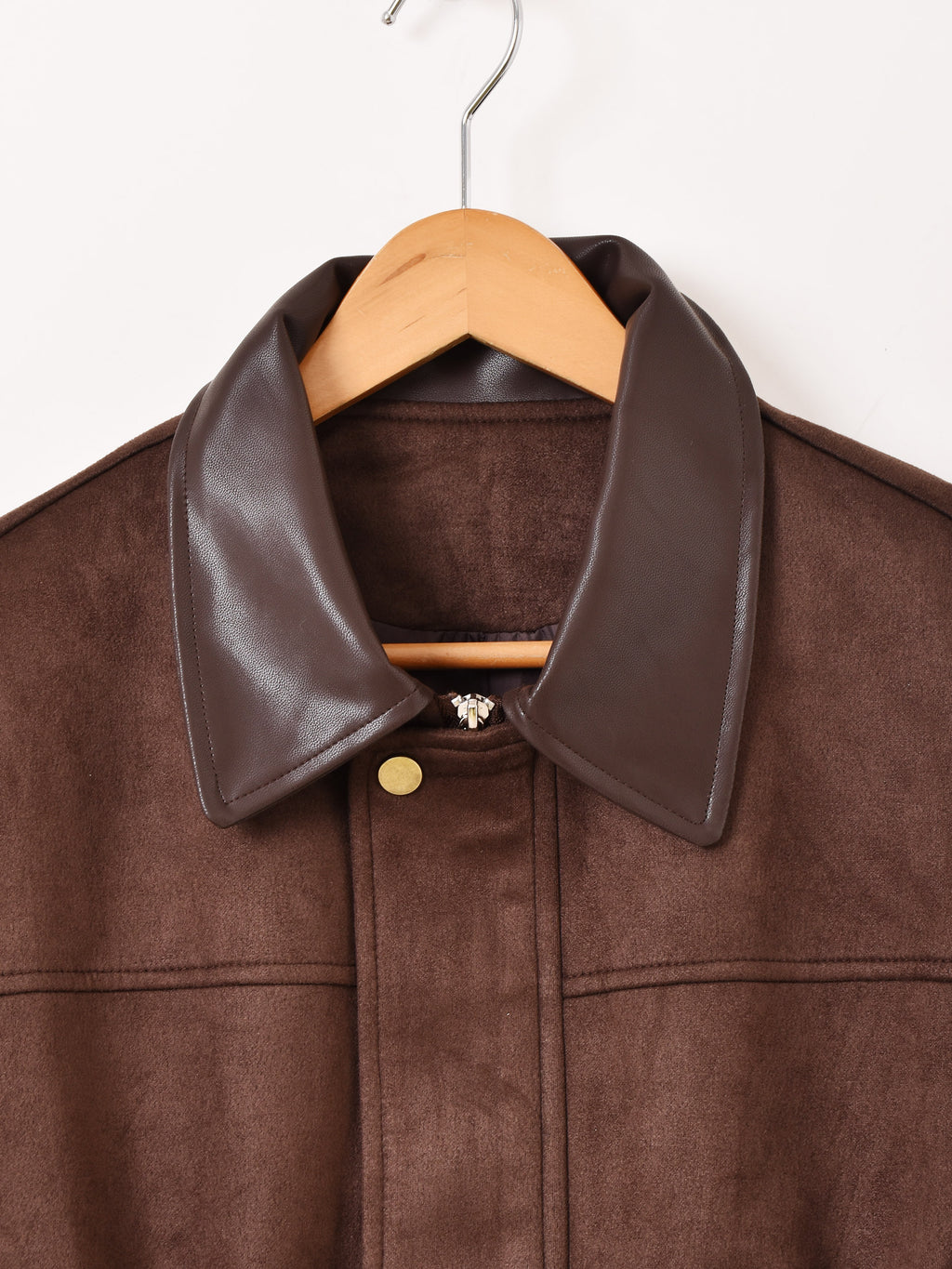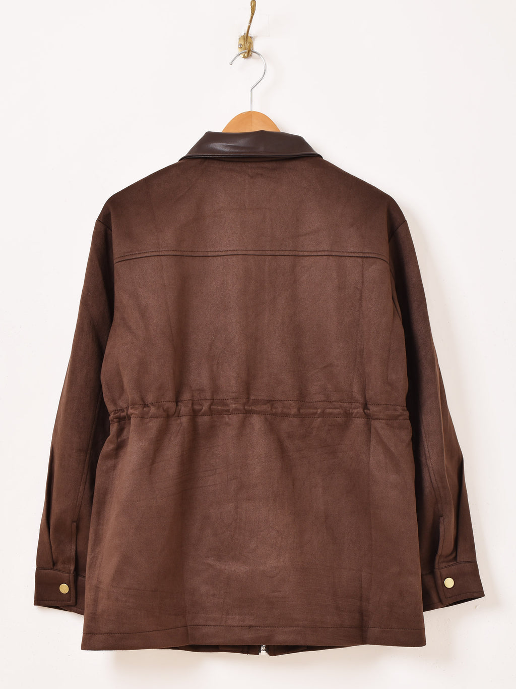 フェイクレザーの襟がポイントのミドル丈ジャケット。ウエストにドローコードが備わっており、シルエットの調節が可能です。大きな2つのフラップポケットが付いたカジュアルデザインが旬のスタイルにぴったり。ライトな生地なので春先まで大活躍します。