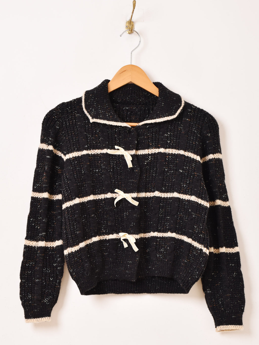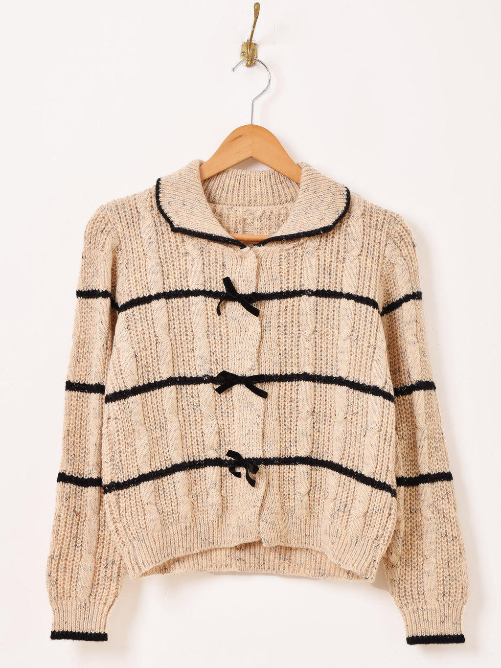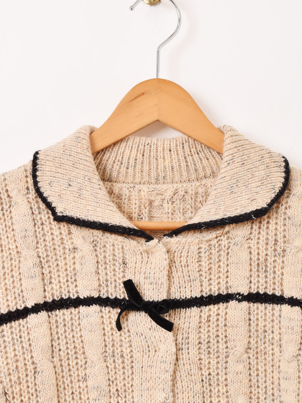 ボタン部分にリボンをあしらった、ガーリーな雰囲気の襟付きカーディガン。すっきりとしたショート丈でバランス良く着こなせます。程よい厚みのローゲージニットで編まれています。