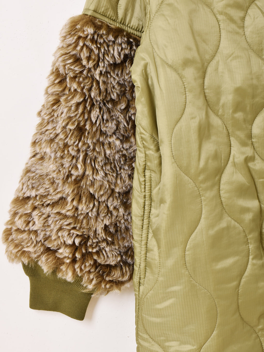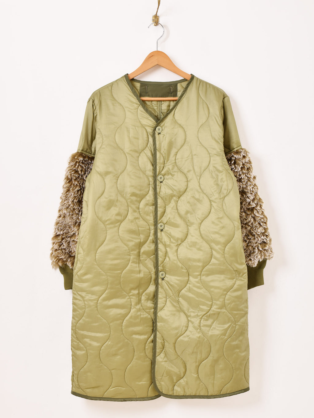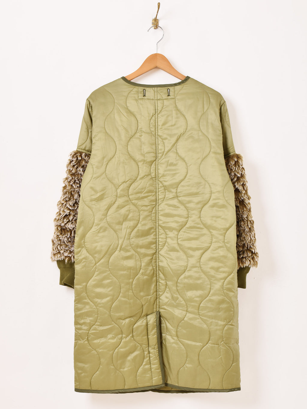 ボリューミーな袖ボアの切り替えがアクセントになった、キルティングのライナーコート。ミリタリーライクなデザインが旬らしくトレンド感たっぷりの一着。ゆったりシルエットでルーズにこなれた雰囲気に仕上がる主役アウター。ライトな生地感なので、コートの下にインナーアウターとして着用するのもおすすめです。