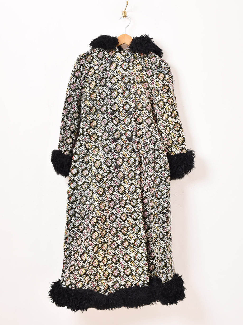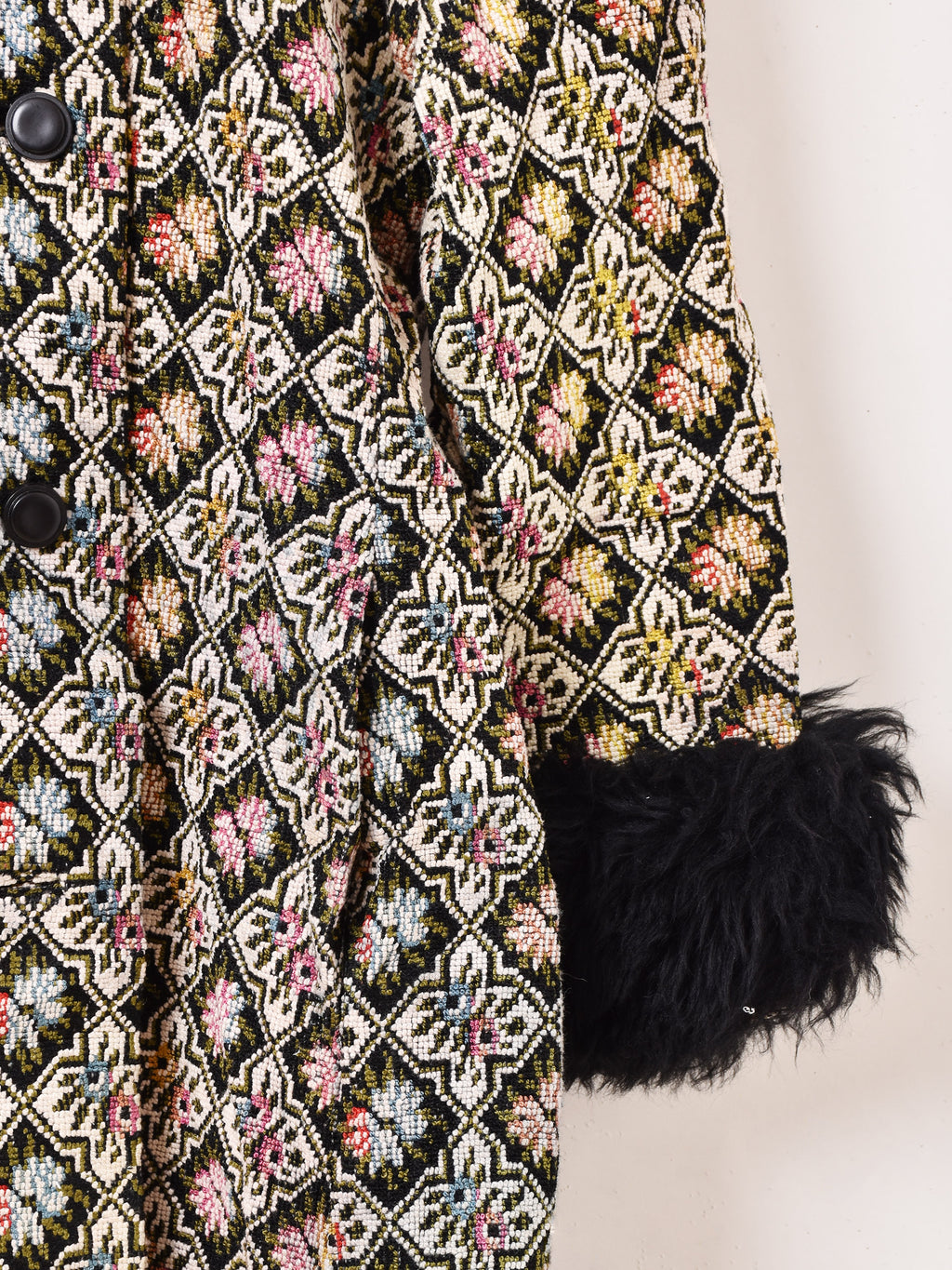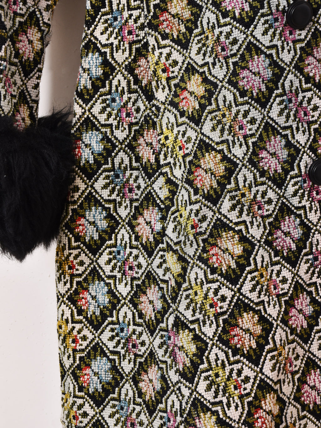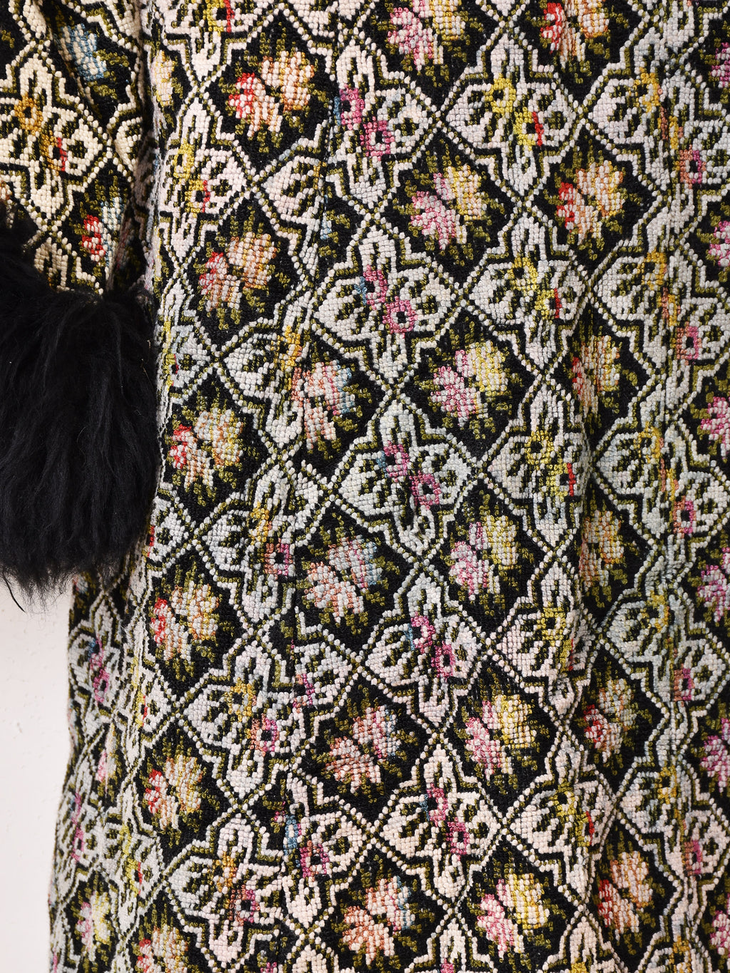 贅沢に使用されたゴブラン生地と袖や裾にあしらわれたファーがエレガントで存在感抜群のコート。