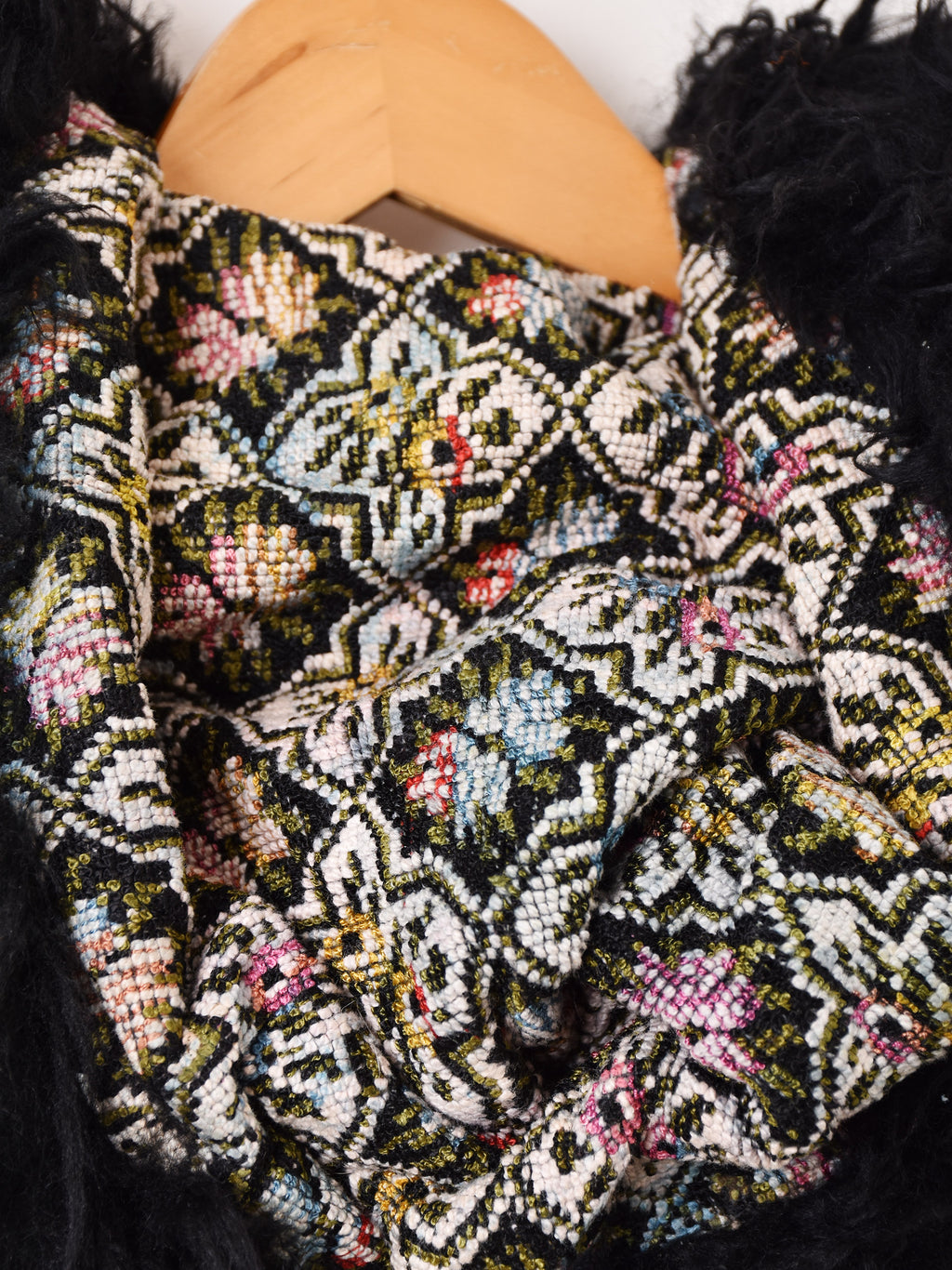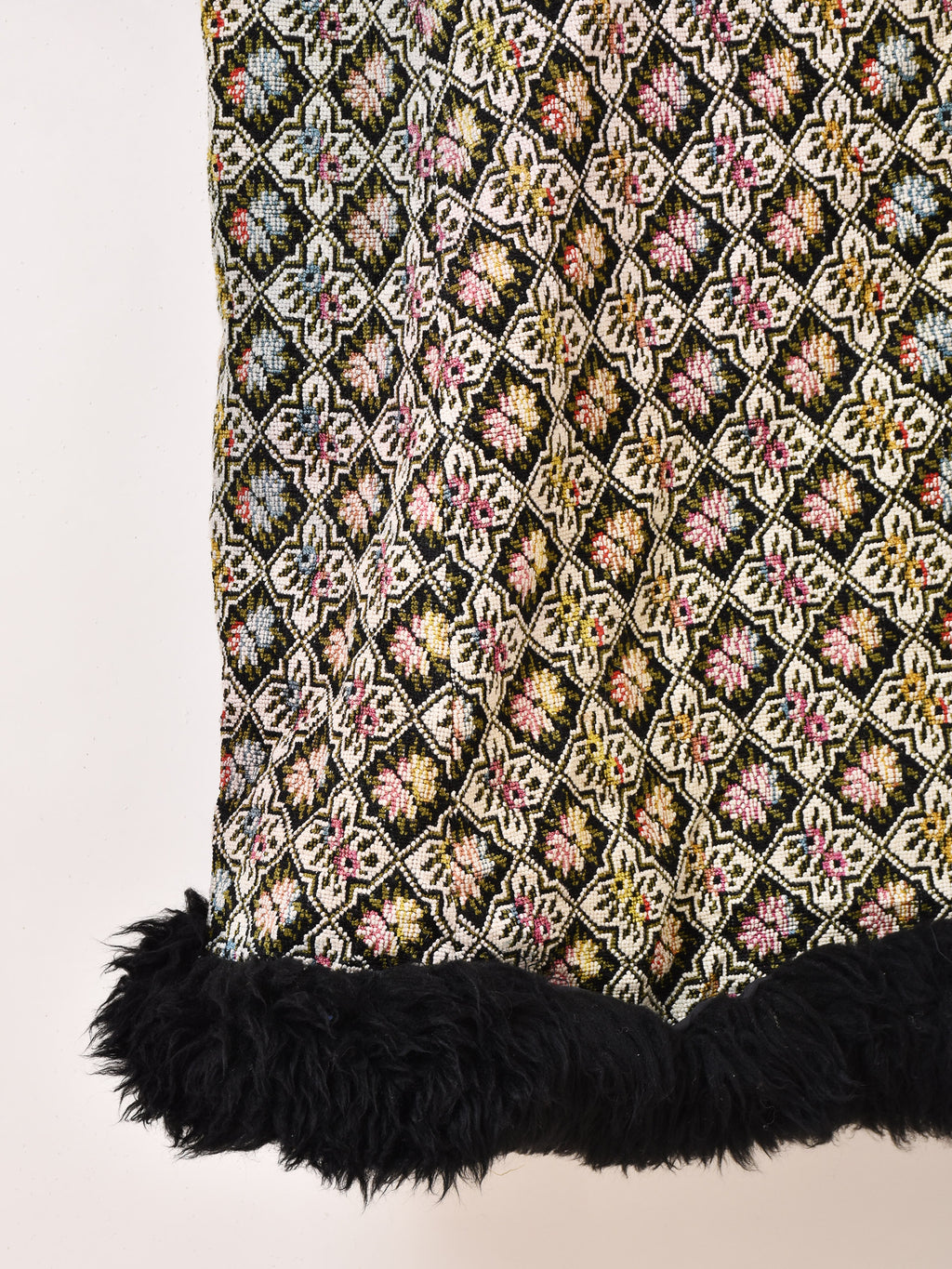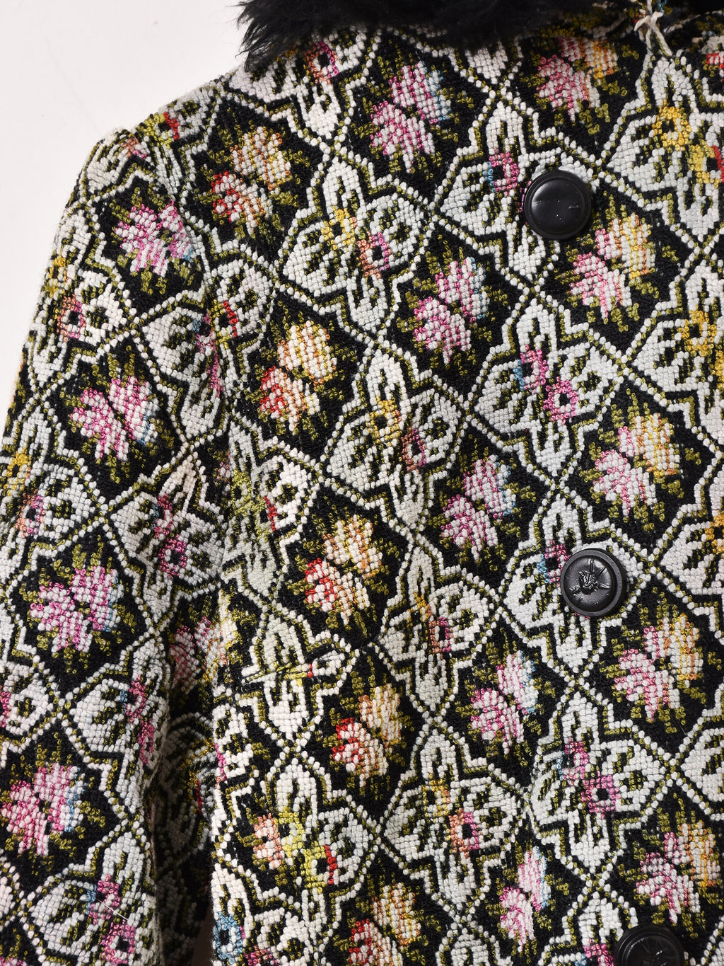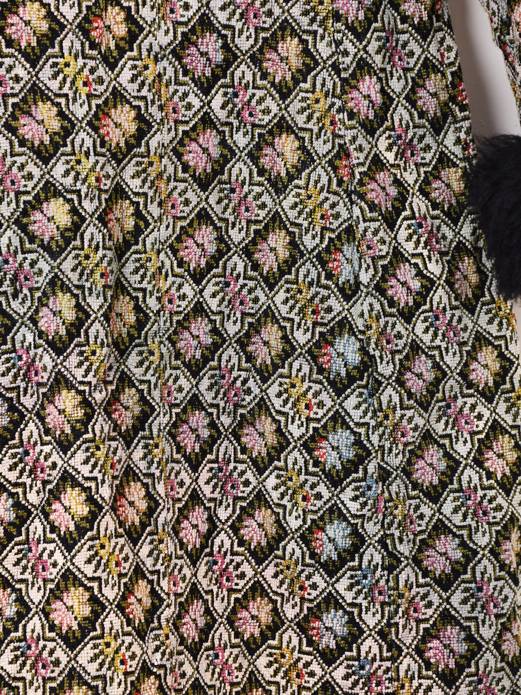 贅沢に使用されたゴブラン生地と袖や裾にあしらわれたファーがエレガントで存在感抜群のコート。