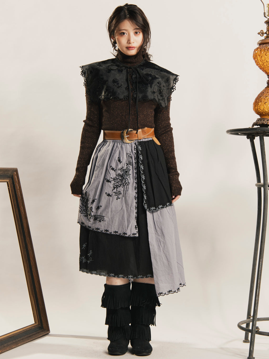 刺繍を施したコットン生地をドッキングして仕立てたスカート。アンティークな雰囲気のデザインがポイント。絶妙なミディ丈で、レイヤードスタイルにも着回せます。