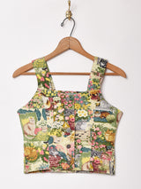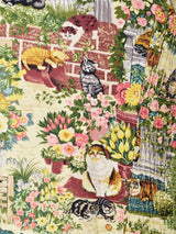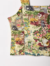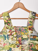 庭にたくさんの猫たちが描かれ、とても賑やかで可愛らしいビスチェ。脇部分にはギャザーが入っており、ストレスフリーの着心地です。
