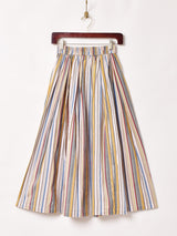 カラフルなストライプが目を惹くロングスカート。ウエストはゴム使用で着脱がしやすい一着です。