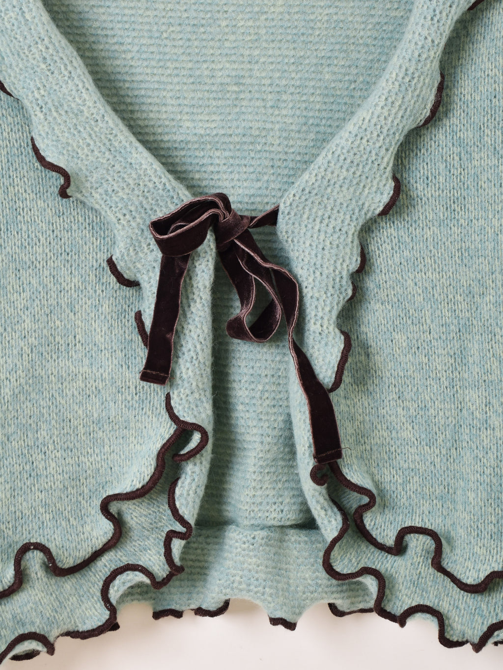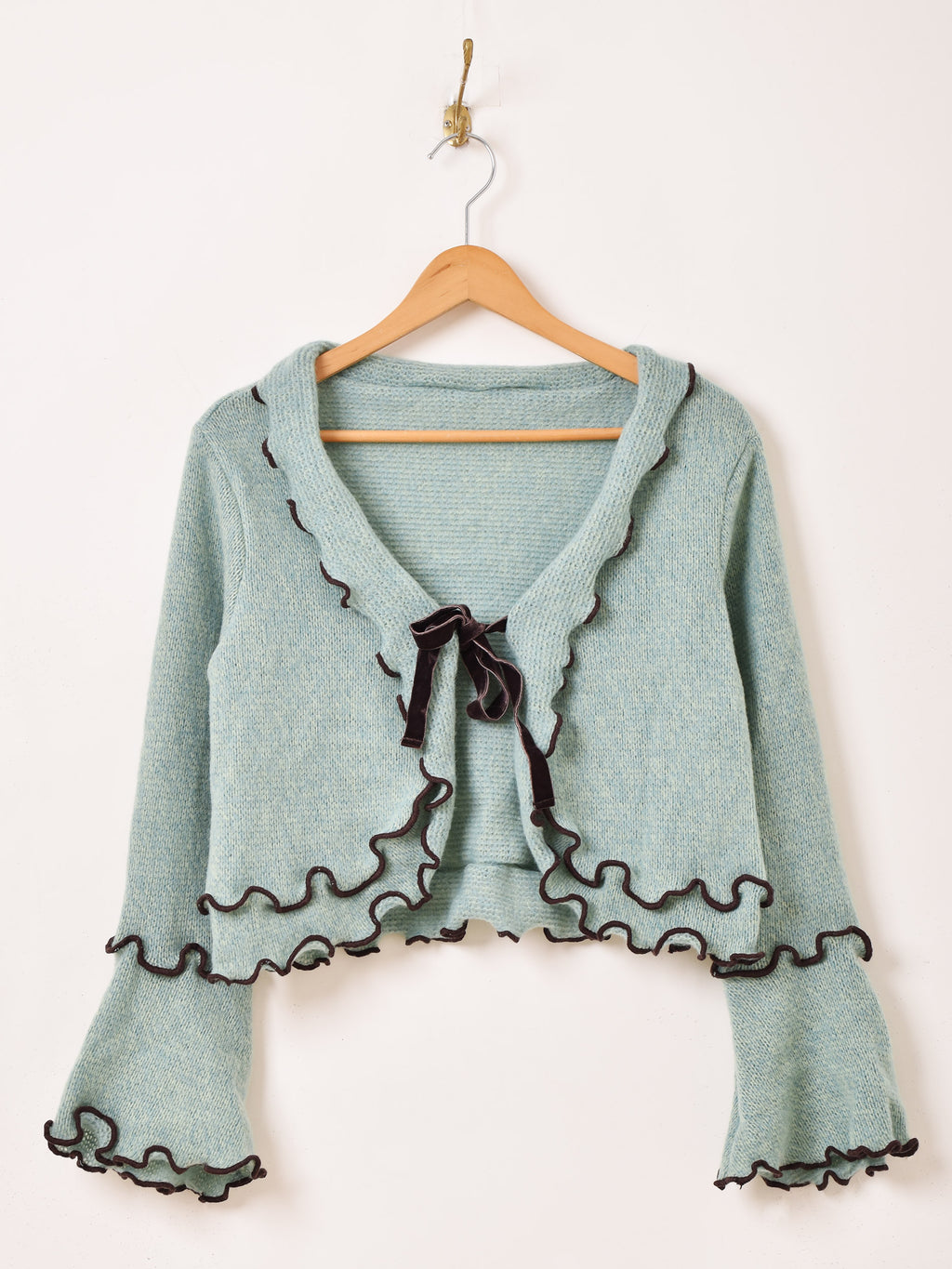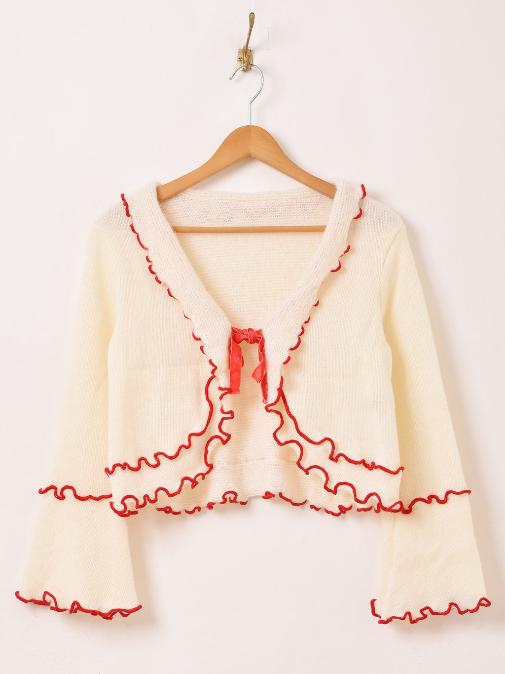 さりげないメロウデザインに、フロントのリボン結びが可愛いカーディガン。トレンド感のある袖のフレアシルエットがポイント。ショート丈でスタイルアップも◎。ふんわりとしたアクリルニットで仕立てています。