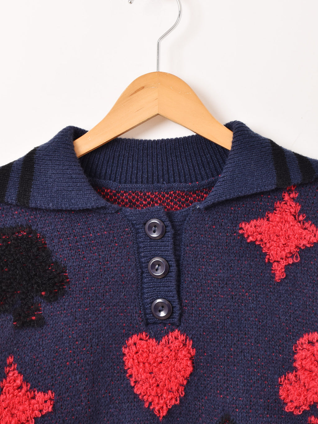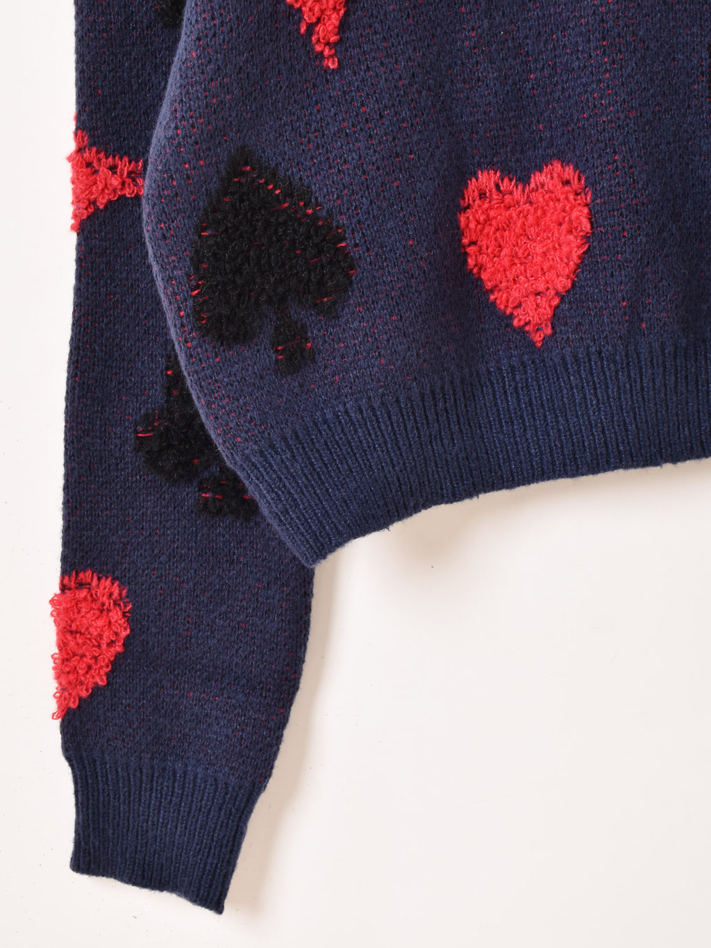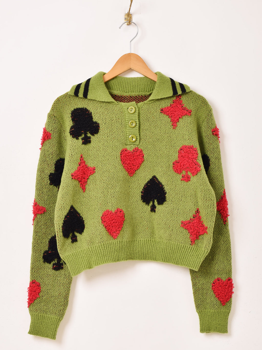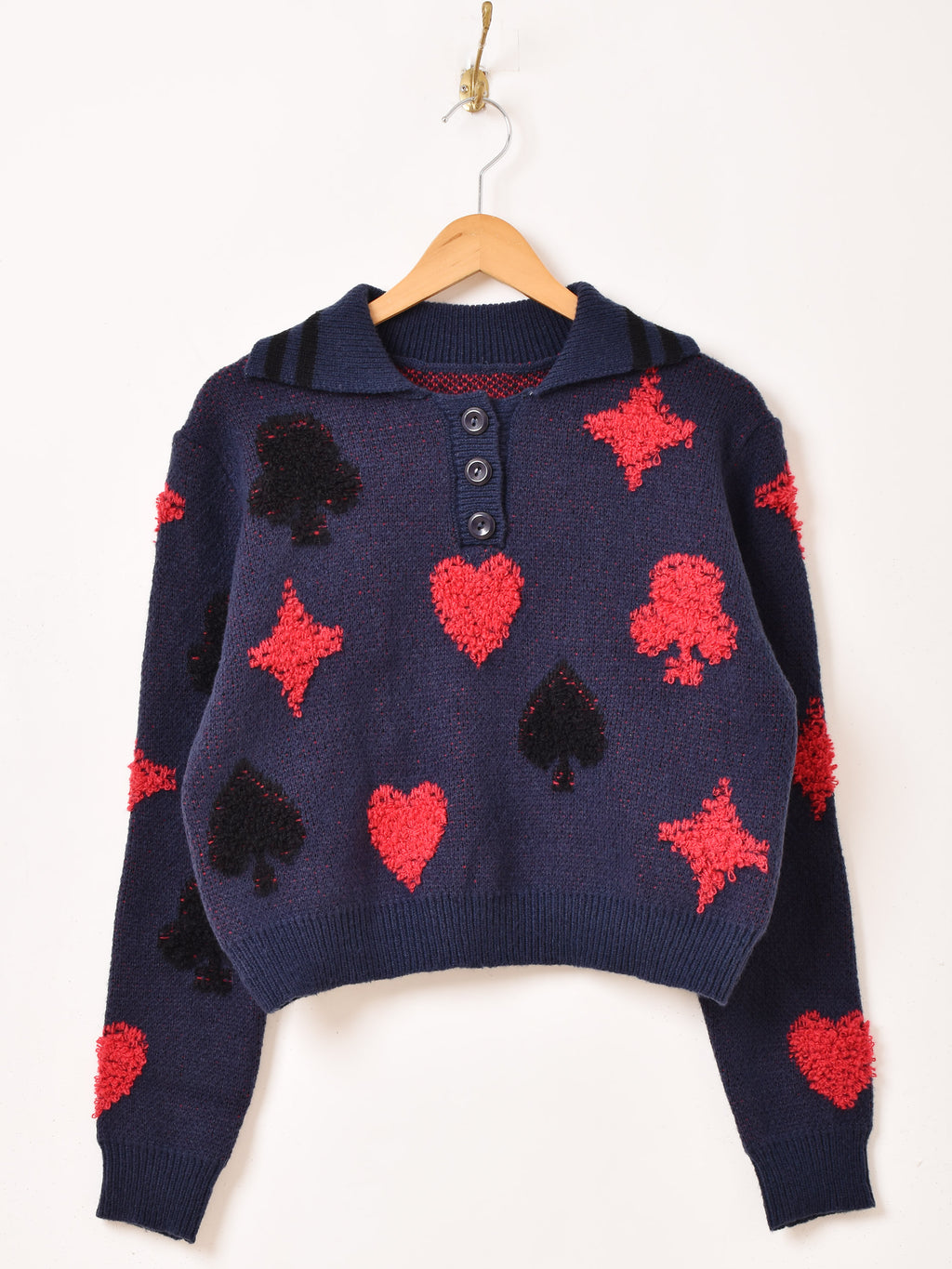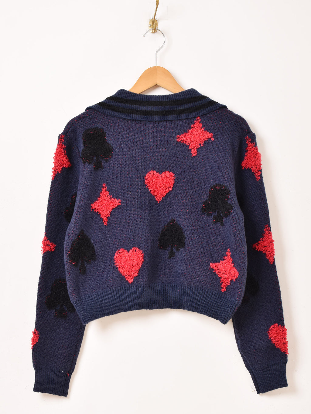 トランプモチーフのデザインをあしらった襟付きセーター。もっちりと厚みのあるアクリルニットで仕立てた、あたたかな一着です。
