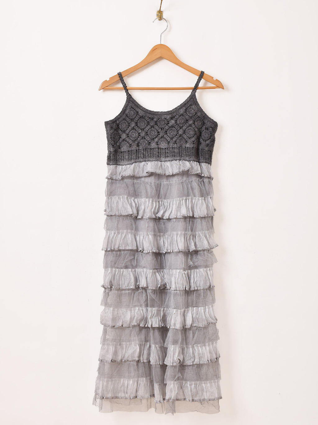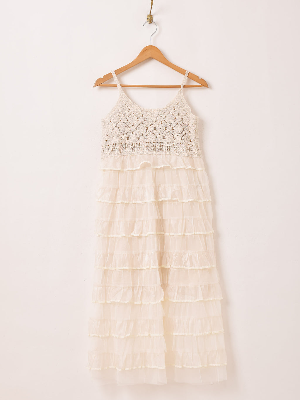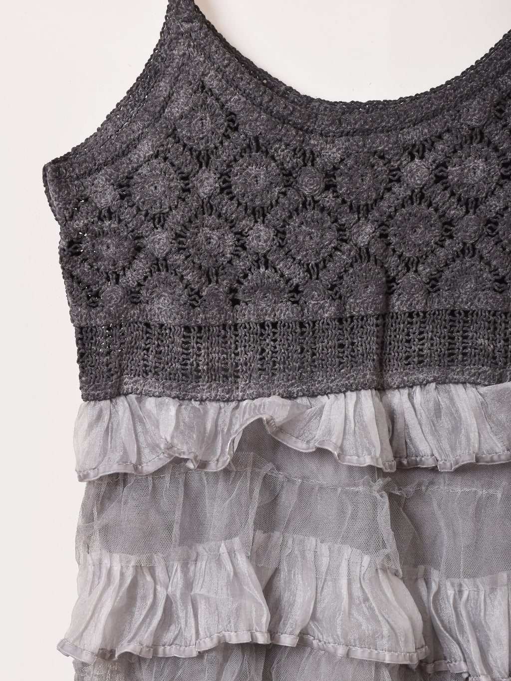 コルセット部分がクロシェ編みになった、切り替えデザインのチュールキャミワンピ。スカート部分はラッフルデザインで可愛らしく、ややタイトめのシルエット。いろんなトップスと合わせてレイヤードコーデが楽しめます。