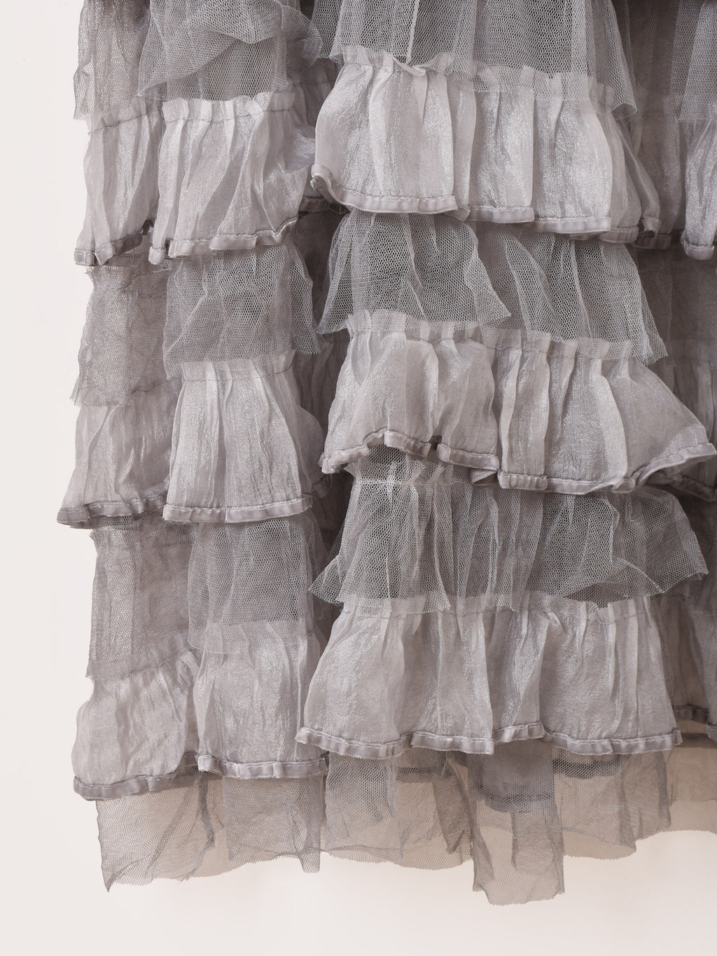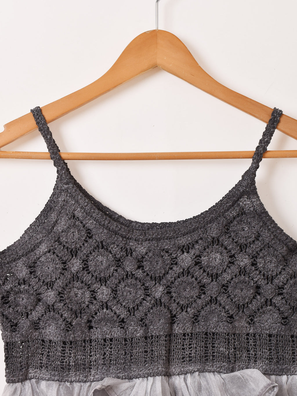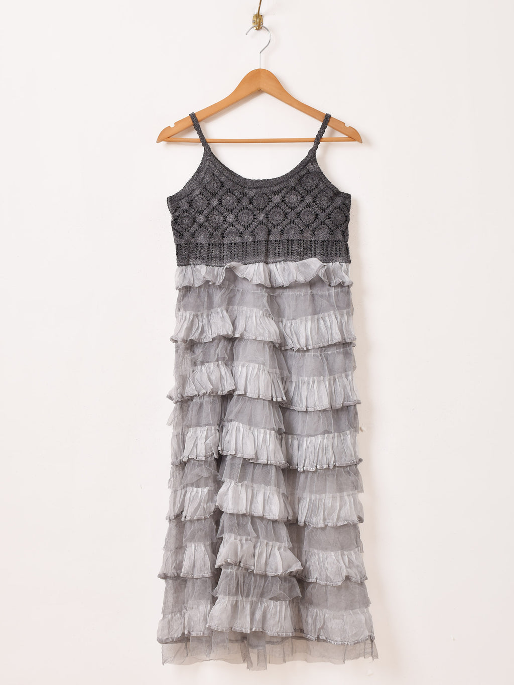 コルセット部分がクロシェ編みになった、切り替えデザインのチュールキャミワンピ。スカート部分はラッフルデザインで可愛らしく、ややタイトめのシルエット。いろんなトップスと合わせてレイヤードコーデが楽しめます。
