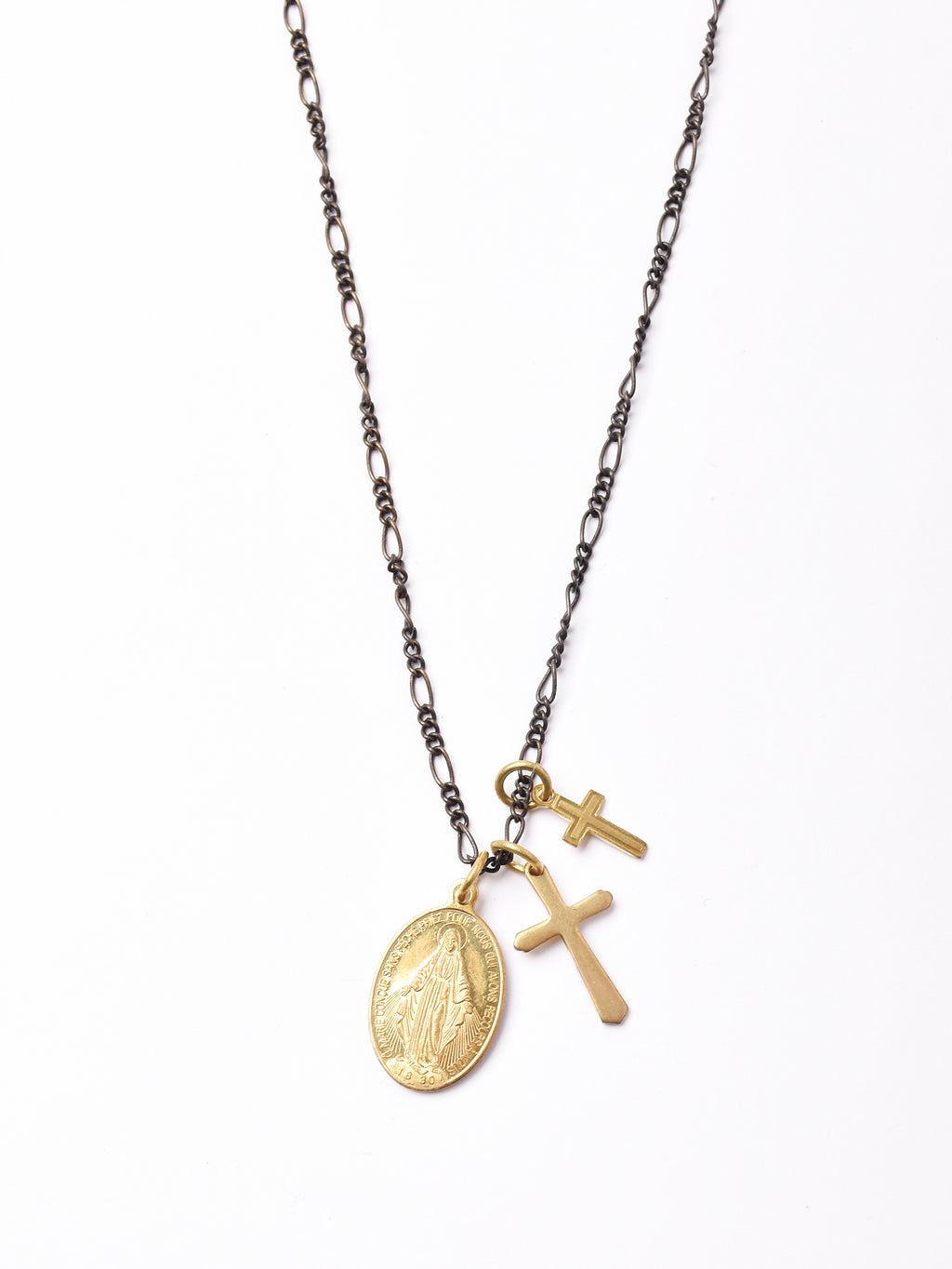 ロジウムメッキを施した真鍮製のメダイ、クロスを組み合わせたネックレス。