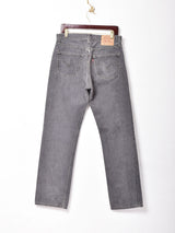 アメリカ製リーバイス501のブラックデニム。全体に色落ちの進んだグレーがかった一着です。