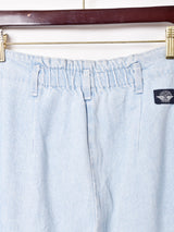 タックの入ったテーパードシルエットのデニムパンツ。薄いライトブルーが爽やかな印象。しっかりとしたコットン素材です。