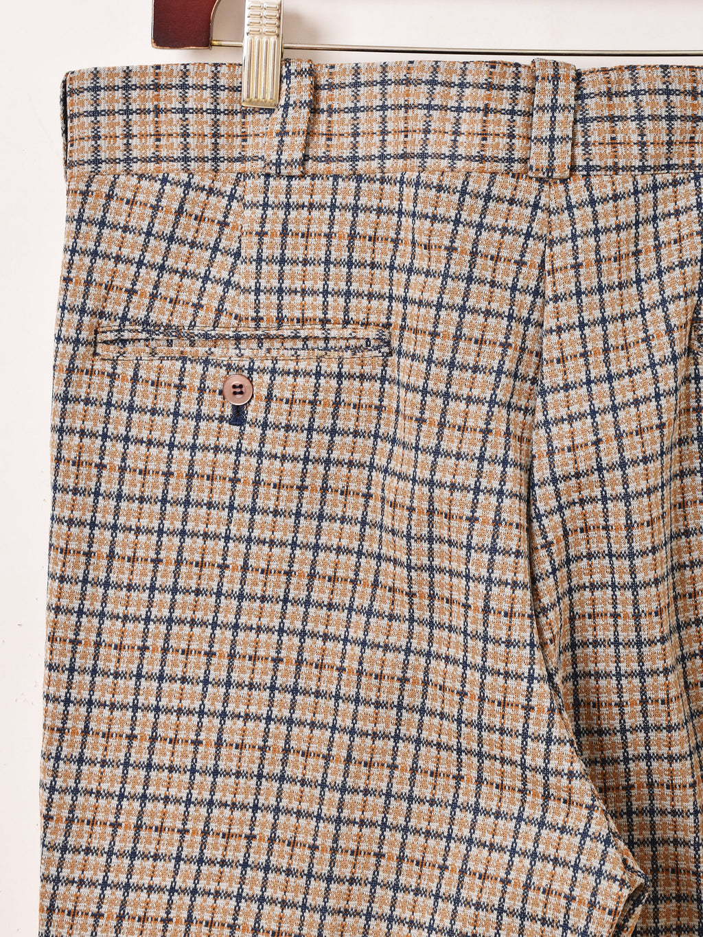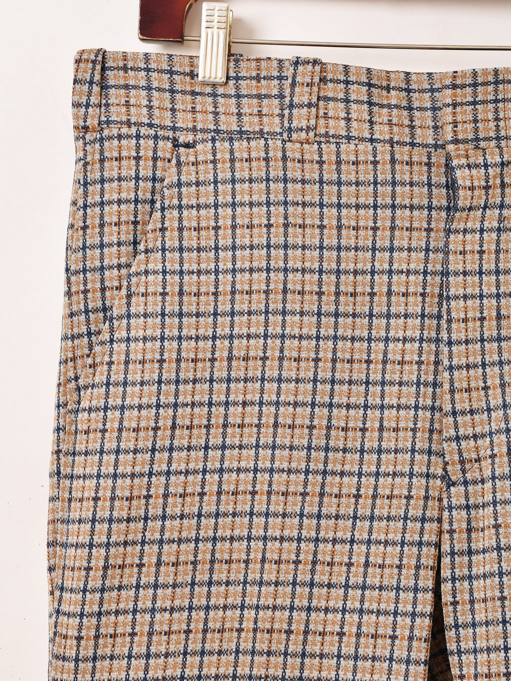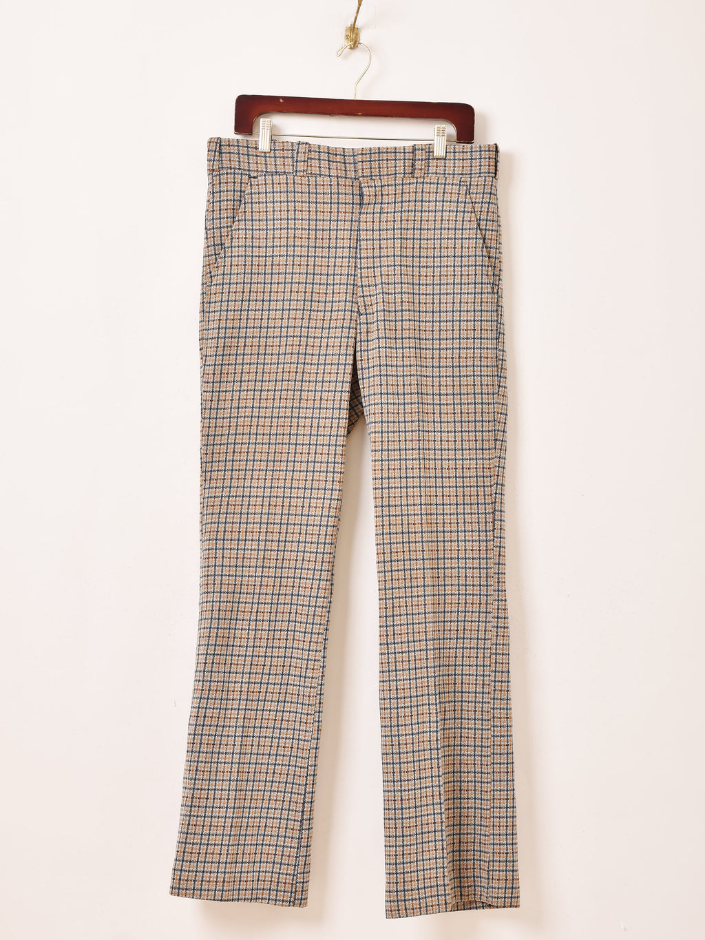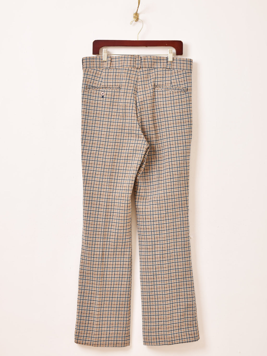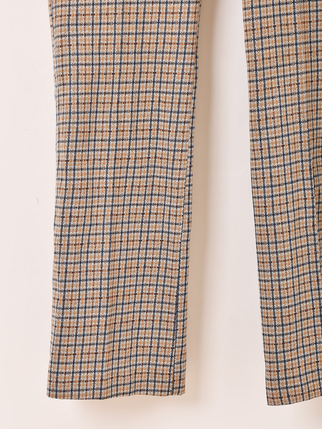 少しフレアなシルエットにセンタープレスがすっきりとしたスタイルを叶えてくれるチェック柄のポリパンツ。シワになりにくく、カジュアルシーンに着回せる一着です。
