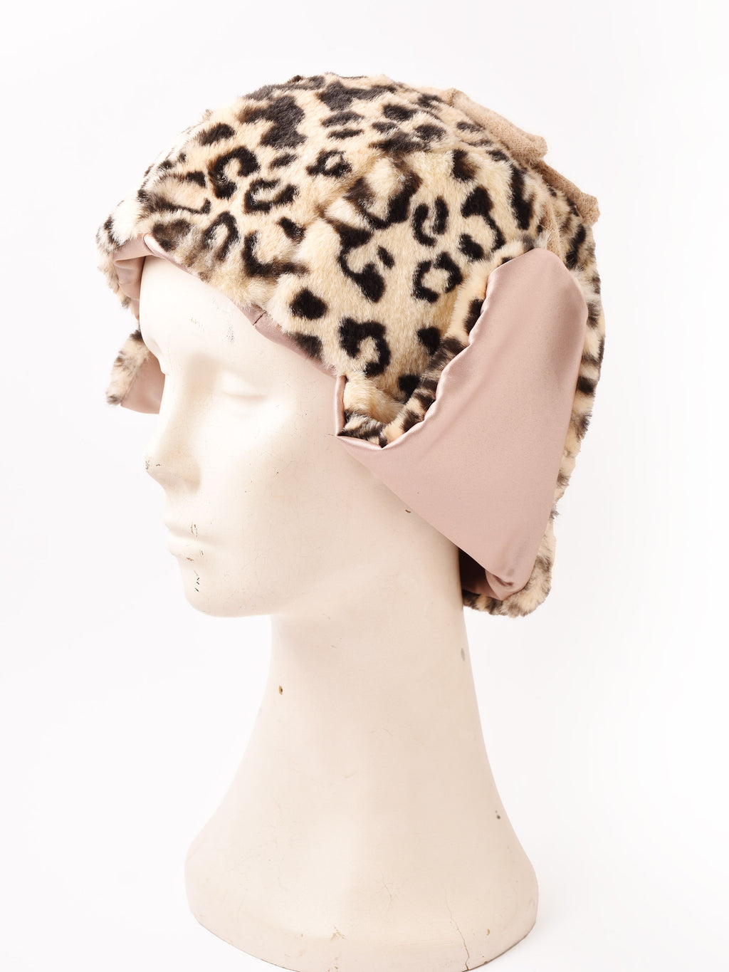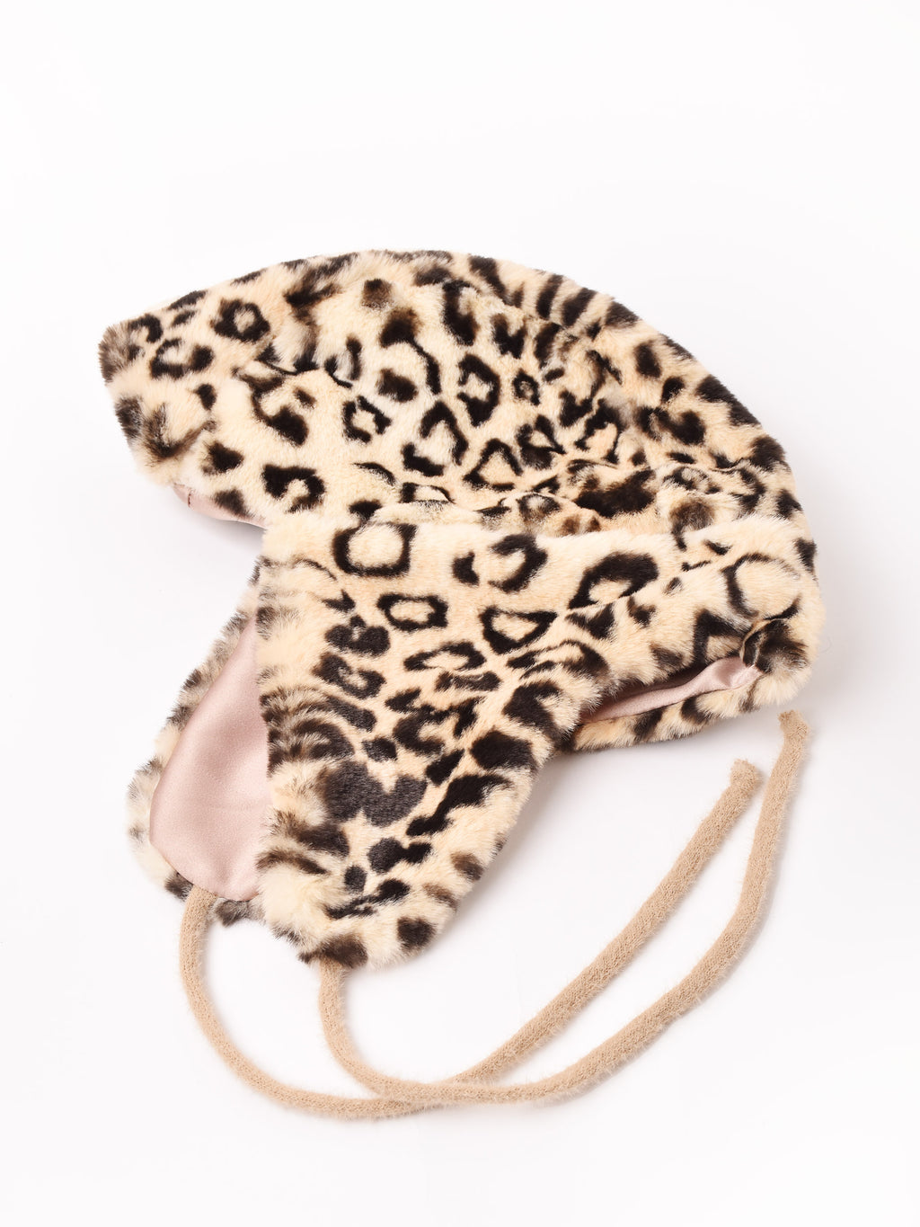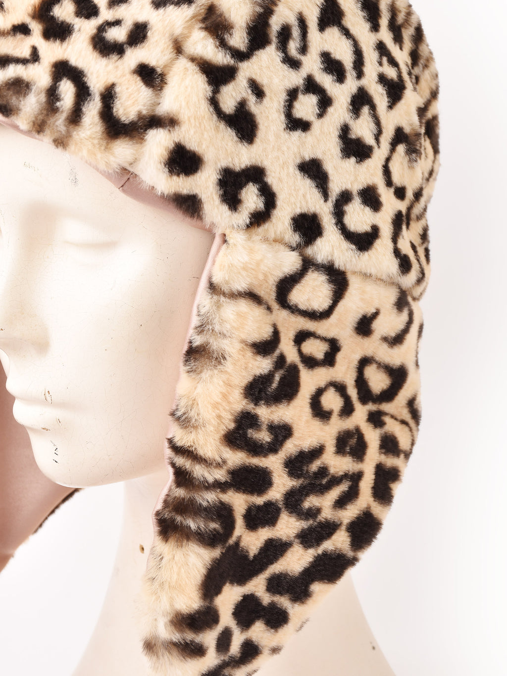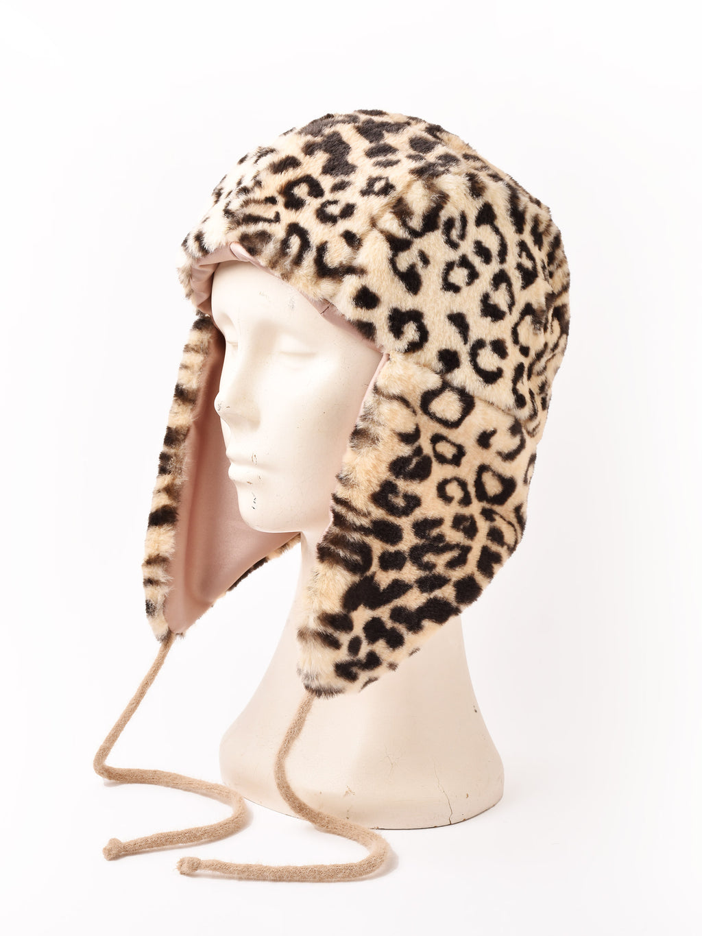 インパクト抜群のヒョウ柄が目を惹くイヤーフラップキャップ。ふんわりとした肌触りのファーが魅力的な一点です。