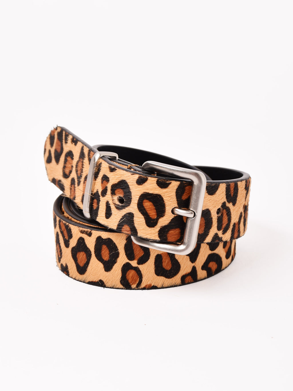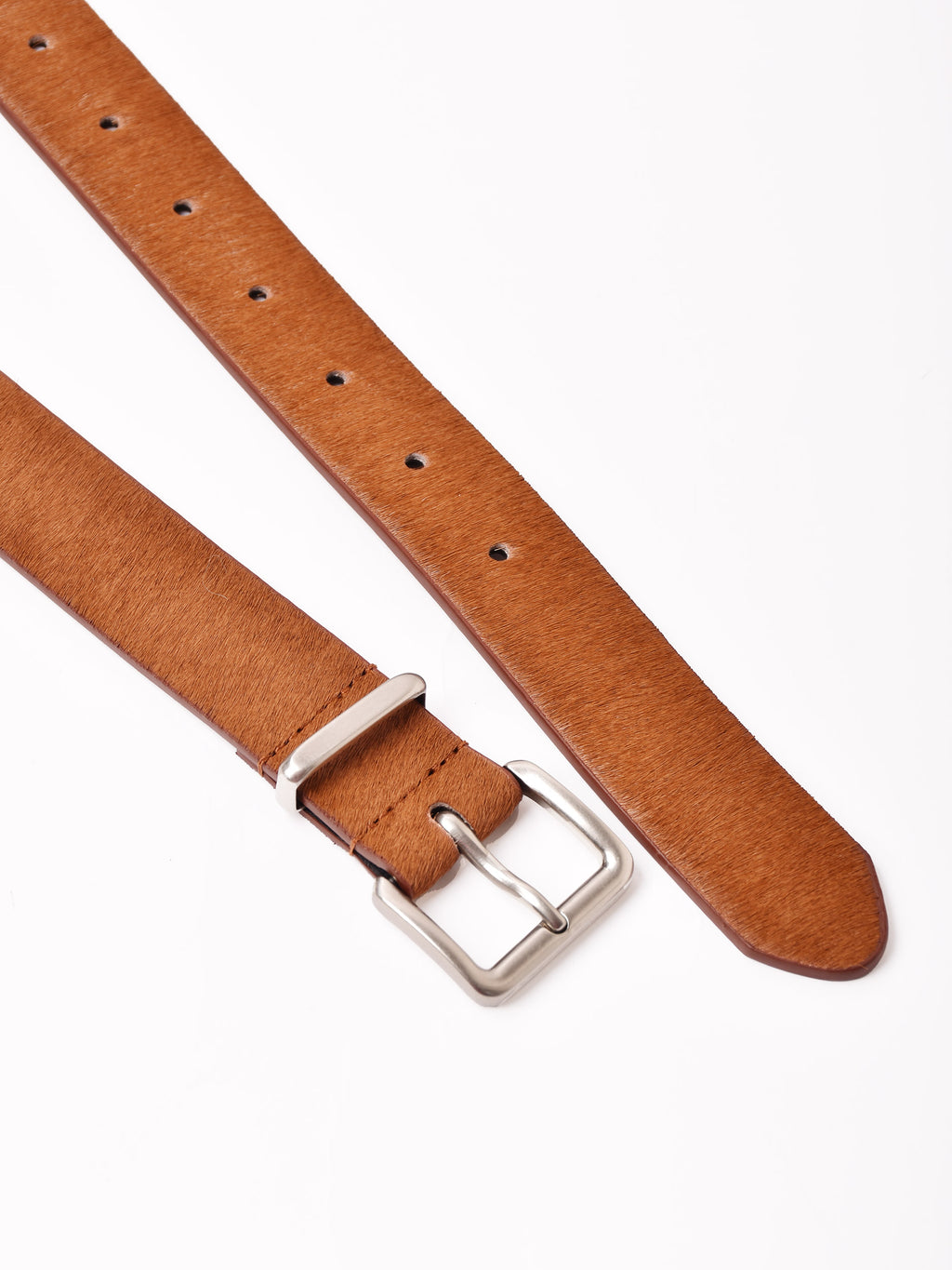 インパクトのあるハラコレザーのベルト。コーディネートのアクセントとしてお使いいただけます。