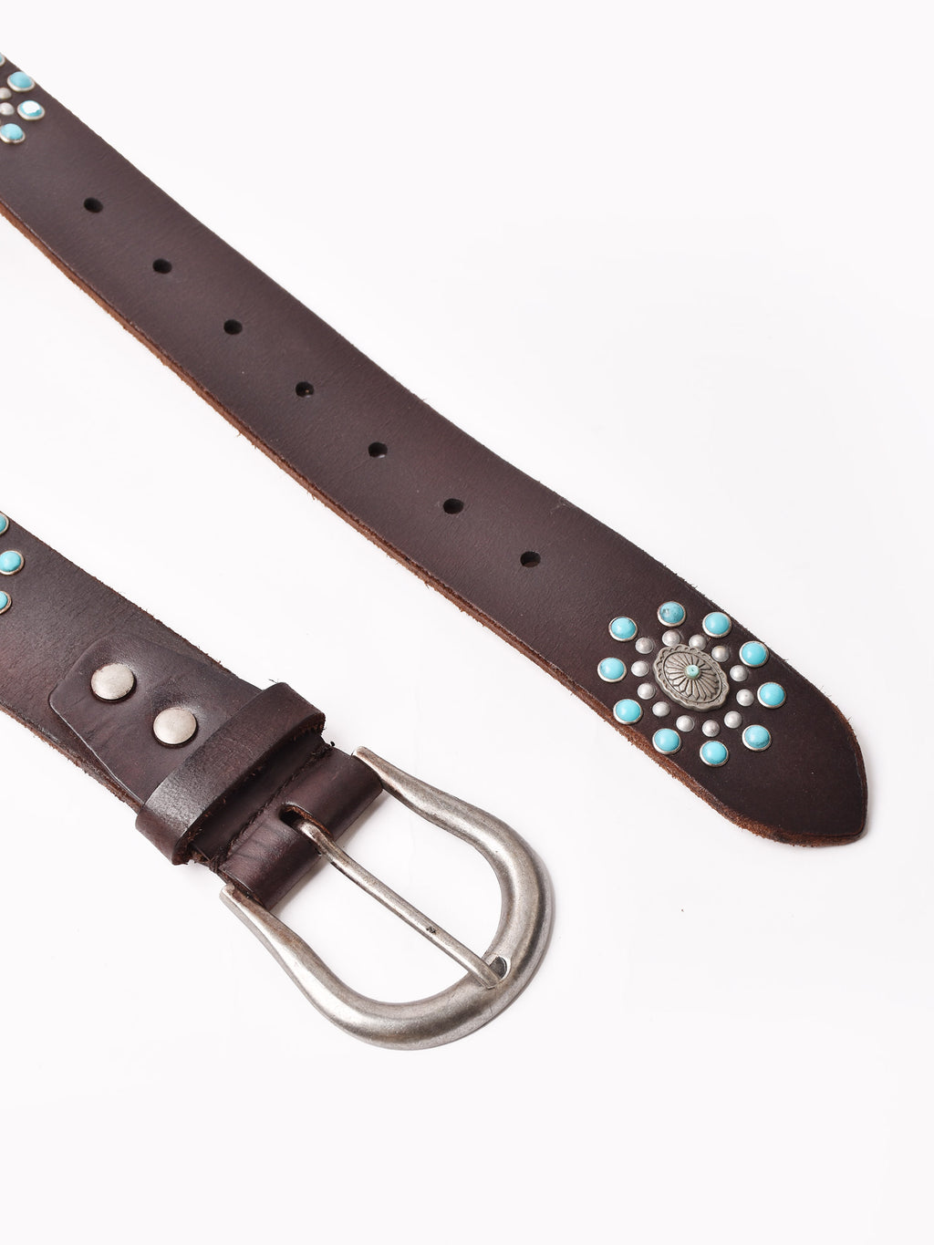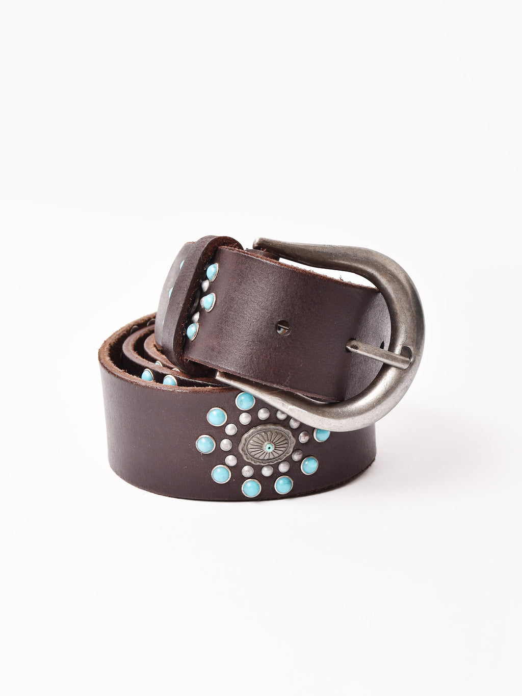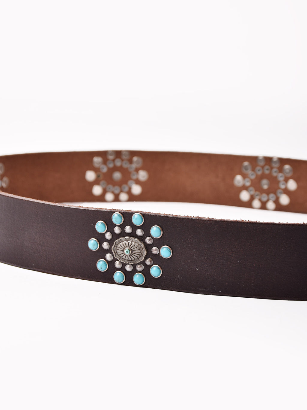 コンチョ風のモチーフとターコイズカラーのスタッズをあしらったベルト。ヴィンテージライクなデザインで、エッジの効いたスタイリングに仕上げてくれる一点です。