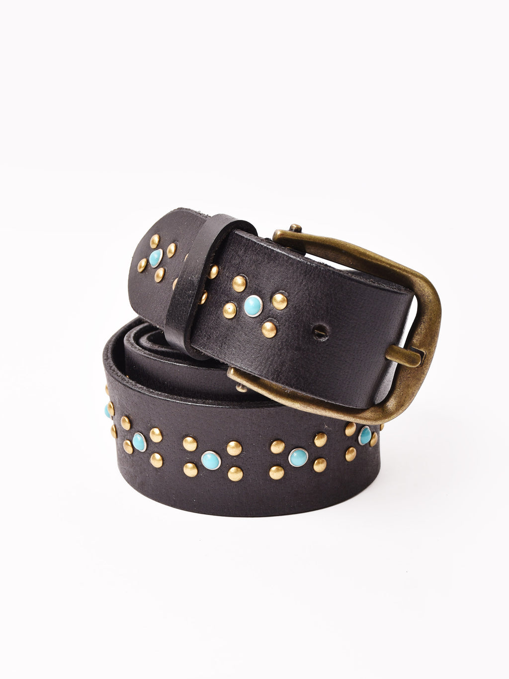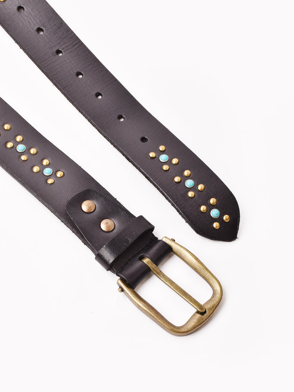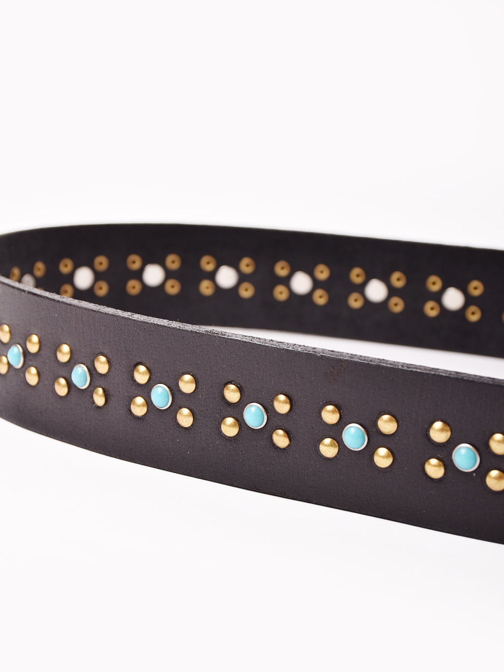 ターコイズカラーのスタッズをあしらったベルト。ヴィンテージライクなデザインで、エッジの効いたスタイリングに仕上げてくれる一点です。