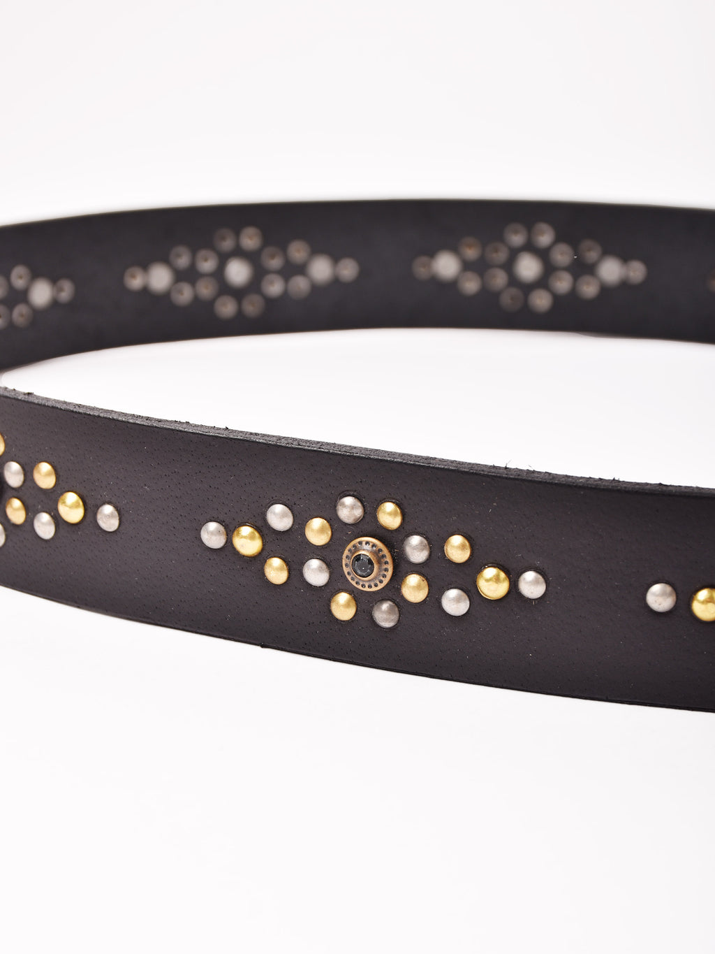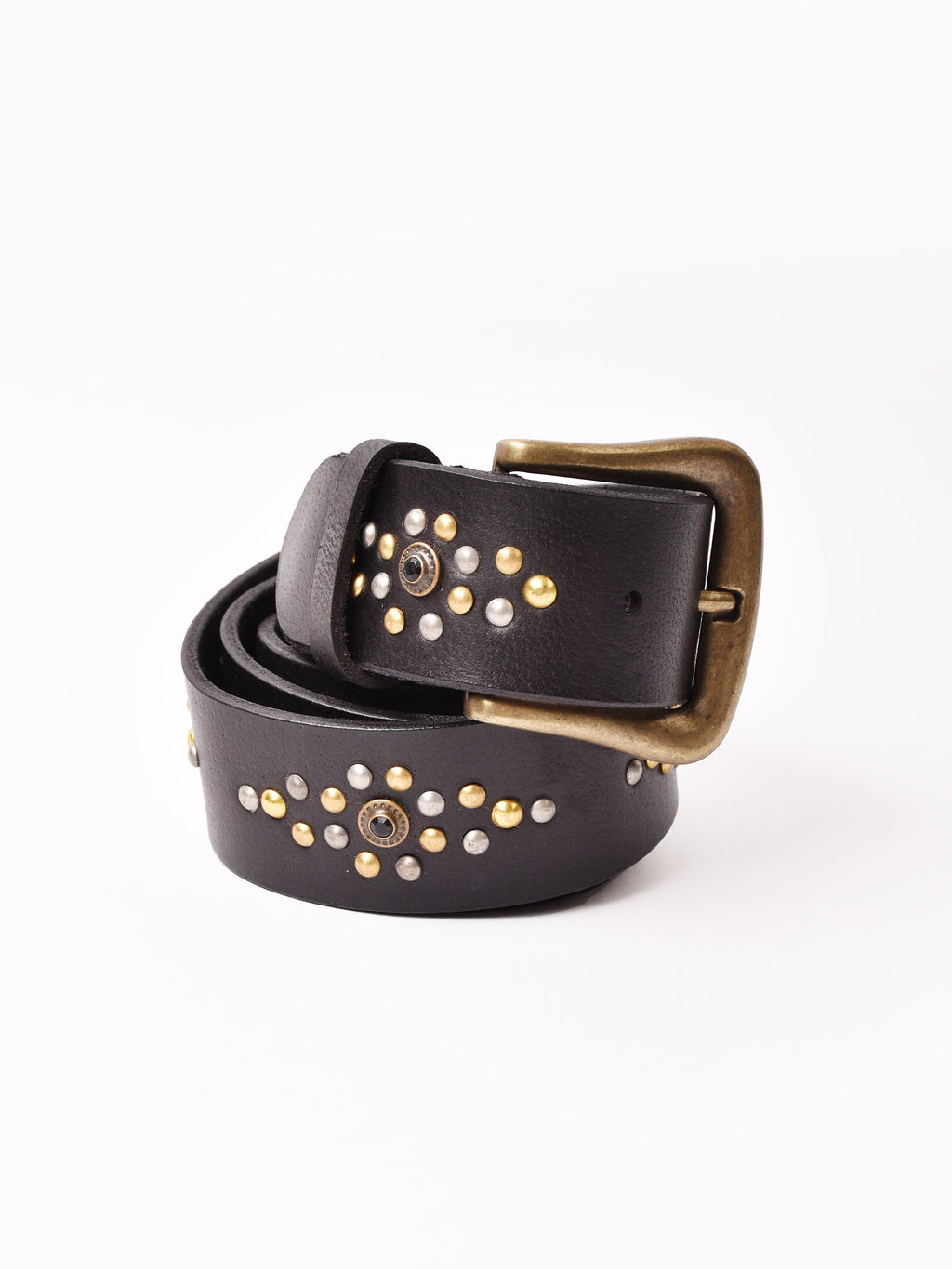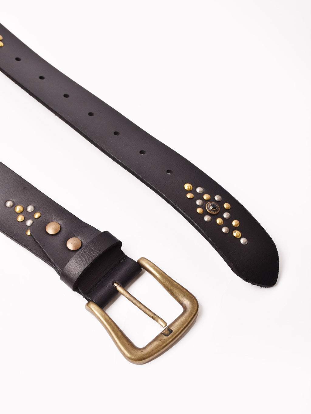 ブラックのストーンとスタッズをあしらったベルト。ヴィンテージライクなデザインで、エッジの効いたスタイリングに仕上げてくれる一点です。