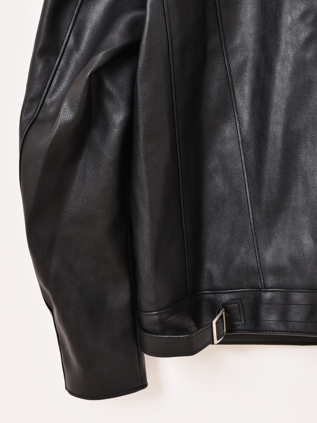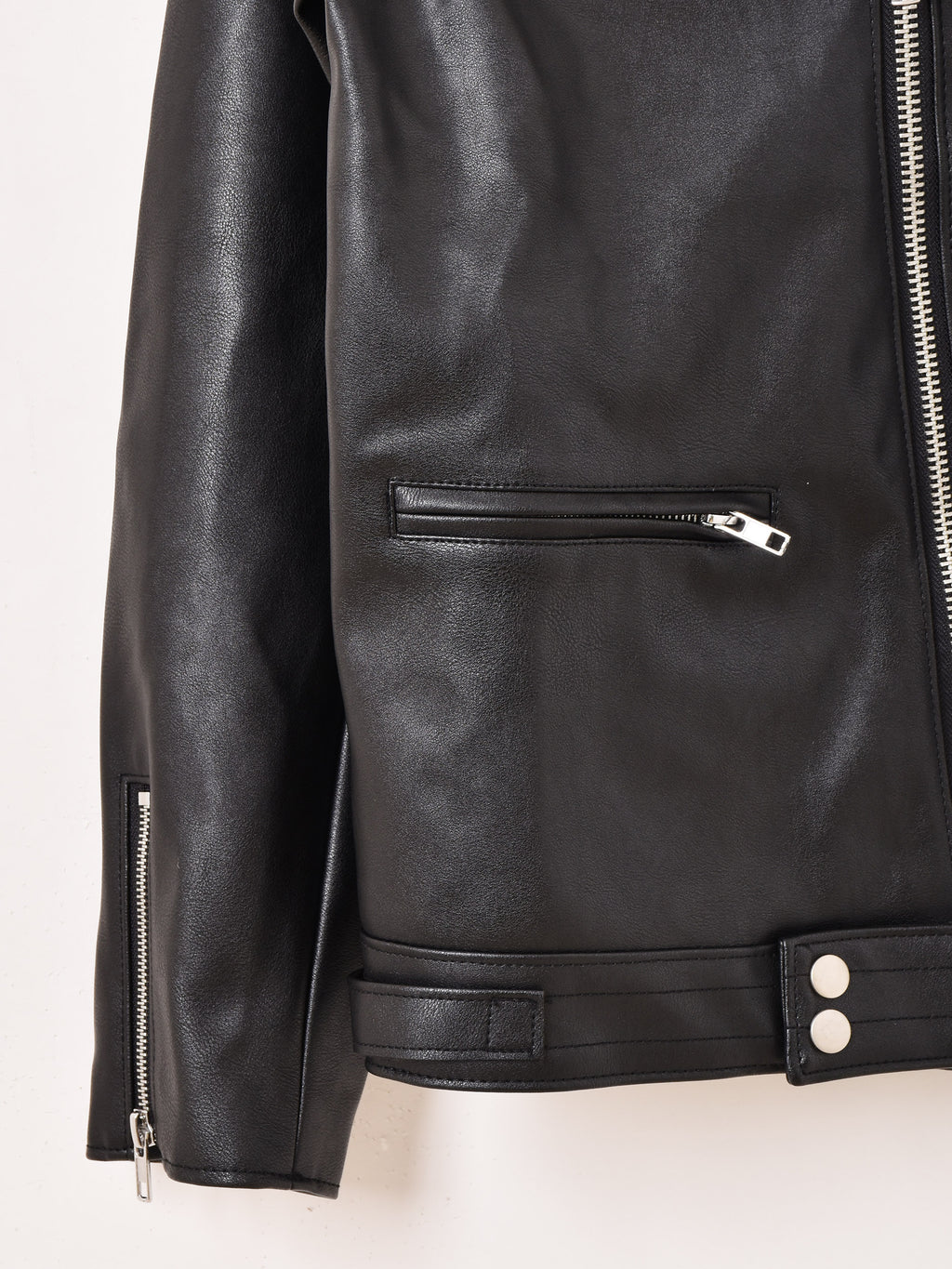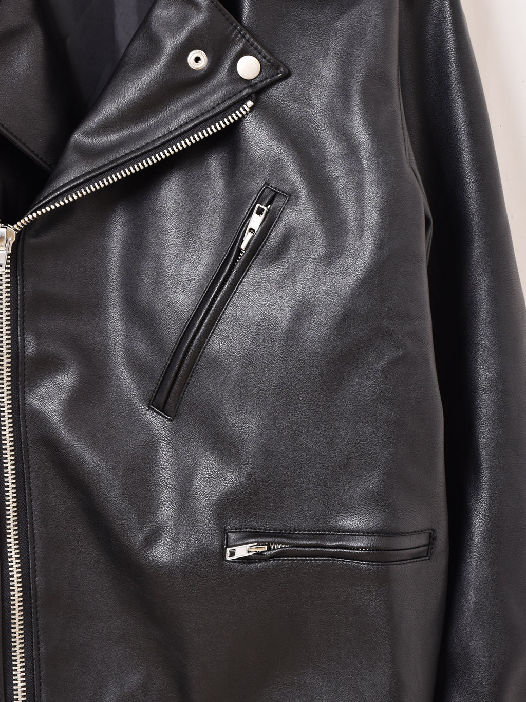 ロンジャン仕様のダブルライダーズジャケット。ミニマムでスタイリッシュなロンジャンのデザインを再現した一着です。比較的柔らかなフェイクレザー生地で仕立てているので、肌当たりよく着用できます。