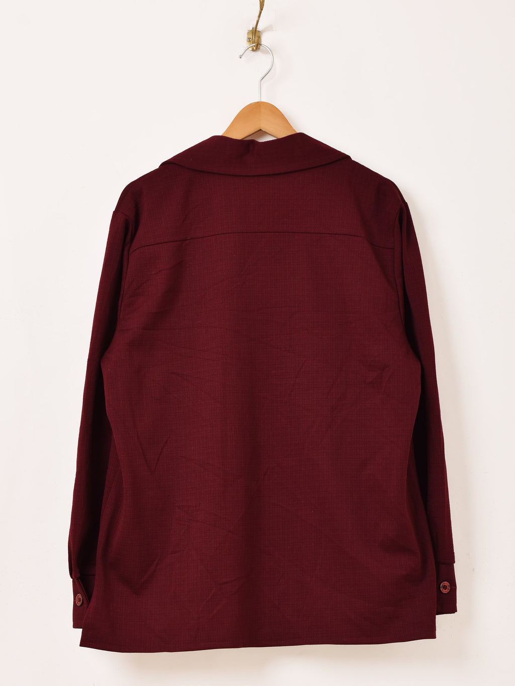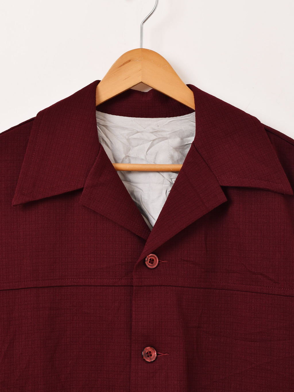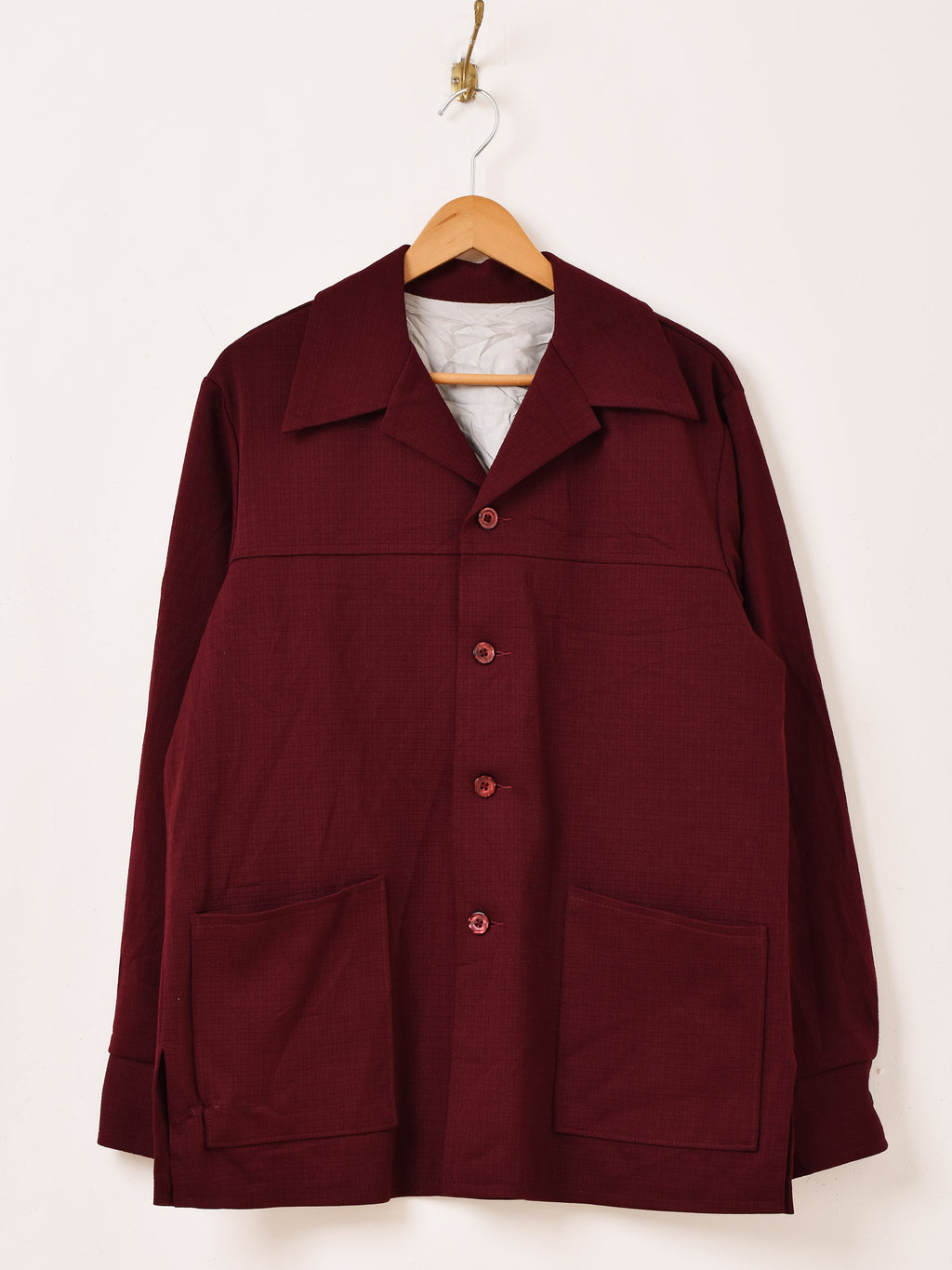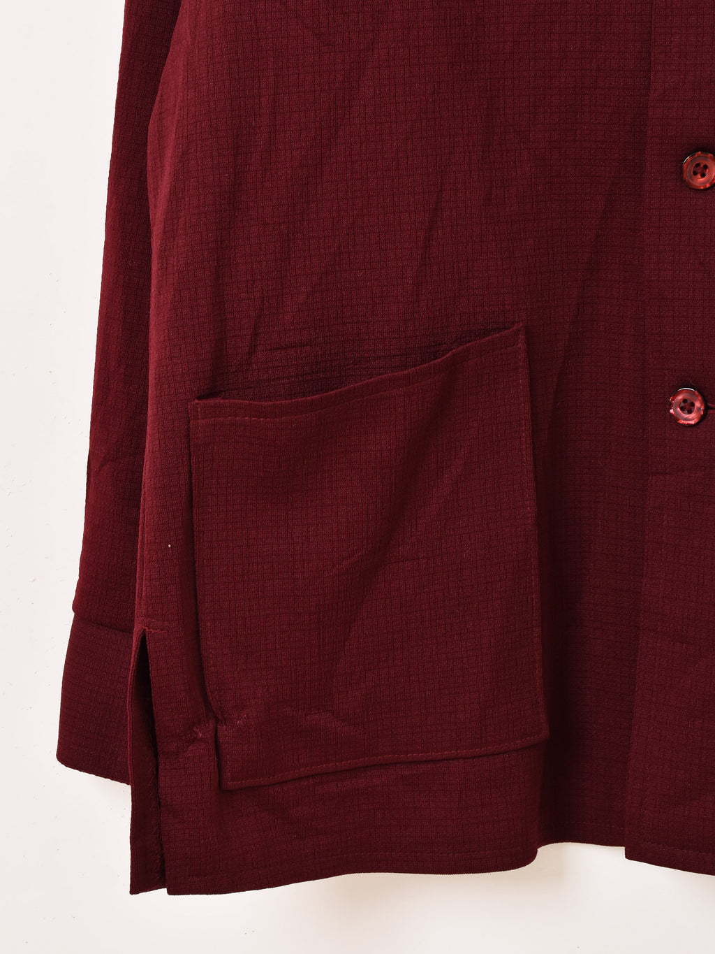 すっきりとした開襟スタイルに、フロントのダブルポケットが印象的なジャケット。ワインレッドの濃い色味が目を惹きます。比較的薄手なので、インナージャケットとしても◎。