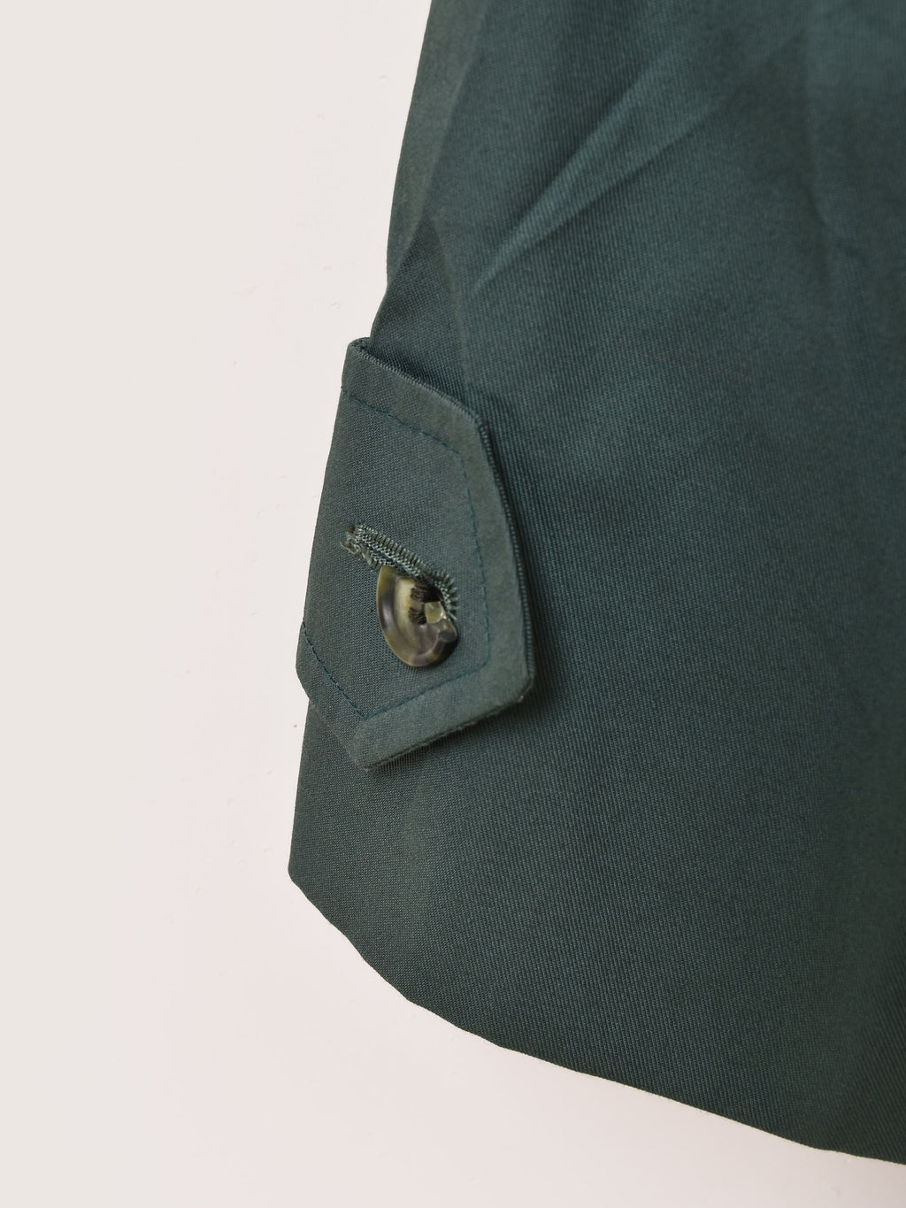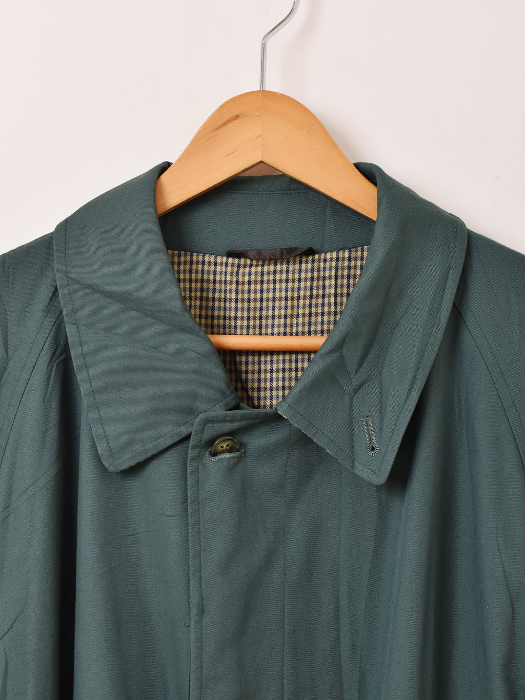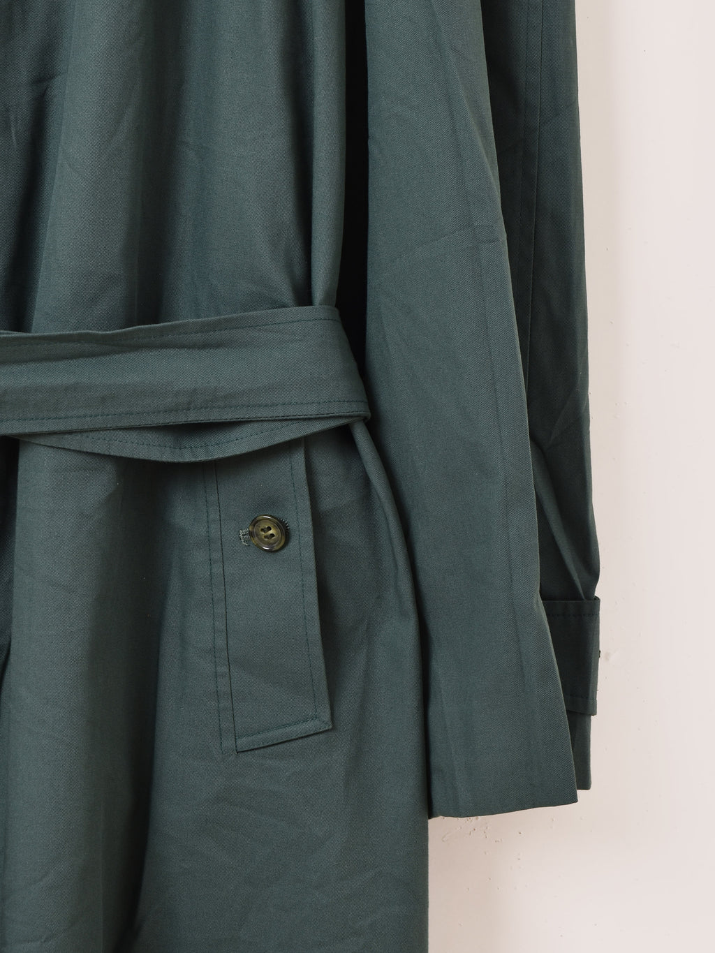深緑の落ち着いたカラーに、チェックのライニングがアクセントになったステンカラーコート。上品な印象に仕上げてくれる一着です。