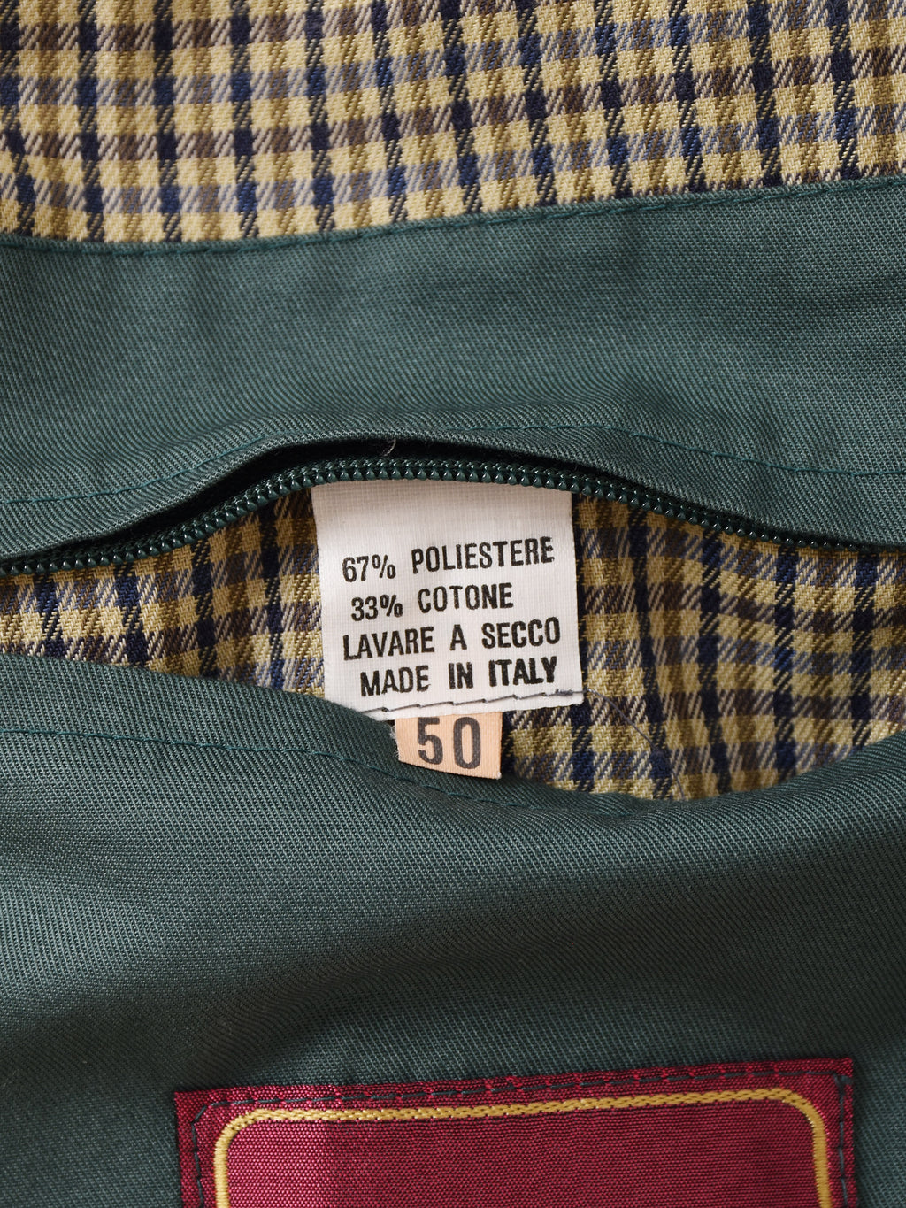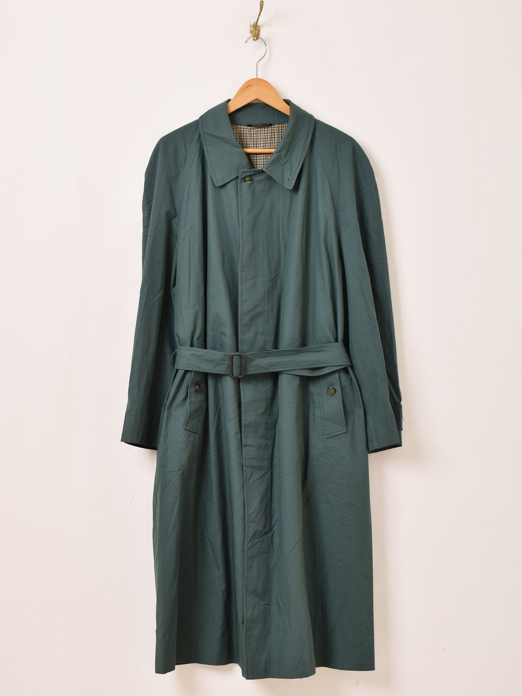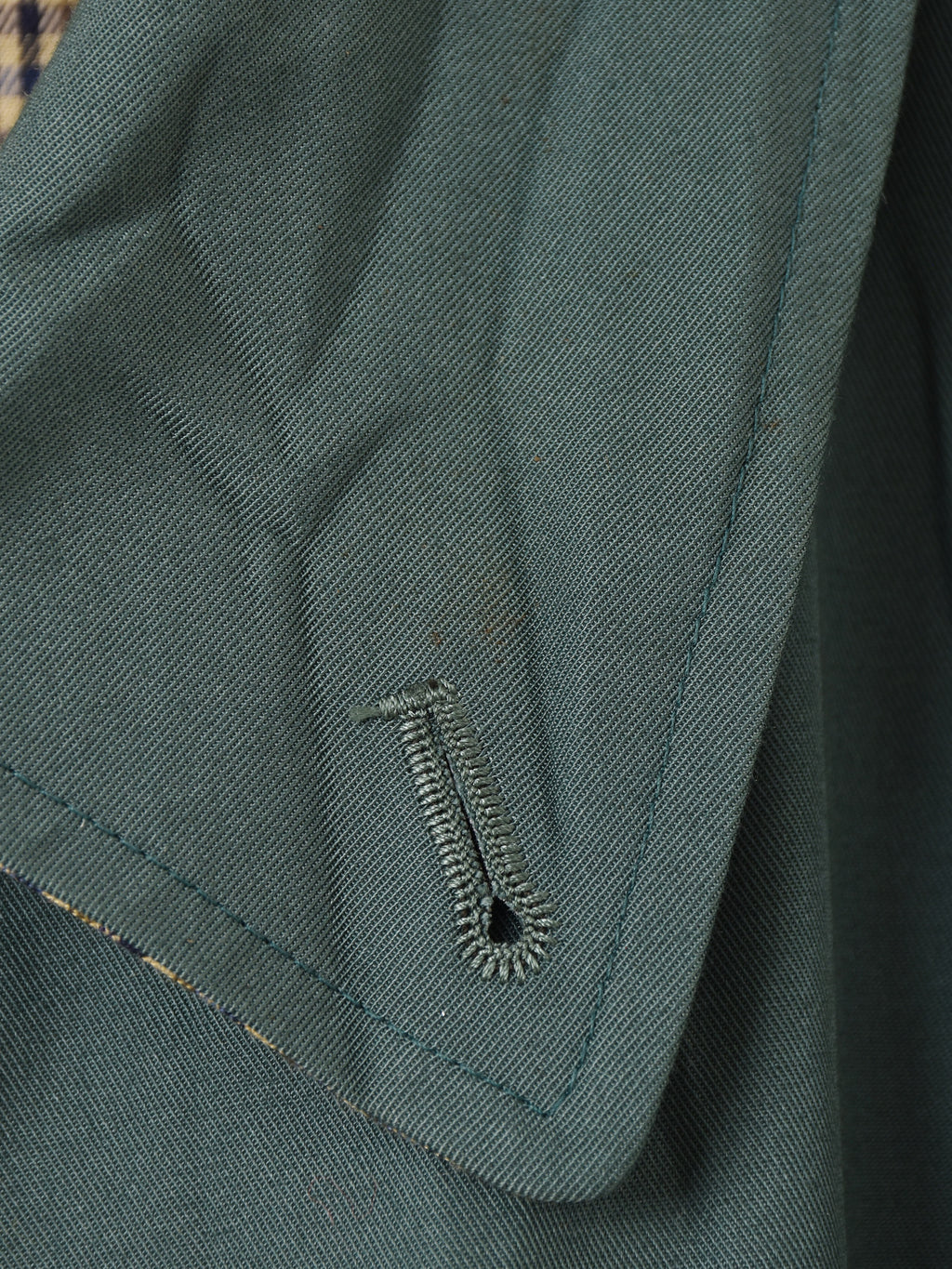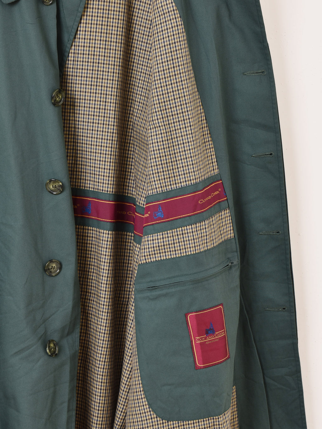 深緑の落ち着いたカラーに、チェックのライニングがアクセントになったステンカラーコート。上品な印象に仕上げてくれる一着です。