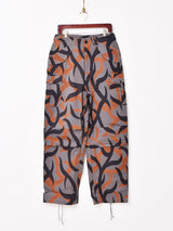 90年代にアメリカ軍で採用されたトライバルカモ、通称ASATを模したカーゴパンツです。個性的な三色迷彩とリップストップ仕様のようなハリのある生地感が特徴です。やや太めなシルエットなのでカジュアルなスタイリングにもおすすめです。