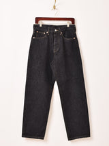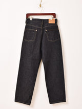 569型のブラックデニムパンツ。ゆったりめのストレートシルエットで取り入れやすい定番アイテムです。レザーパッチやブラックのタブなど、オリジナリティ溢れるディテールがポイント。しっかりとしたハリのある生地感です。