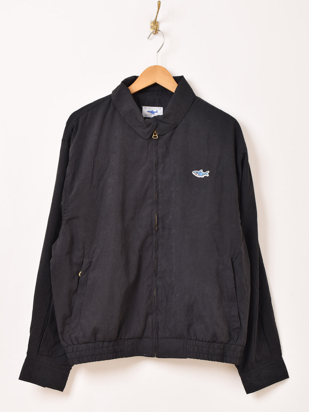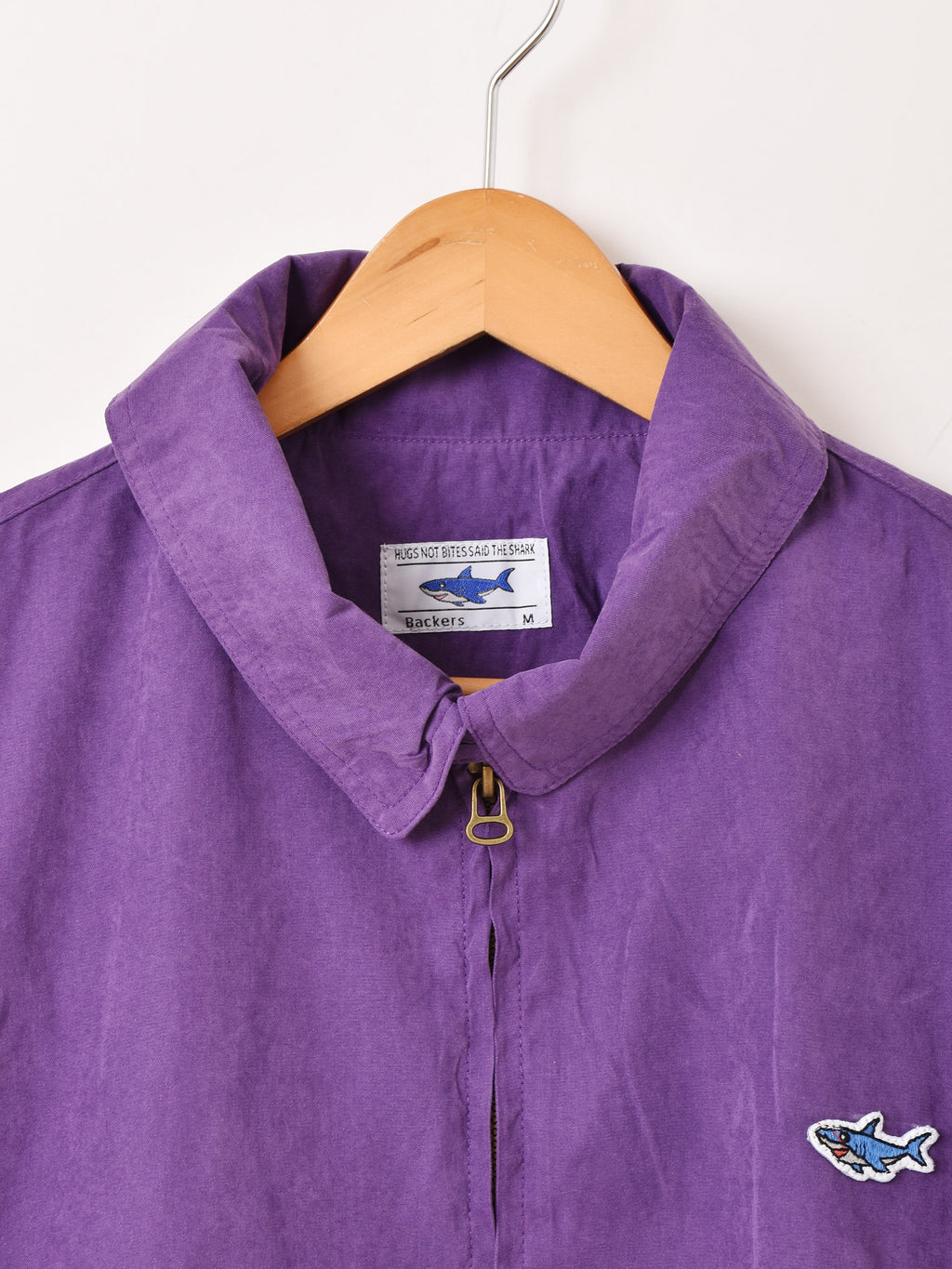 胸元にサメのワンポイントデザインをあしらったジップアップジャケット。軽く柔らかいピーチスキン素材で、着心地の良い一着。ヘビーなアウターの下に、インナージャケットとして着るのもおすすめです。
