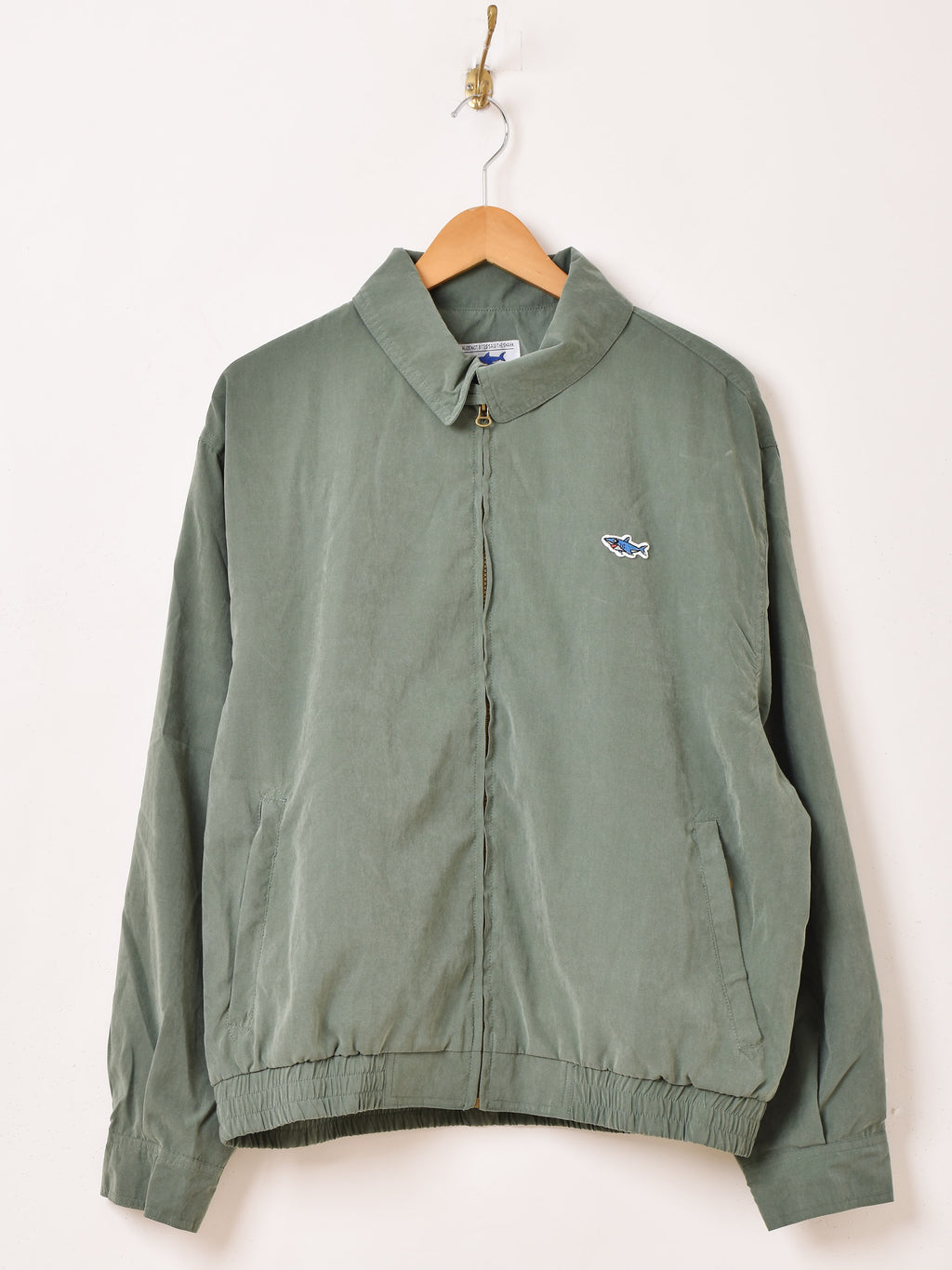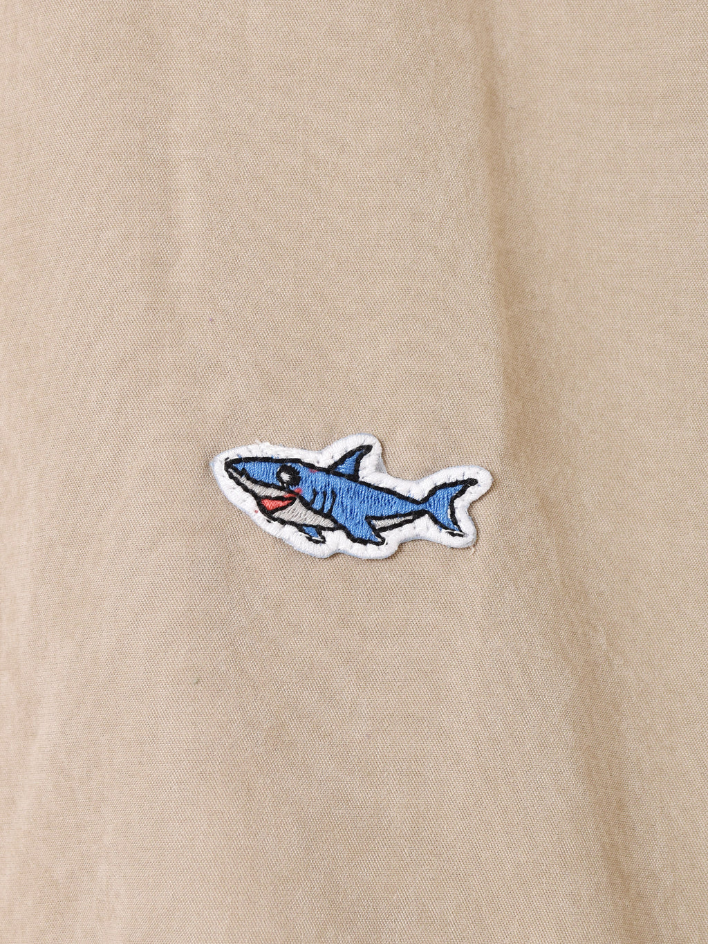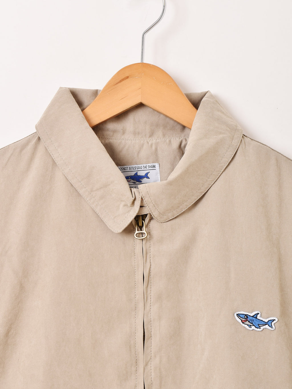胸元にサメのワンポイントデザインをあしらったジップアップジャケット。軽く柔らかいピーチスキン素材で、着心地の良い一着。ヘビーなアウターの下に、インナージャケットとして着るのもおすすめです。