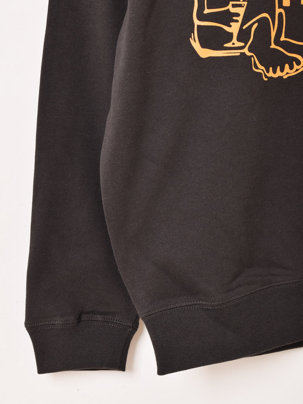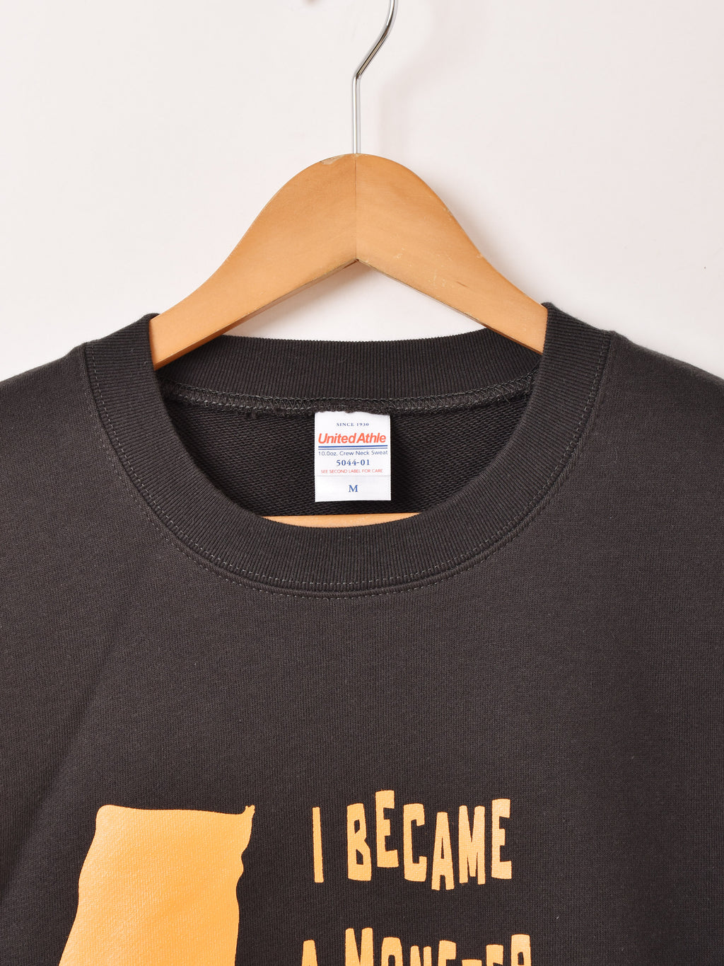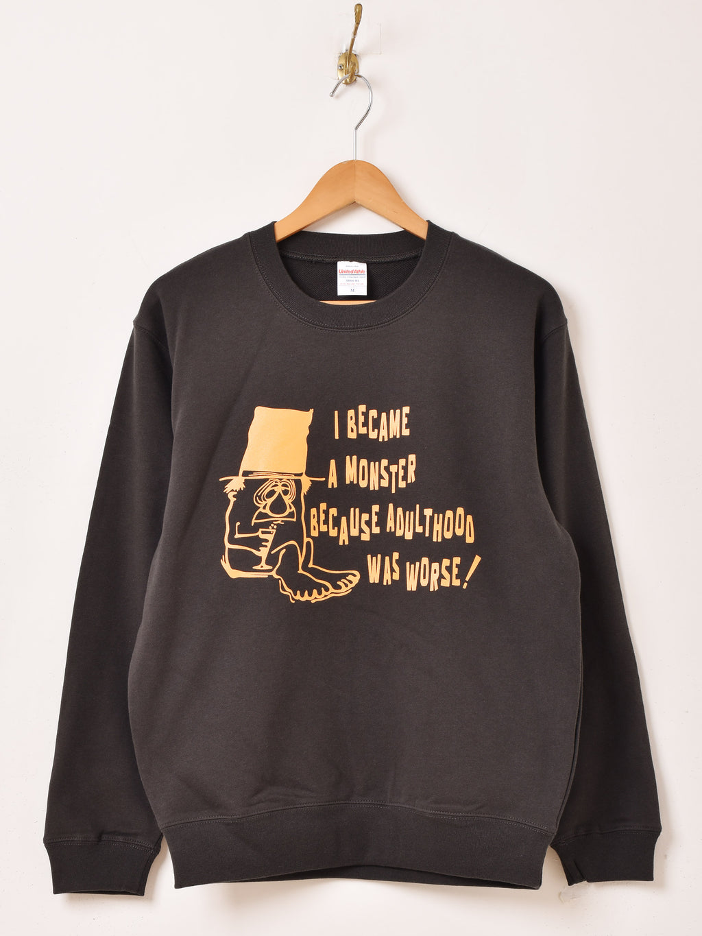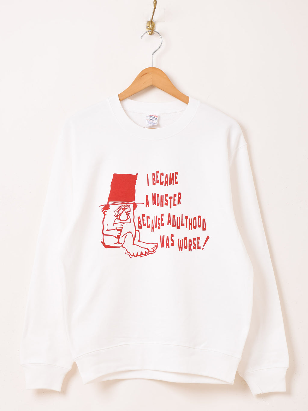 シュールなモンスターのキャラクターがプリントされたスウェット。程よい厚みで裏起毛はありません。