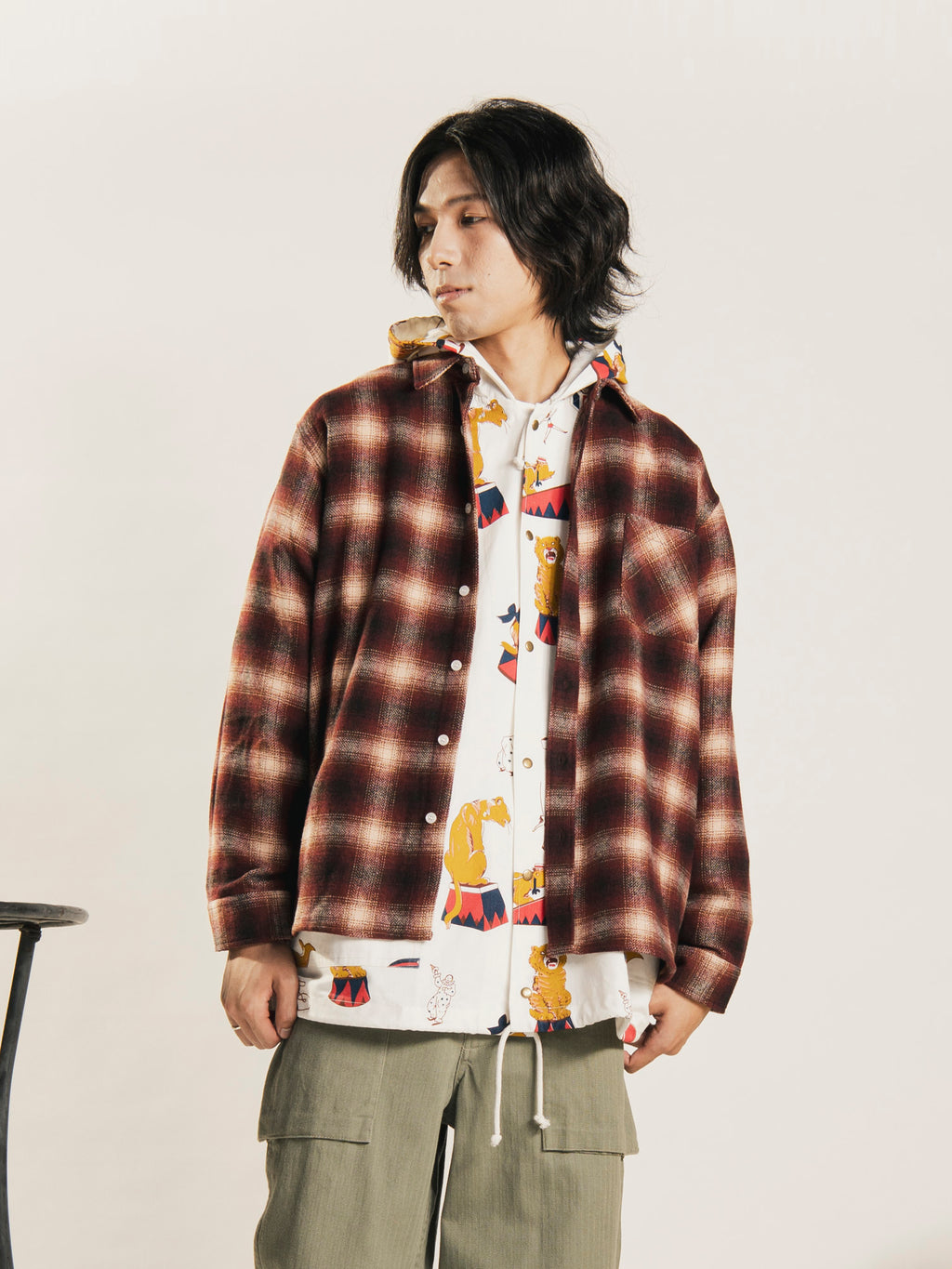 配色に雰囲気のあるシャドウチェックの長袖シャツ。ポリエステルとウールの混紡素材で仕立てており、あたたかく秋冬らしい一着。ネルシャツのようなふんわりと厚みのある生地感です。