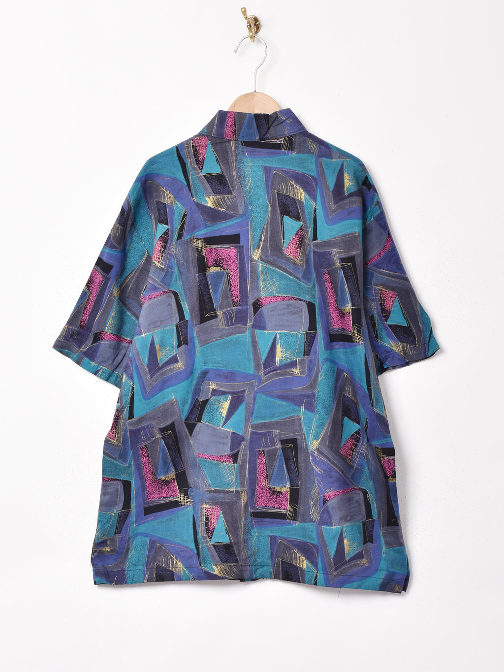 個性的な柄が古着らしい半袖シャツ。襟にはカラーキーパーが入っていて、綺麗な形を維持できるのも嬉しいポイント。涼し気な薄手のレーヨン素材です。