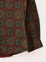 渋めカラーのオリエンタル風な柄に猫目ボタンが洒落ている総柄シャツ。