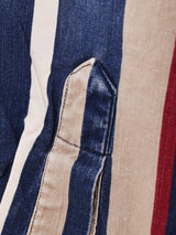 ベージュ×ネイビー×ワインレッドの配色が目を惹く長袖のストライプシャツ。しっかりとしたコットン生地です。