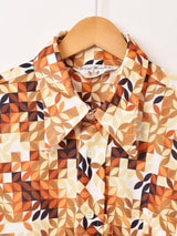 おそらく70年代頃のものと思われるMaison Briar Houseの柄シャツ。四角いボタンが特徴的で、リーフ柄のような幾何学模様が目を惹きます。おそらくポリエステルの、やや厚手のつるりとした生地です。