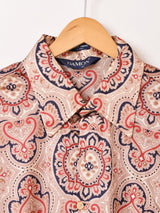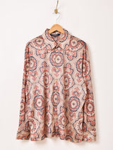 光沢のあるナイロン生地にエスニックな総柄が目を惹くデーモンの柄シャツ。コーディネートのアクセントに人と差が付く一着です。やや透け感のあるつるりとした生地です。
