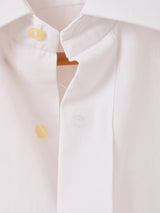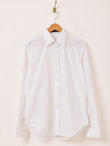 シンプルなホワイトの長袖シャツ。ボタンが隠れる比翼仕立てです。様々なシーンで着回せます。