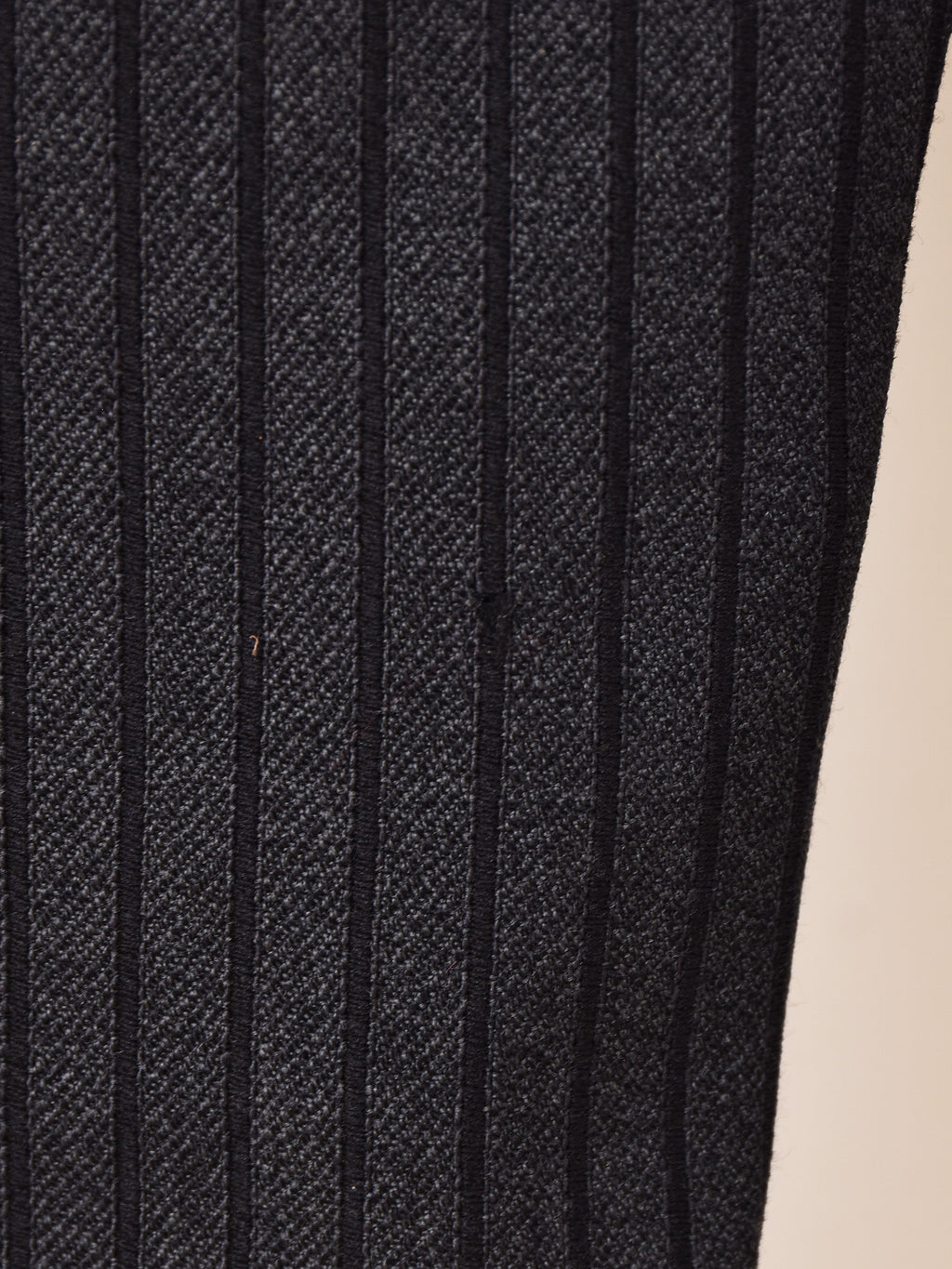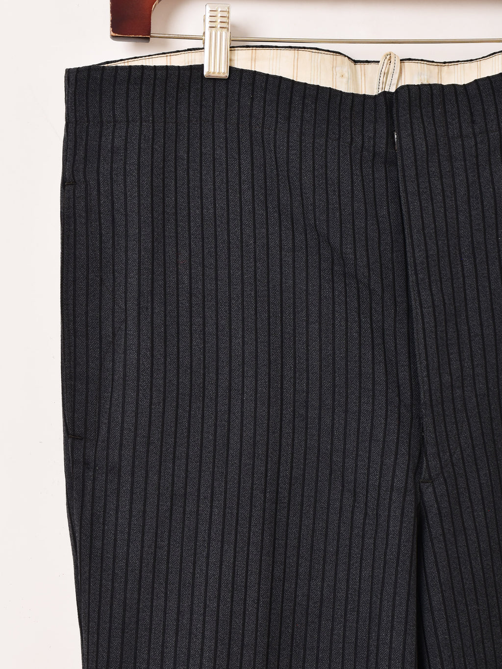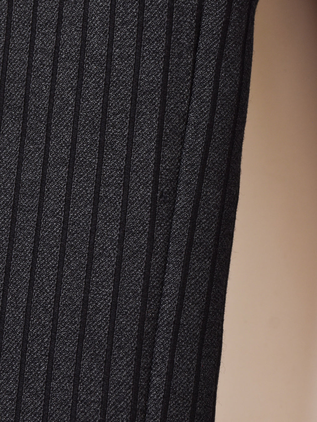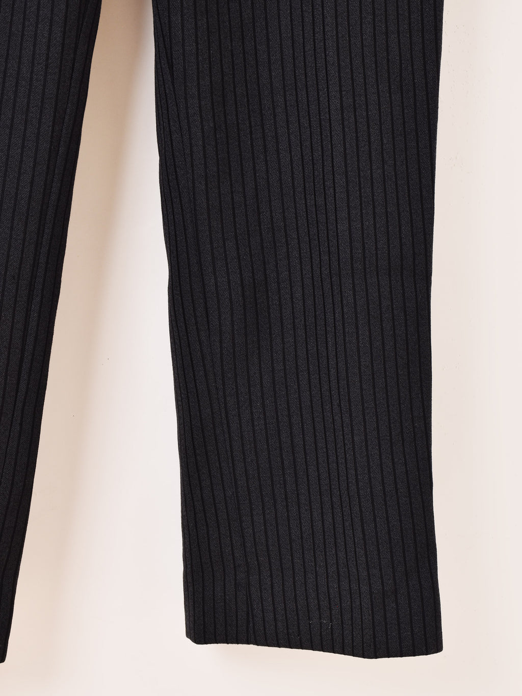 シンプルなブラックストライプが上品な雰囲気のトラウザーパンツ。センタープレス入りに、ストンと落ちる細身のストレートシルエットが魅力的な一着です。