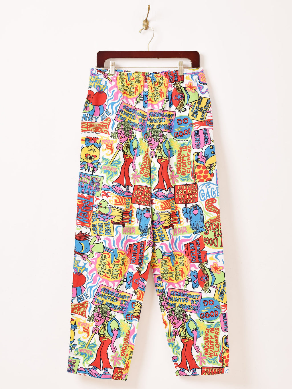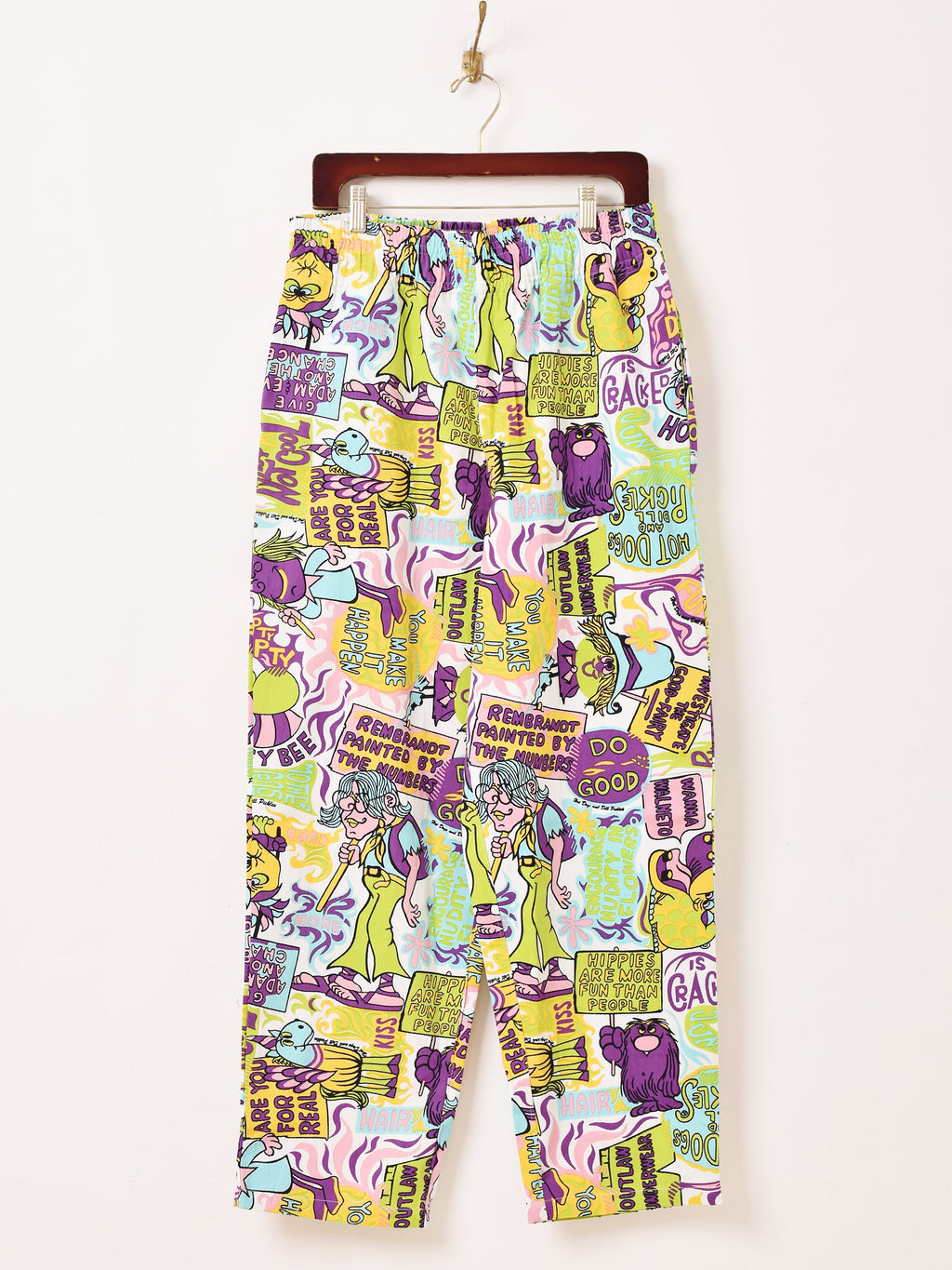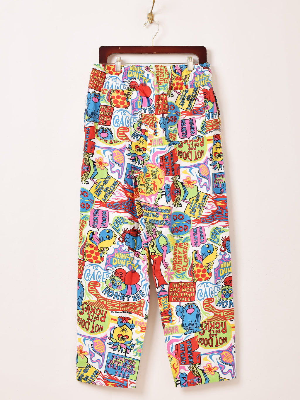 鮮やかな色味でアメコミキャラクターのようなポップなイラストやさまざまなワードが所狭しとプリントされたイージーロングパンツ。しっかりとしたコットン生地で、コーディネートの主役に目を惹く一着です。フリーサイズで着用いただけます。