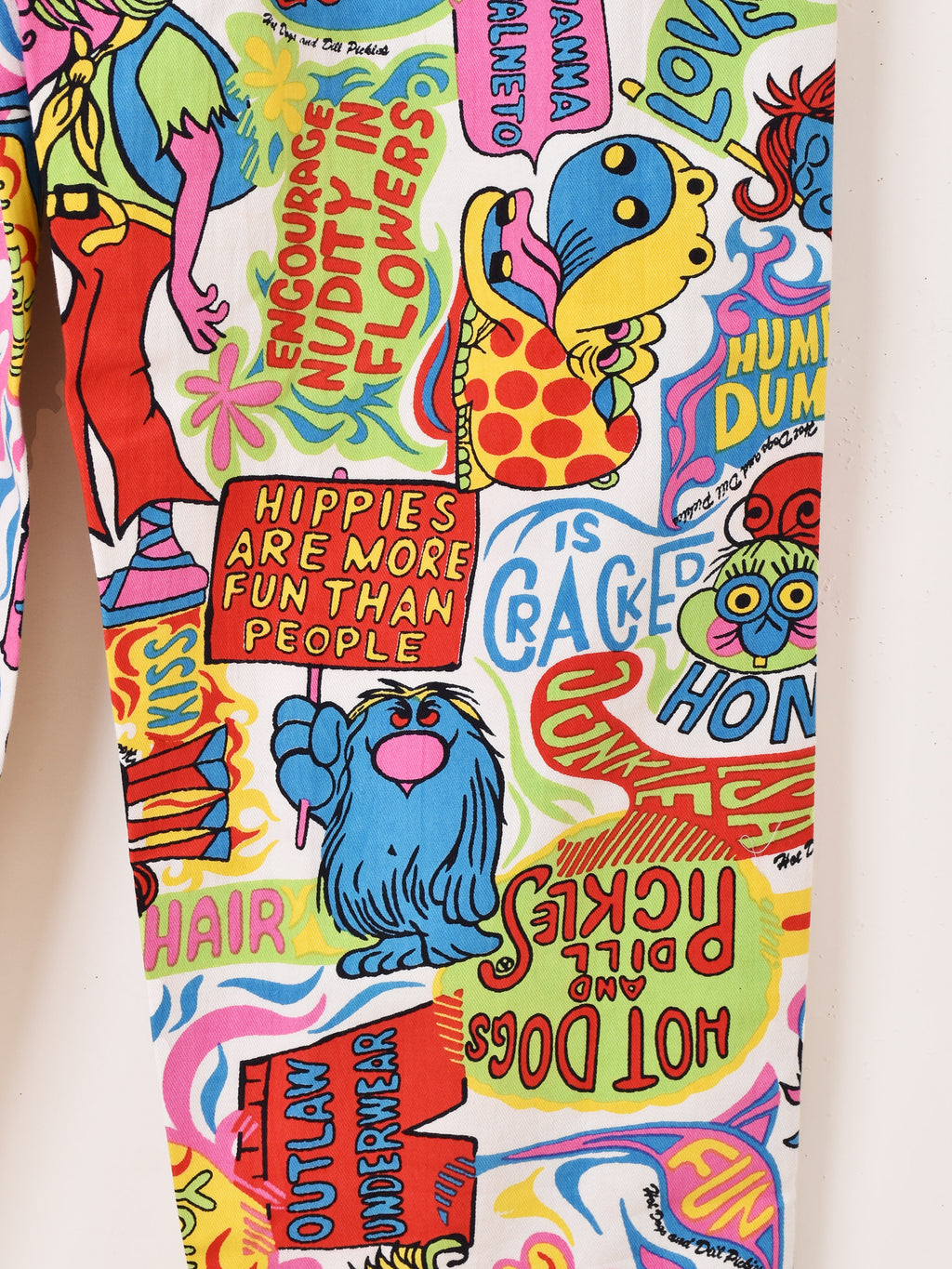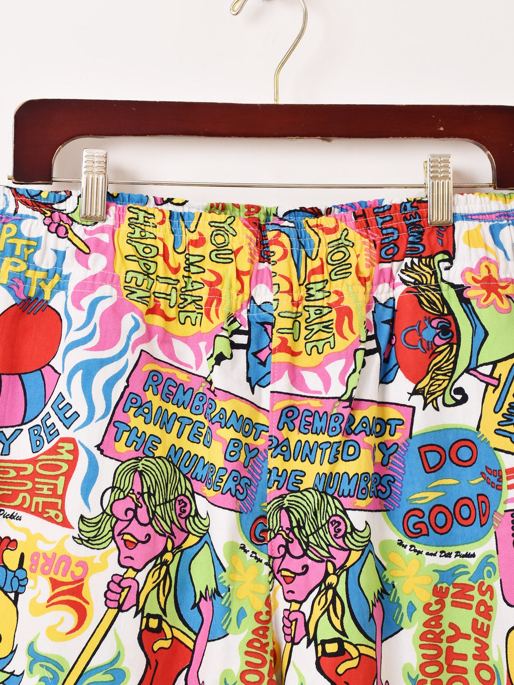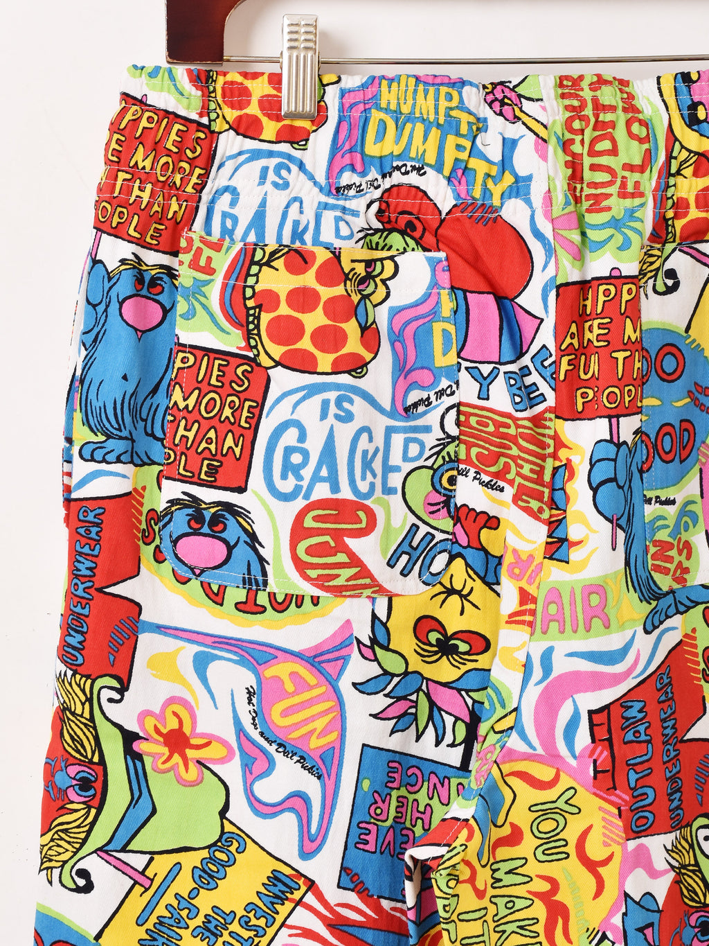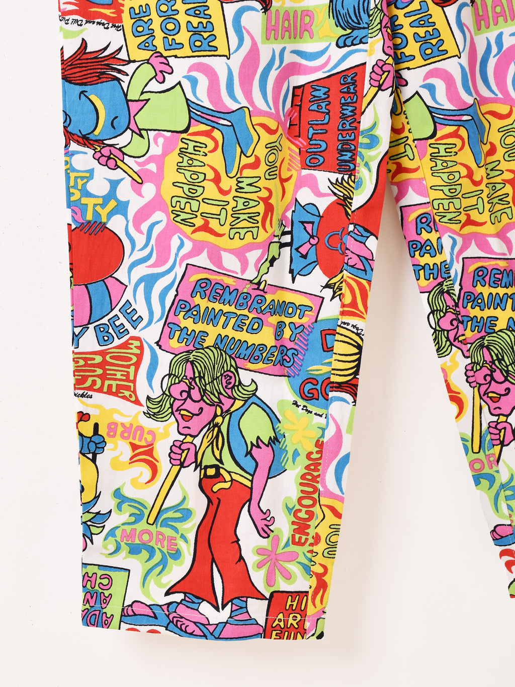 鮮やかな色味でアメコミキャラクターのようなポップなイラストやさまざまなワードが所狭しとプリントされたイージーロングパンツ。しっかりとしたコットン生地で、コーディネートの主役に目を惹く一着です。フリーサイズで着用いただけます。