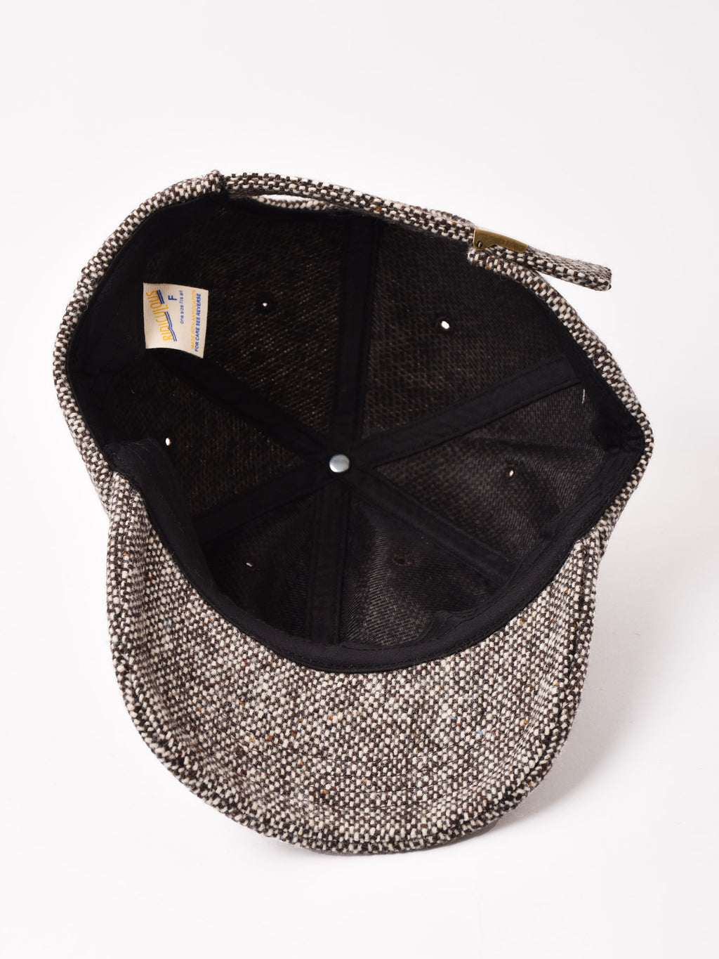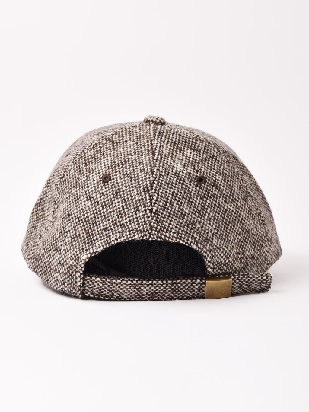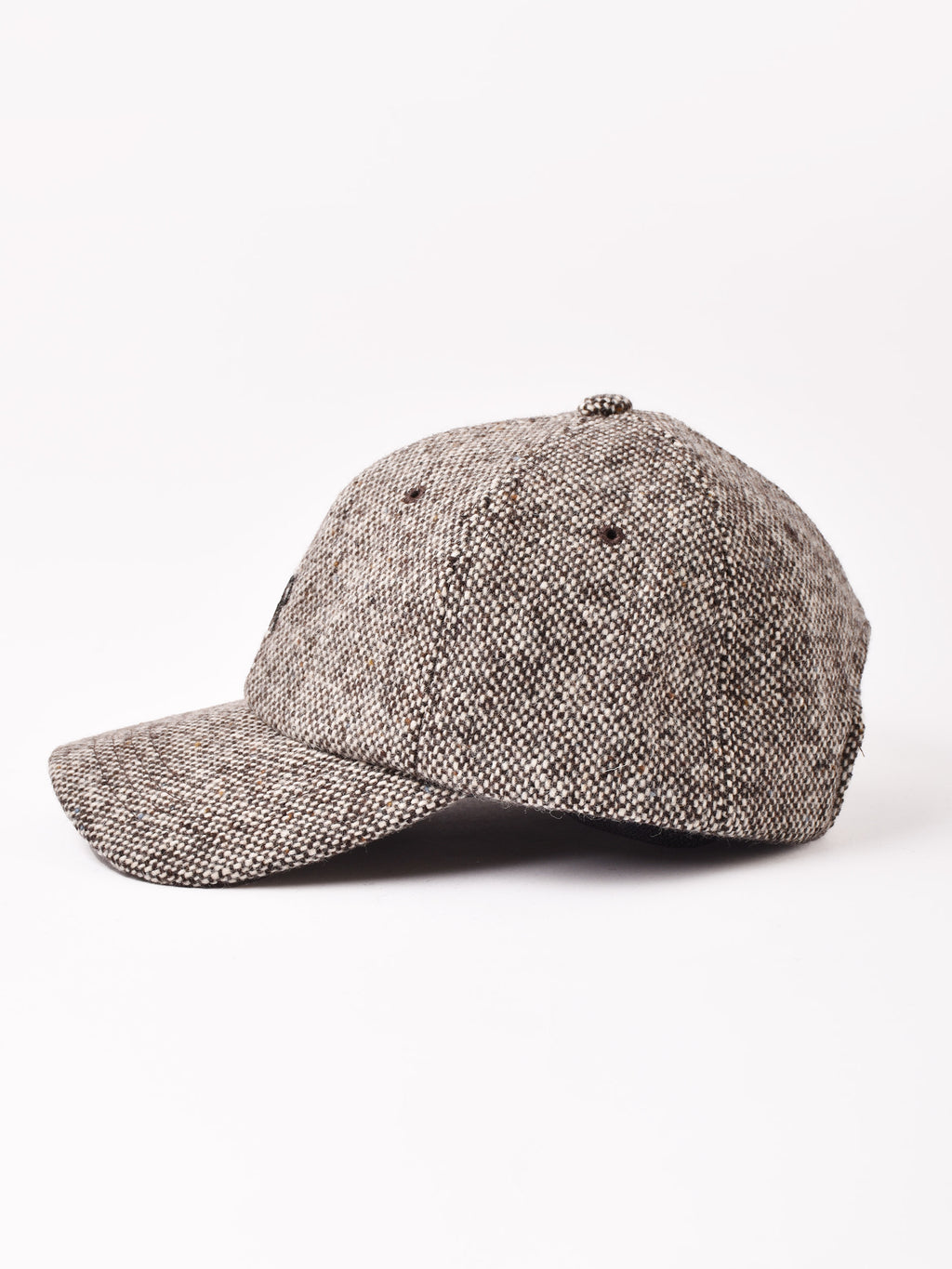 アルファベットの刺繍が入ったキャップ。ウール混の秋冬らしいテキスタイルを使用、こちらはカラーネップのツイード生地で仕立てました。