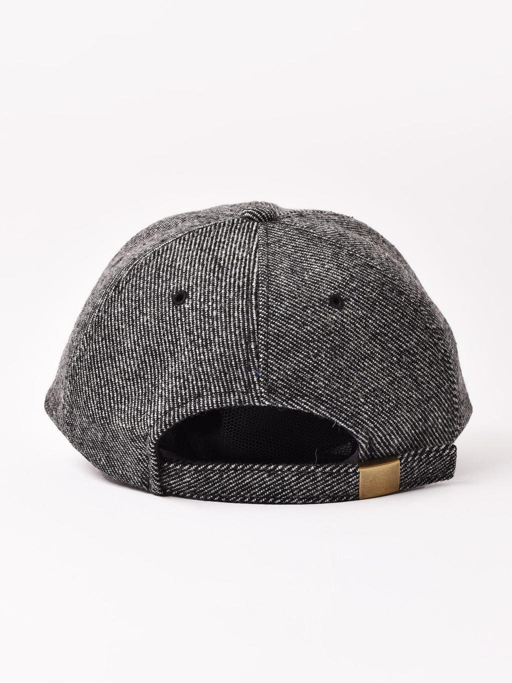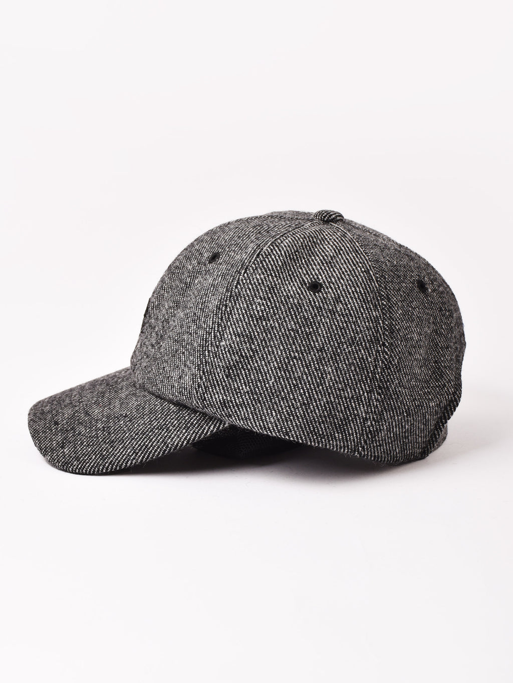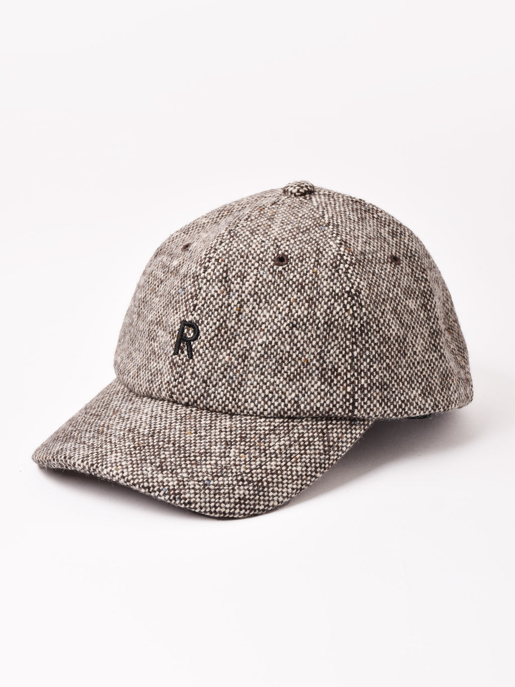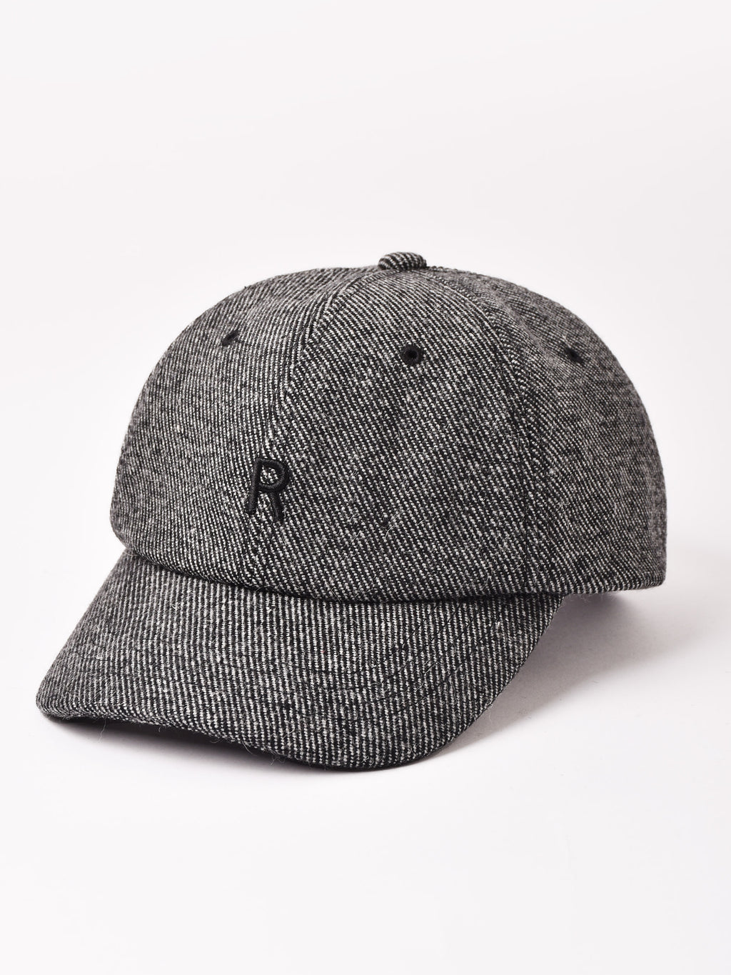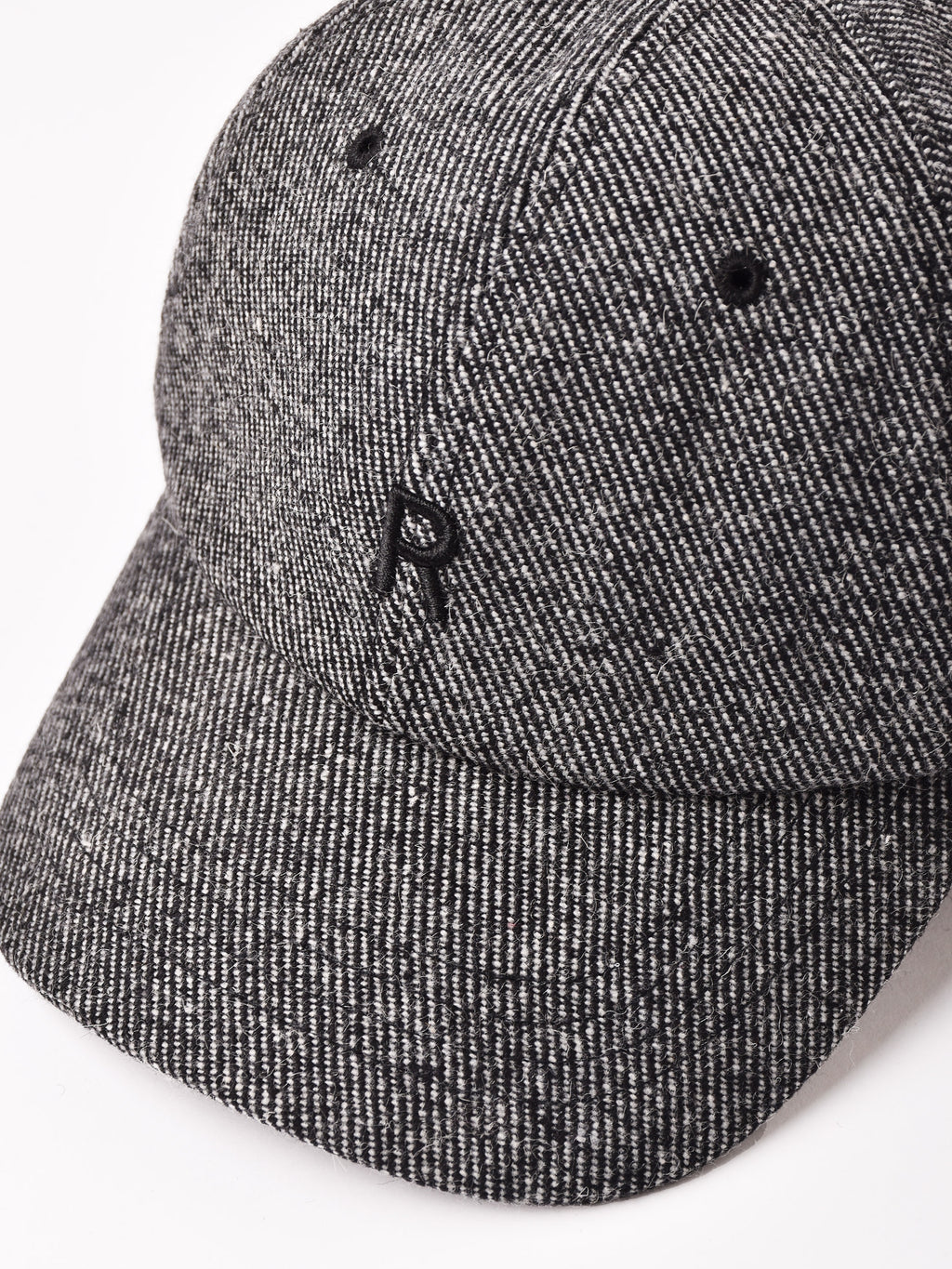 アルファベットの刺繍が入ったキャップ。ウール混の秋冬らしいテキスタイルを使用、こちらはシンプルなツイード生地で仕立てました。